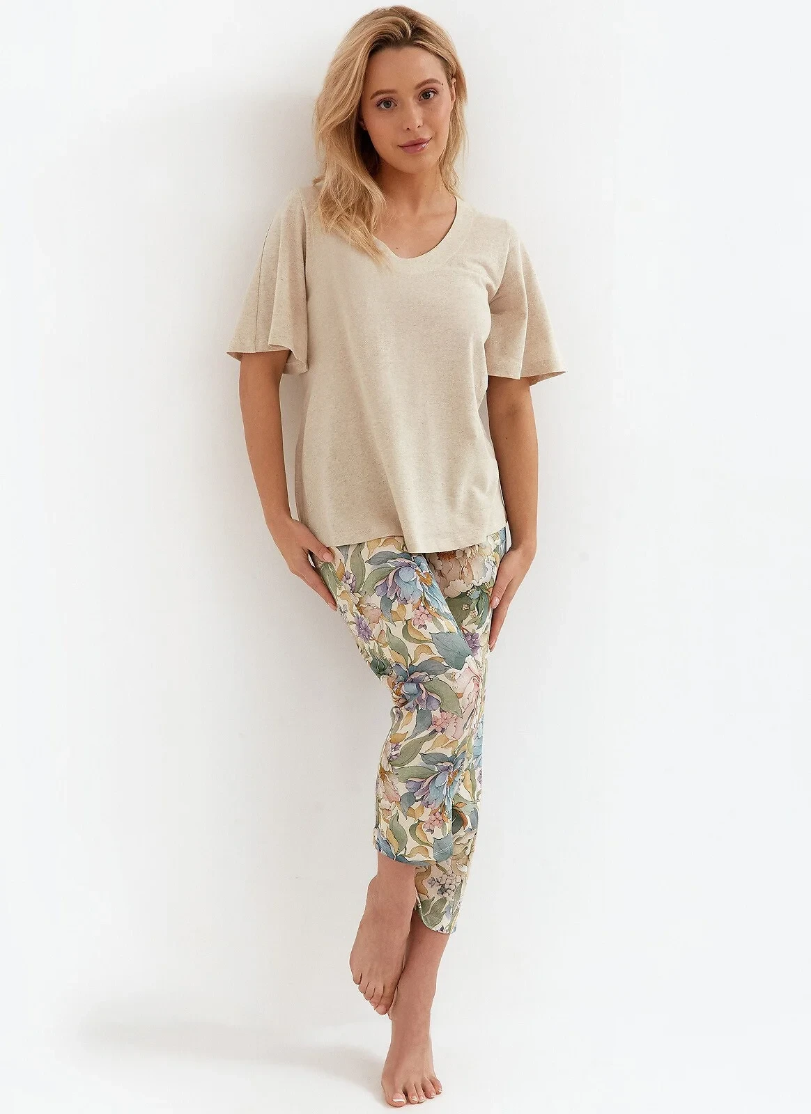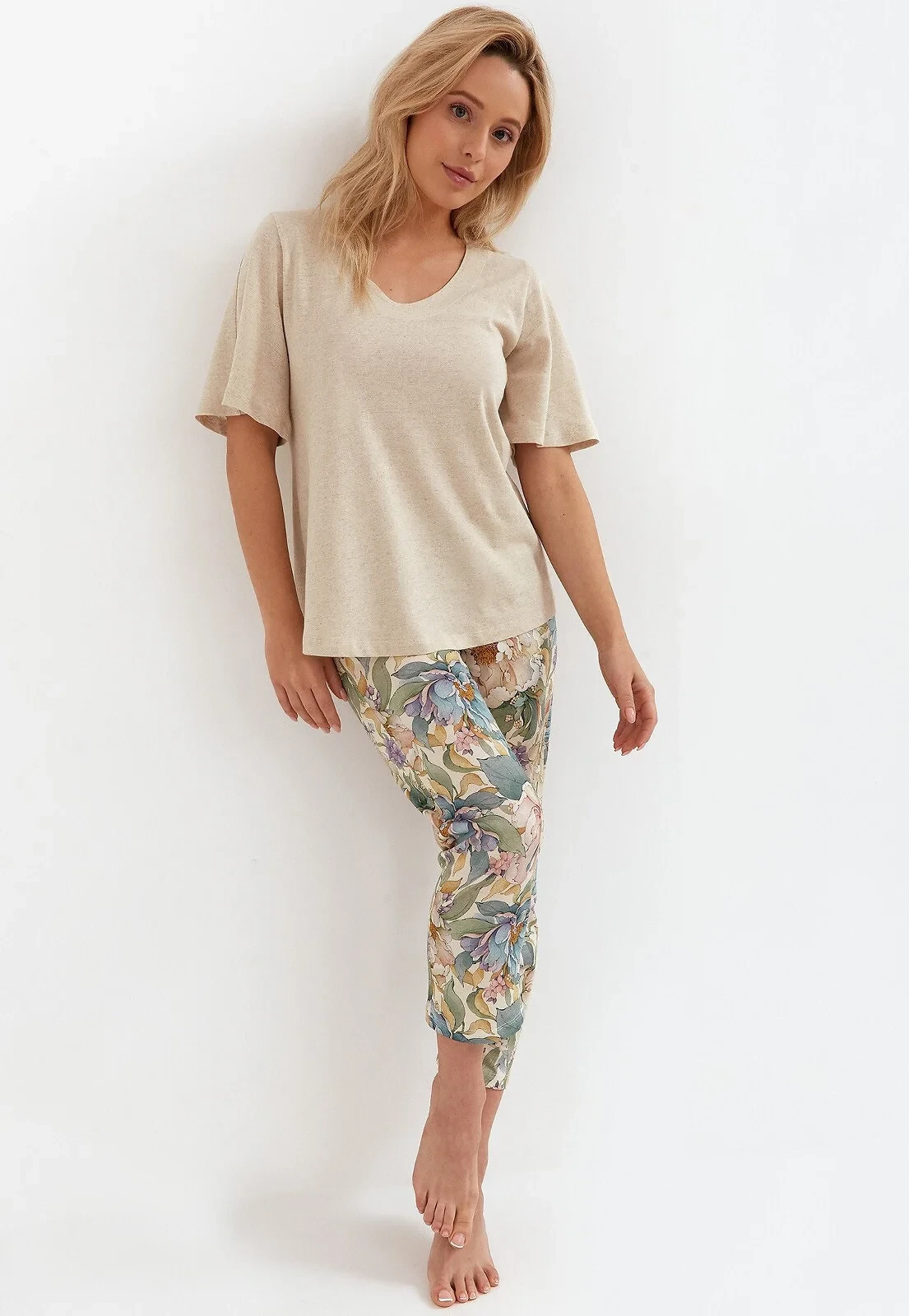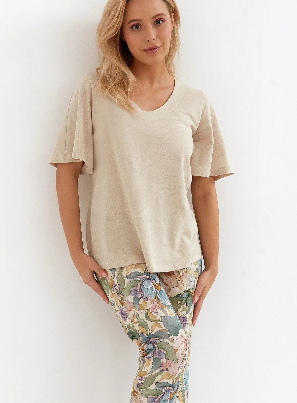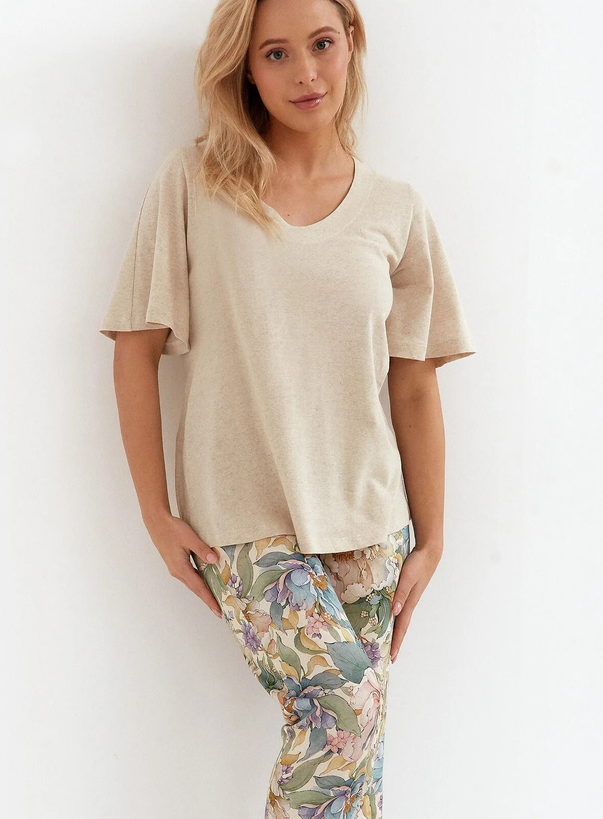 Složení: tričko - 75 % viskóza, 20 % len, 5 % elastan, kalhoty - 100 % bavlna