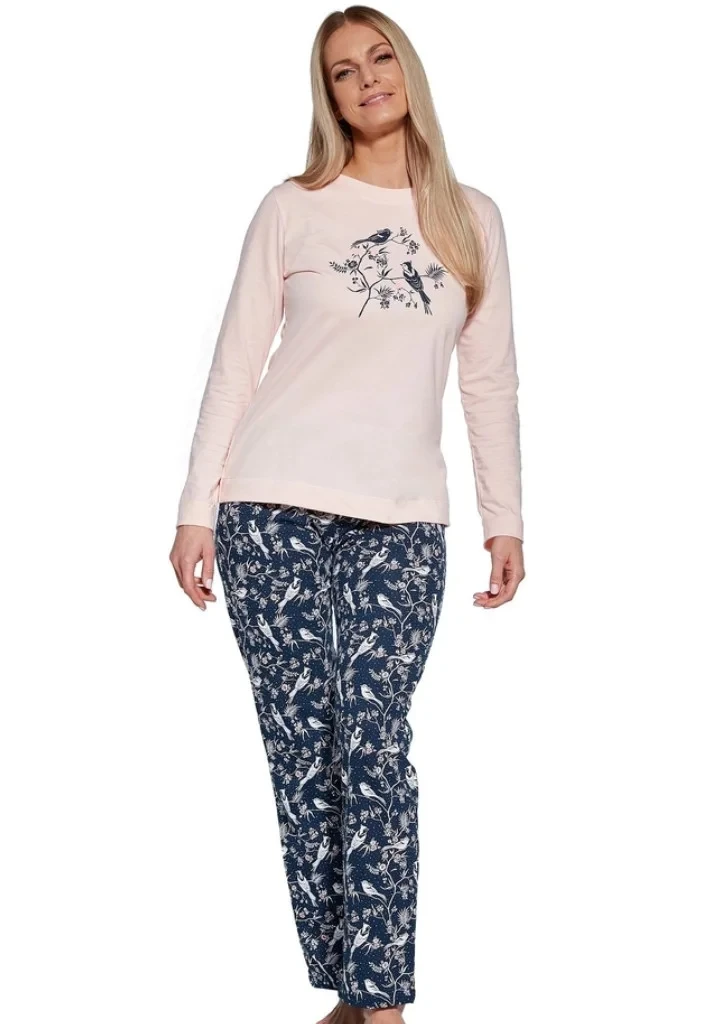 Dámské bavlněné pyžamo od značky Cornette. Pyžamo má tričko s dlouhým rukávem a dlouhé kalhoty. V pase je měkká, široká guma. Na rukávech i na nohavicích je pohodlný úplet.