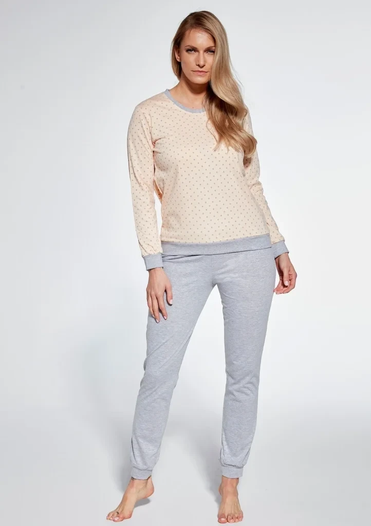 Dámské bavlněné pyžamo od značky Cornette. Pyžamo má tričko s dlouhým rukávem a dlouhé kalhoty. V pase je měkká, široká guma. Na rukávech i na nohavicích je pohodlný úplet.