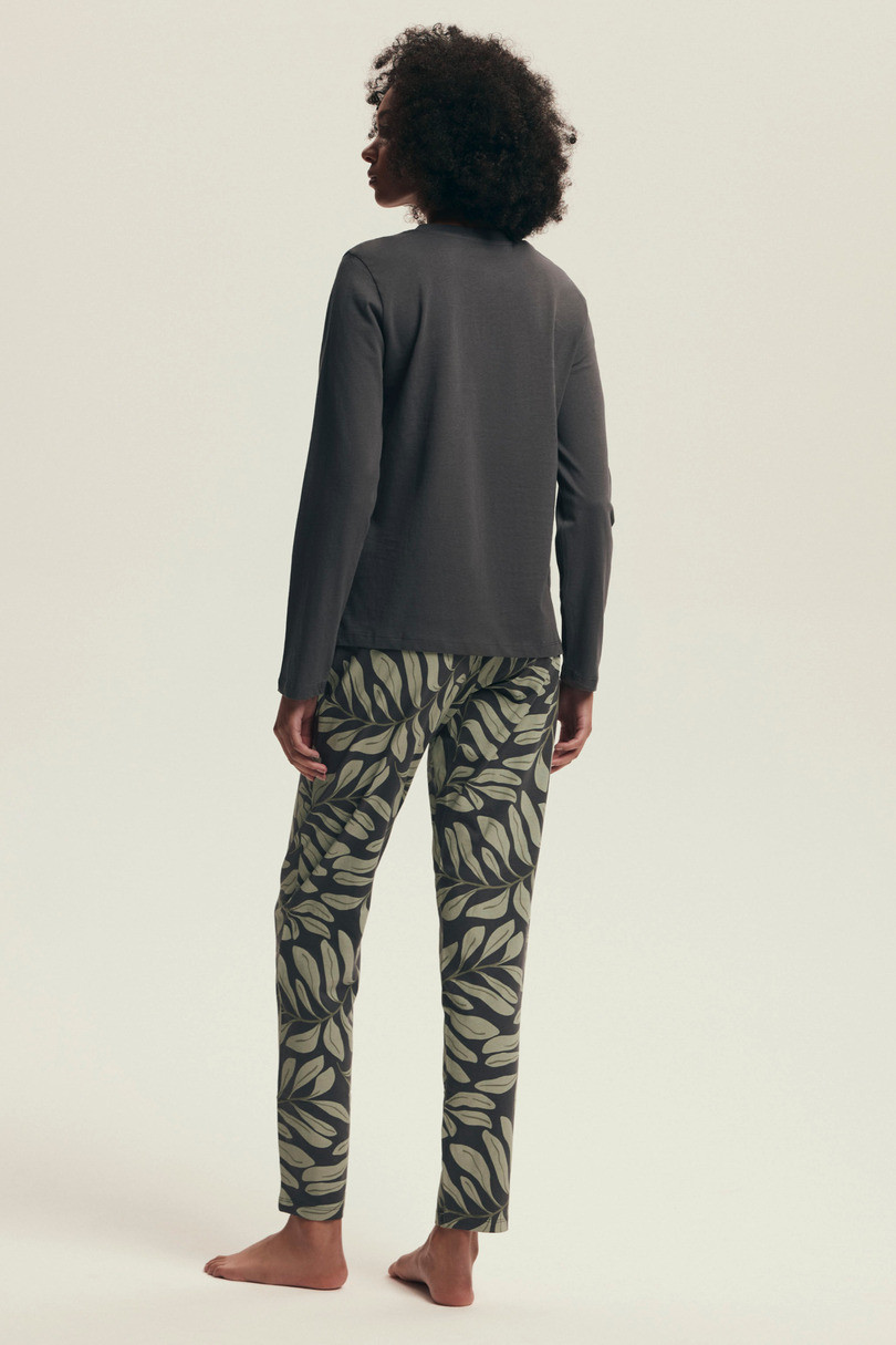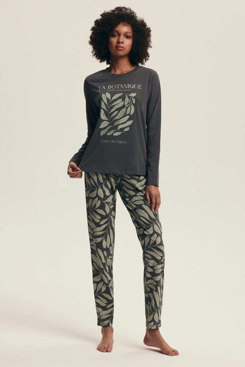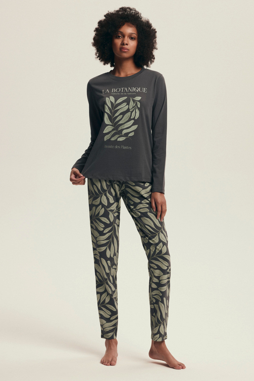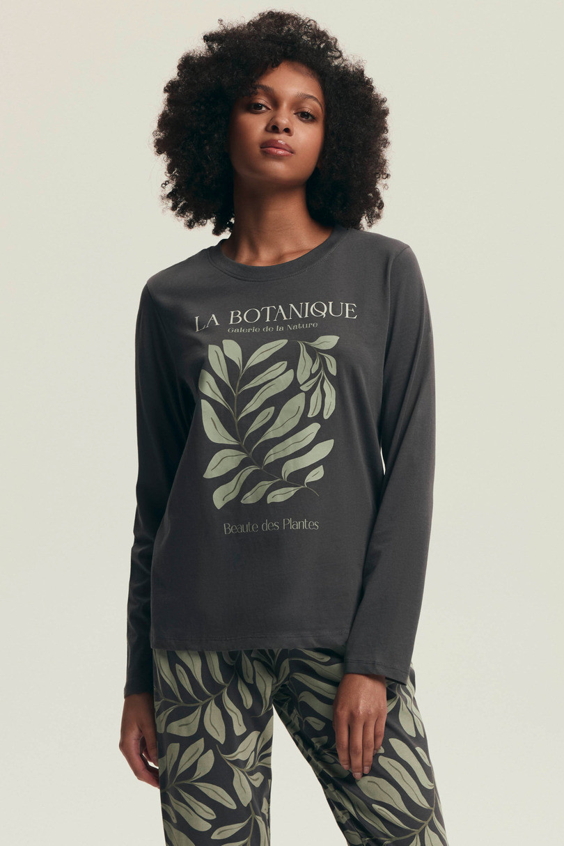 Bluzka z długim rękawem ozdobiona jest botanicznym nadrukiem z napisem „La Botanique – Beauté des Plantes”, który harmonijnie nawiązuje do roślinnych printów na spodniach. Długie spodnie z elastycznym pasem i wygodnym fasonem zapewniają maksymalną swobodę ruchów i dopasowanie bez ucisku.