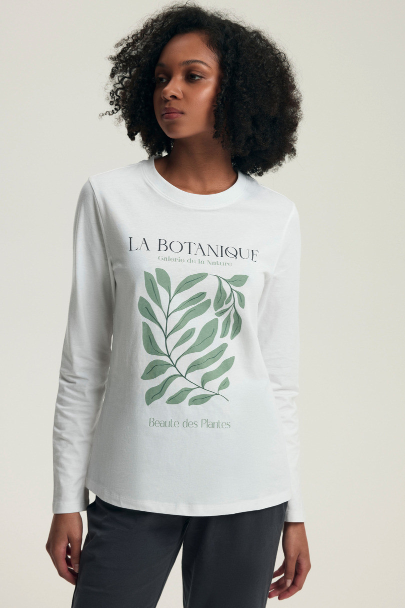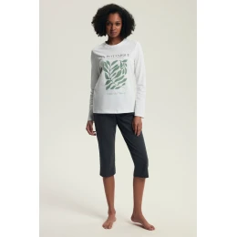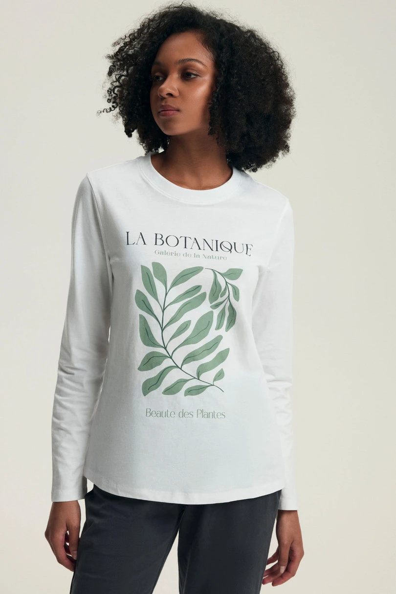 Górę zestawu stanowi bluzka z długim rękawem ozdobiona botanicznym nadrukiem „La Botanique – Beauté des Plantes”, który podkreśla harmonię z przyrodą. Spodnie o długości 3/4 w gładkim, grafitowym kolorze posiadają luźny krój i elastyczny pas, dzięki czemu idealnie dopasowują się do sylwetki, nie uciskając.