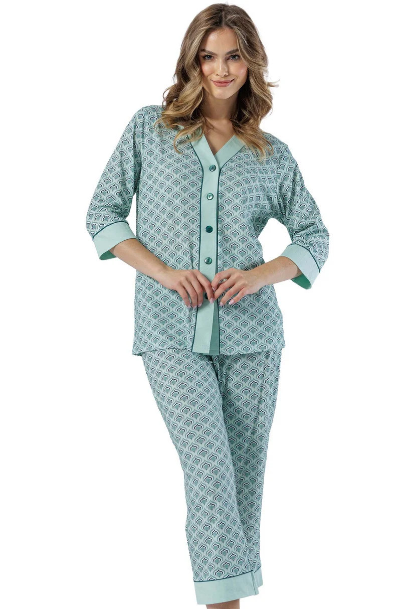 Klasické dámské pyžamo s 3/4 rukávy a 7/8 nohavicemi s kontrastním lemováním na manžetách a nohavicích.