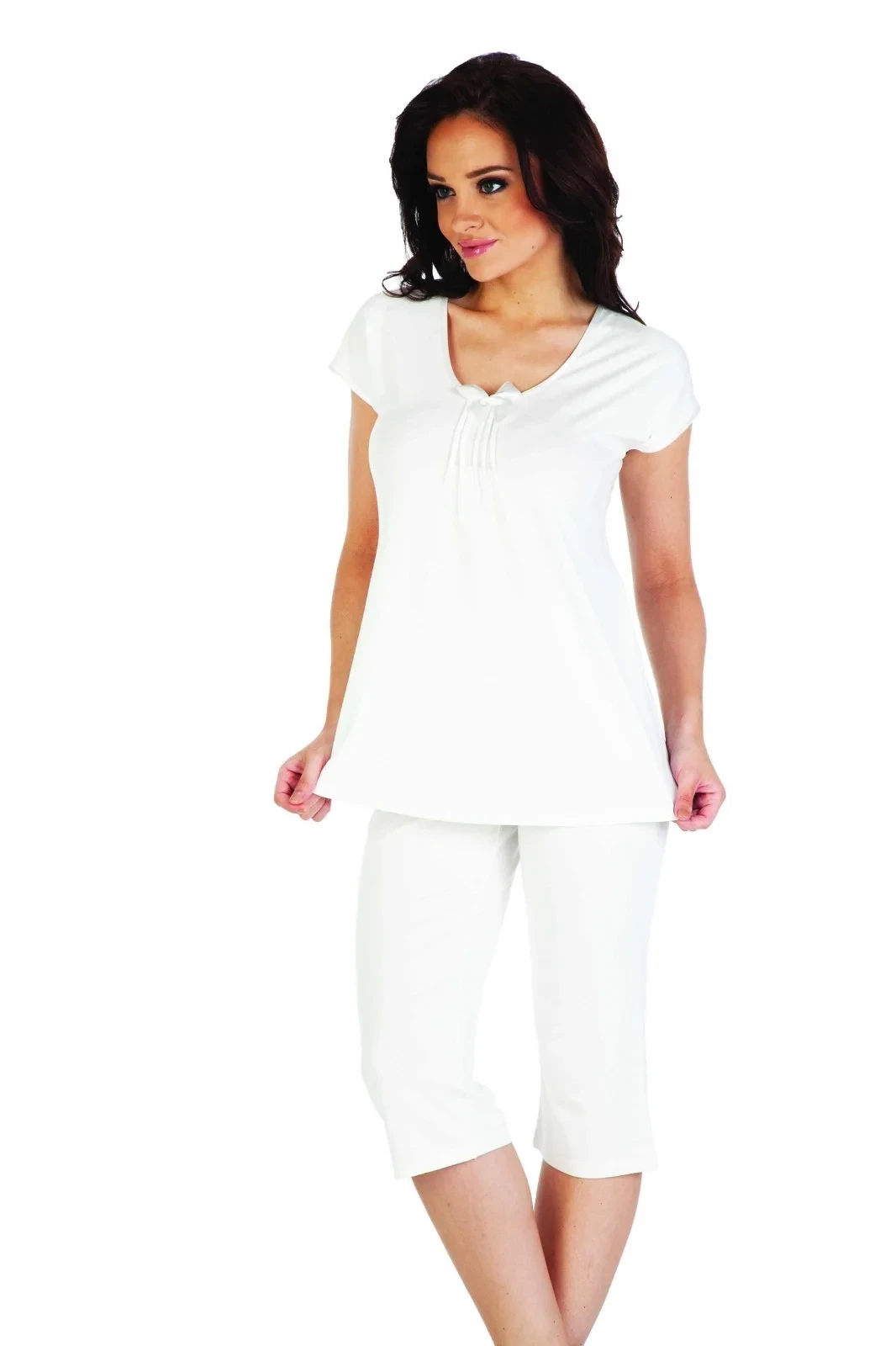 Vršek s krátkým rukávem, kulatý výstřih obšitý saténovým lemem, dekorovaný mašličkou a jemným zmačkáním. Kalhoty jednobarevné, 3/4, široké nohavice.