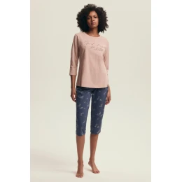 Bluzka w pudrowym różu z rękawem 3/4 została ozdobiona minimalistycznym nadrukiem "Good days ahead", wprowadzając pozytywny nastrój na początek i koniec dnia. Do kompletu dołączono granatowe spodnie 3/4 z delikatnym, roślinnym wzorem, które dodają lekkości i kobiecego charakteru.