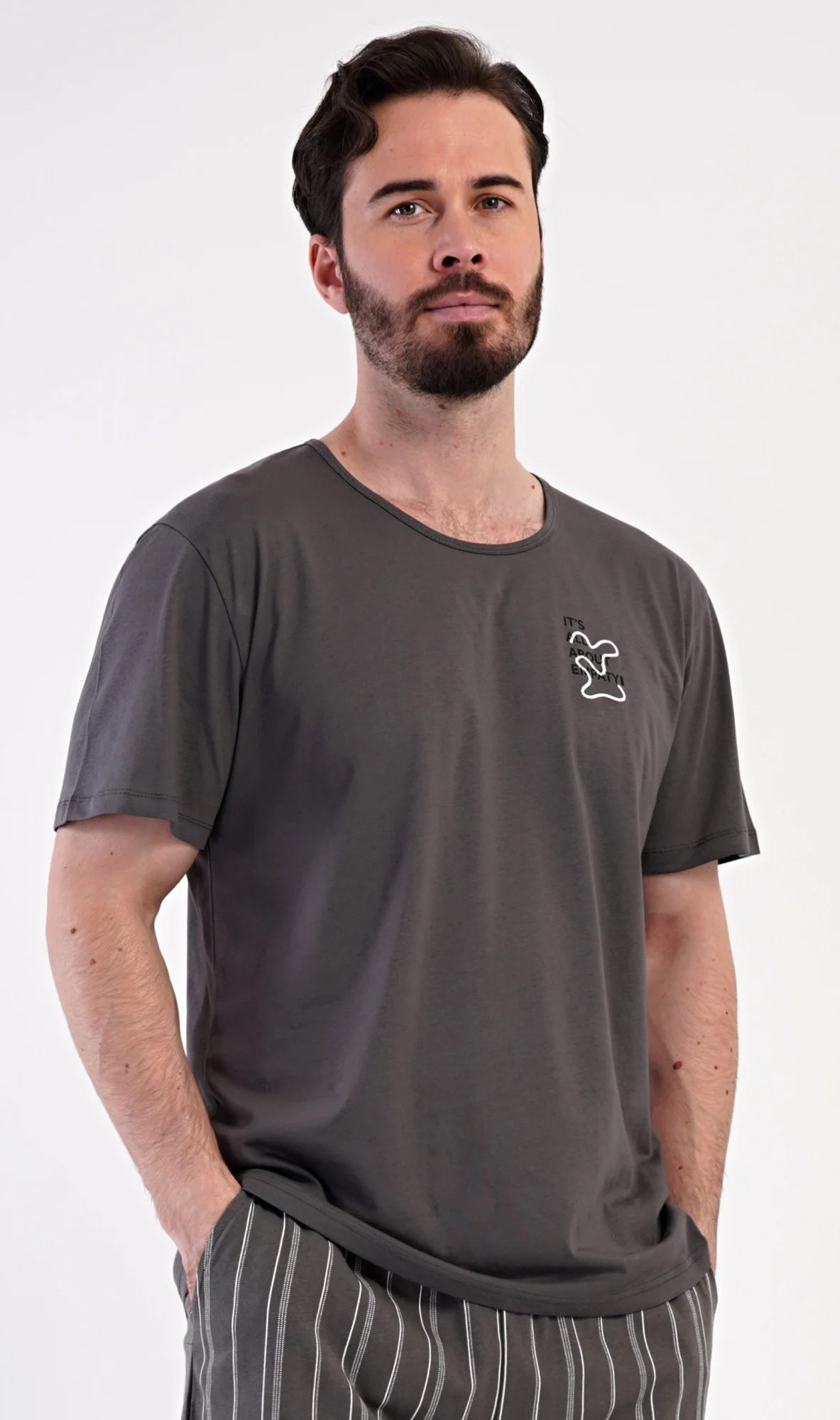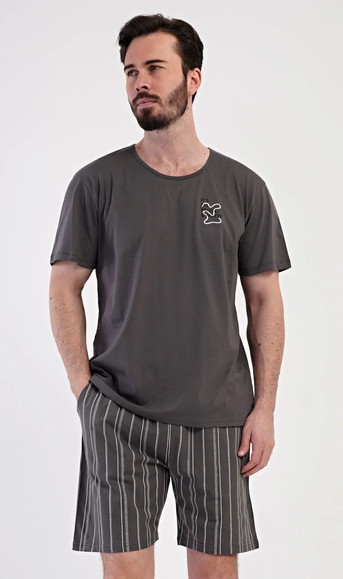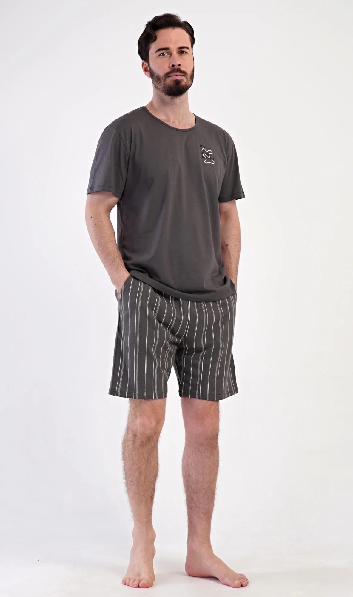 Pánské bavlněné šortkové pyžamo Nathan. Pánské pyžamo se skládá z trička s krátkým rukávem a krátkých šortkových kalhot. Jednobarevné tričko s kulatým výstřihem zdobí na hrudi drobný obázek. Tričko doplňují pruhované šortky, které mají v pase gumu, šňůrku na stažení a praktické kapsy. Použitý materiál s obsahem bavlny 100% je příjemný a poddajný na dotek.