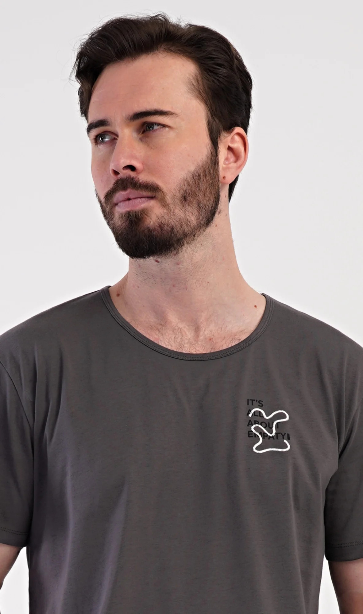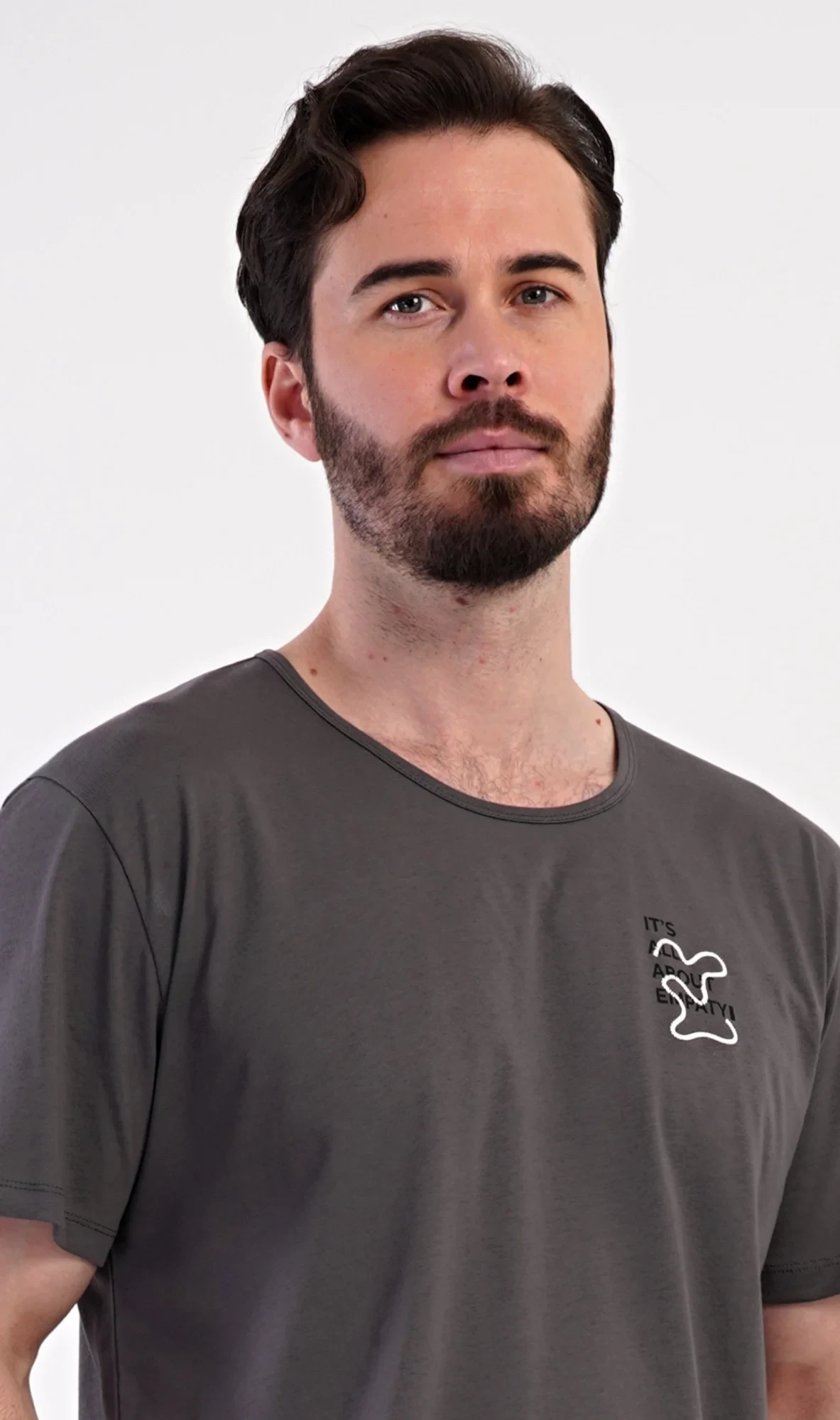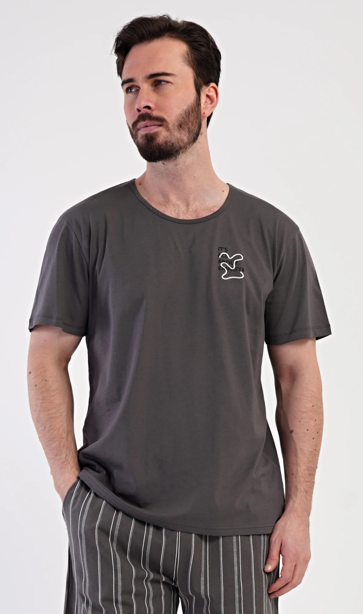 Pánské bavlněné šortkové pyžamo Nathan. Pánské pyžamo se skládá z trička s krátkým rukávem a krátkých šortkových kalhot. Jednobarevné tričko s kulatým výstřihem zdobí na hrudi drobný obázek. Tričko doplňují pruhované šortky, které mají v pase gumu, šňůrku na stažení a praktické kapsy. Použitý materiál s obsahem bavlny 100% je příjemný a poddajný na dotek.