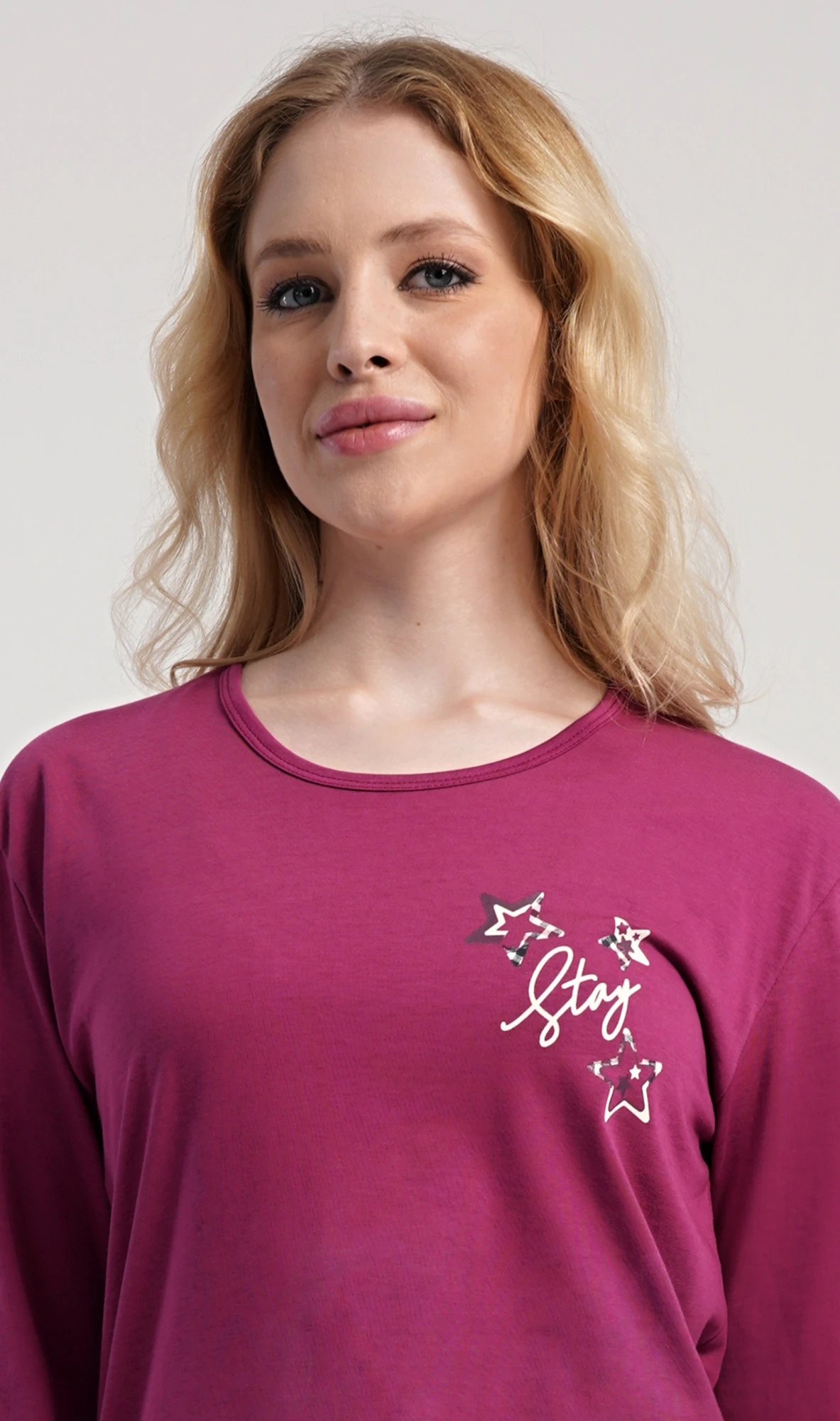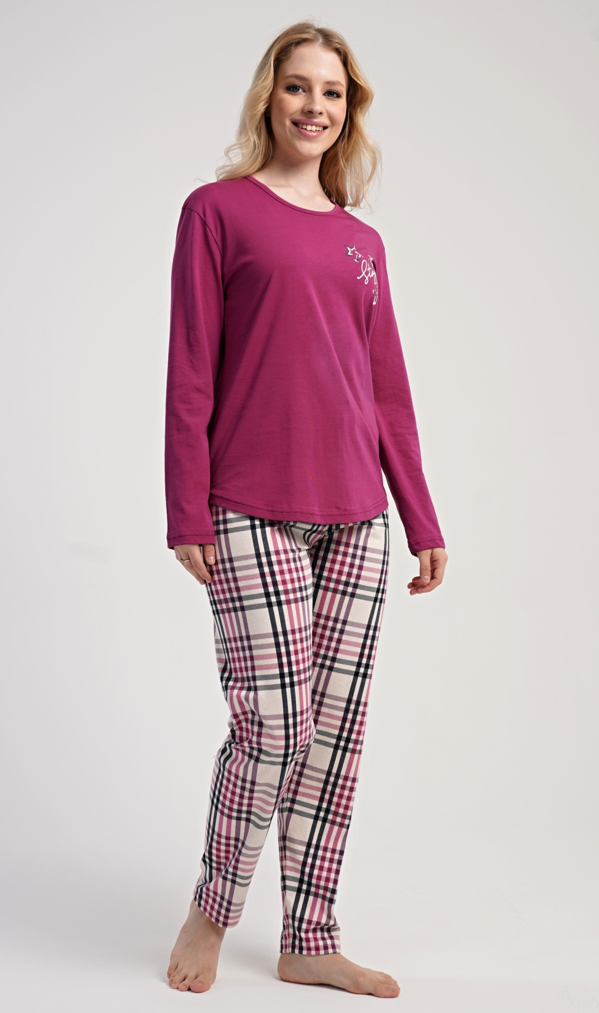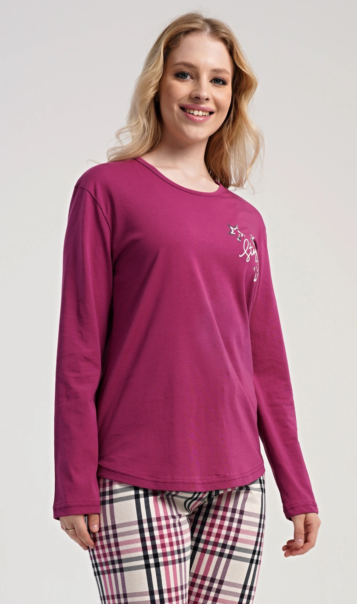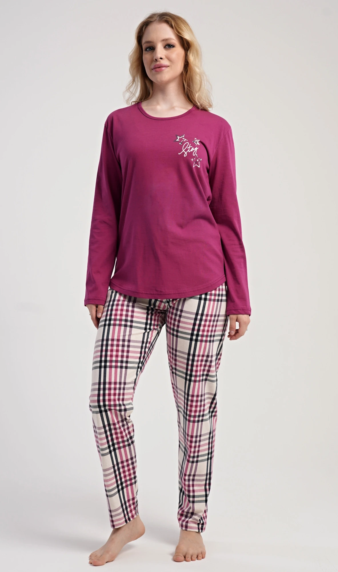 Dámské bavlněné dlouhé pyžamo Andrea. Dámské pyžamo se skládá z trika s dlouhým rukávem a dlouhých kalhot. Jednobarevné triko s kulatým výstřihem zdobí na hrudi drobný nápis a hvězdy. Kárované kalhoty mají v pase gumu a šňůrku na stažení, nemají kapsy. Použitý bavlněný materiál je poddajný a příjemný na dotek.