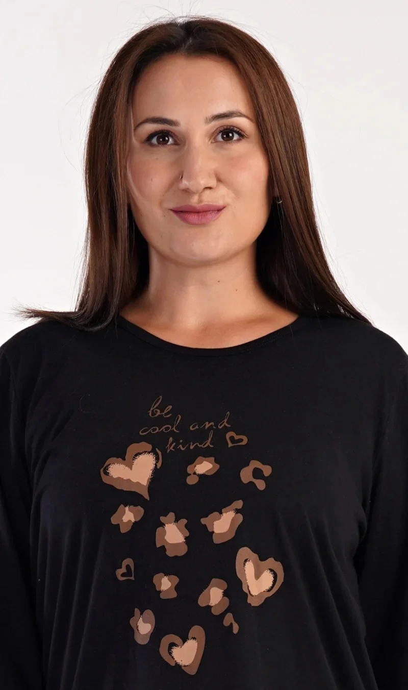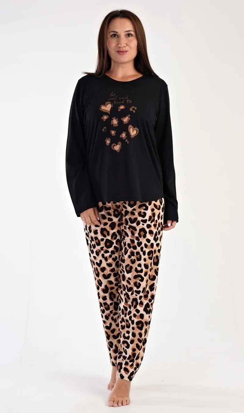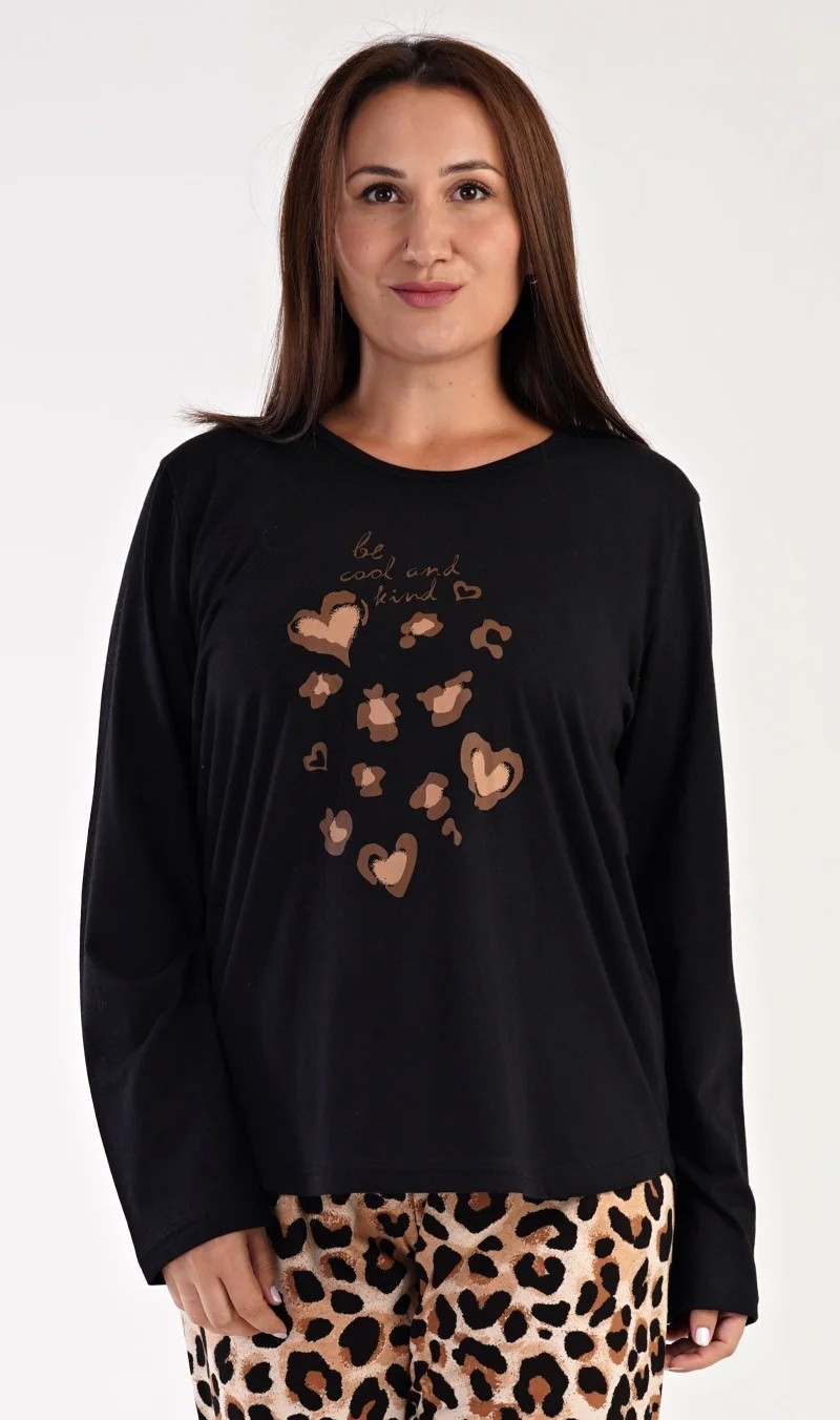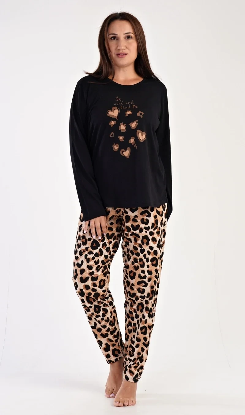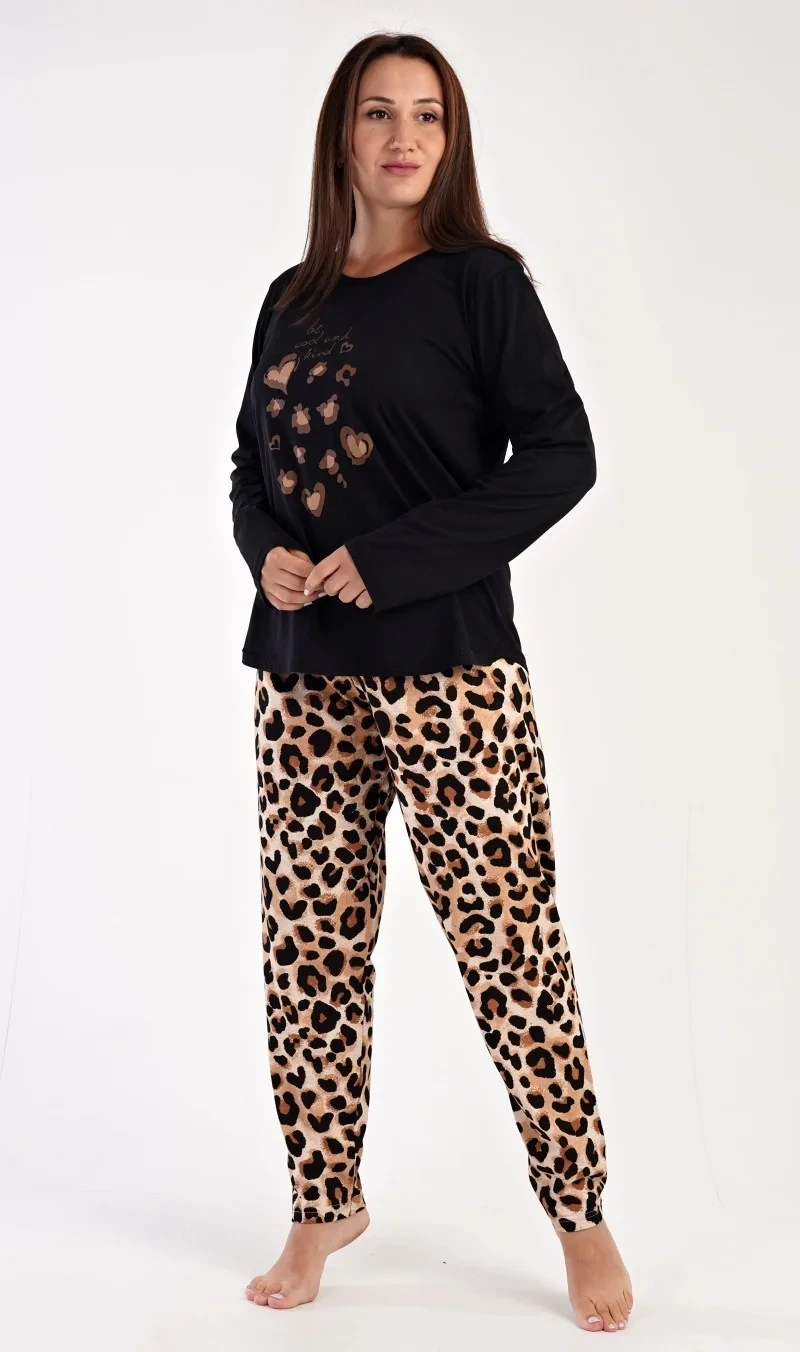 Dámské bavlněné pyžamo dlouhé Anna. Pyžamo se skládá z trika s dlouhým rukávem a dlouhých kalhot. Triko je jednobarevné, zdobené leopardím motivem a nápisem 'Be cool and kind'. Stejný motiv se opakuje i na kalhotách, které jsou v pase do gumy a na stažení šňůrkou. Použitý materiál je poddajný a příjemný na dotek. Kalhoty i triko je složeno ze 100% bavlnou.