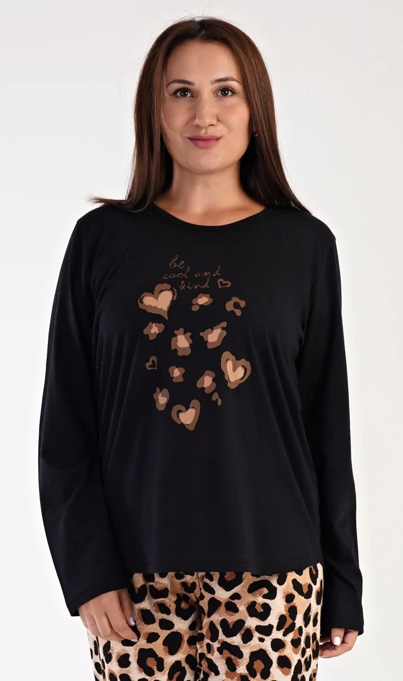 Dámské bavlněné pyžamo dlouhé Anna. Pyžamo se skládá z trika s dlouhým rukávem a dlouhých kalhot. Triko je jednobarevné, zdobené leopardím motivem a nápisem 'Be cool and kind'. Stejný motiv se opakuje i na kalhotách, které jsou v pase do gumy a na stažení šňůrkou. Použitý materiál je poddajný a příjemný na dotek. Kalhoty i triko je složeno ze 100% bavlnou.