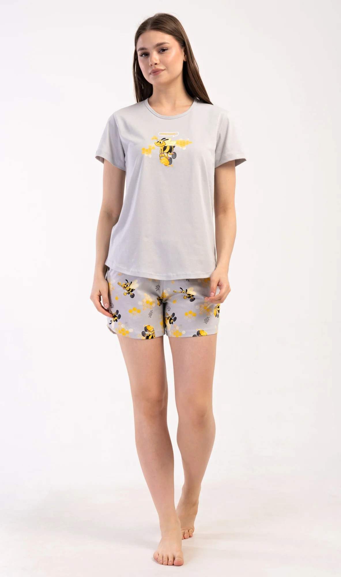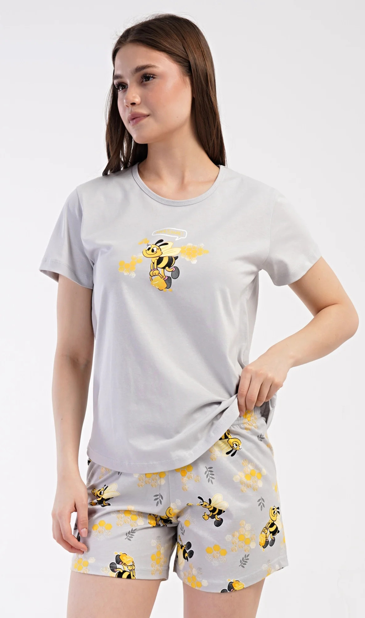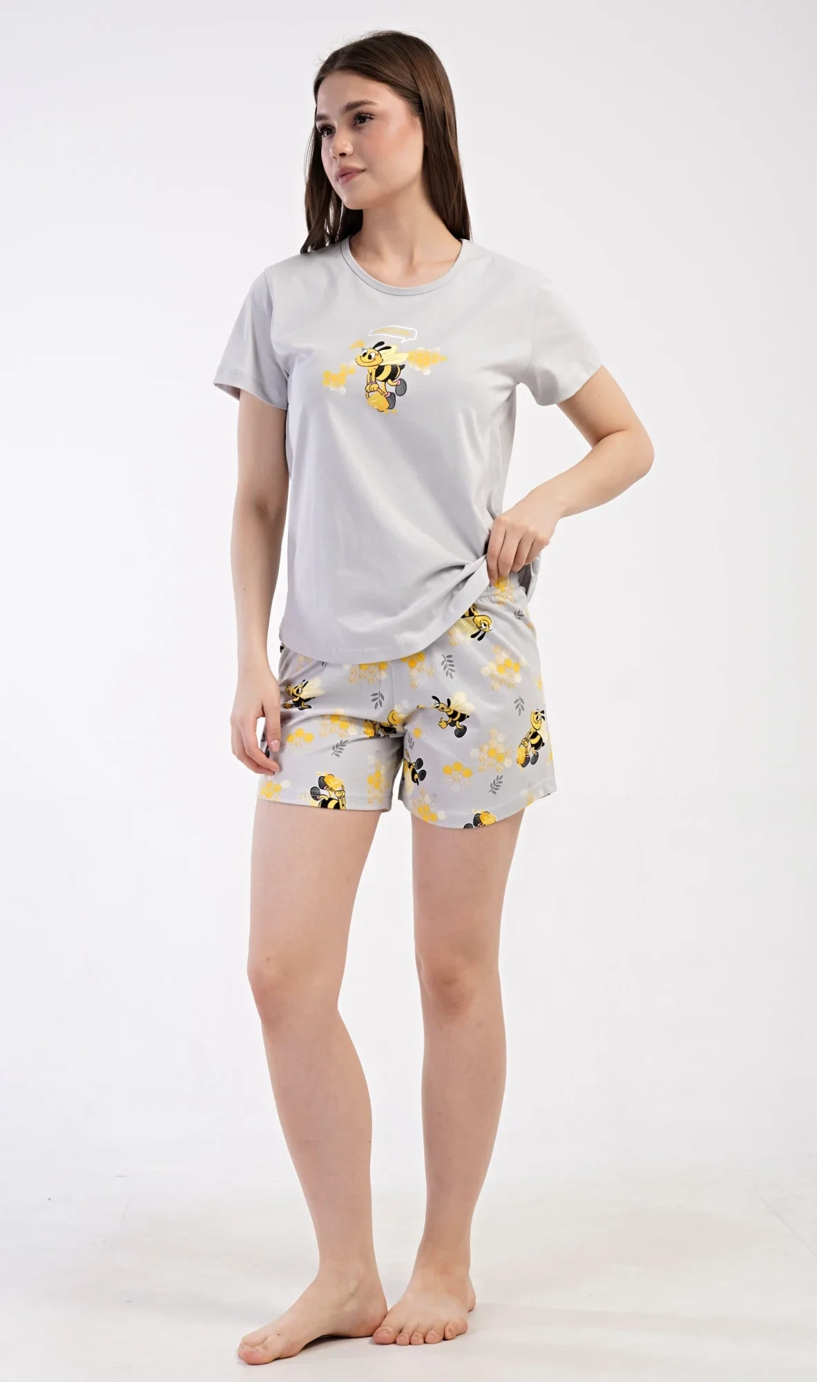 Dámské bavlněné šortkové pyžamo Včelky. Dámské pyžamo se skládá z trička s krátkým rukávem a šortkových kalhot. Jednobarevné tričko zdobí obrázek včelky. Stejný motiv se opakuje i na šortkách, které mají v pase gumu a šňůrku na stáhnutí, jsou bez kapes. Použitý bavlněný materiál je příjemný a poddajný na dotek.