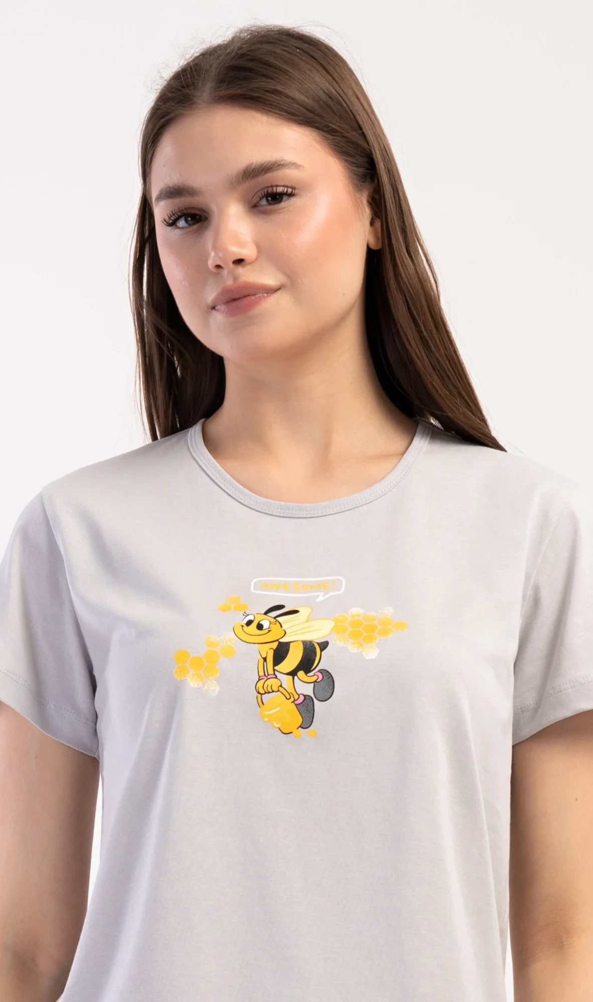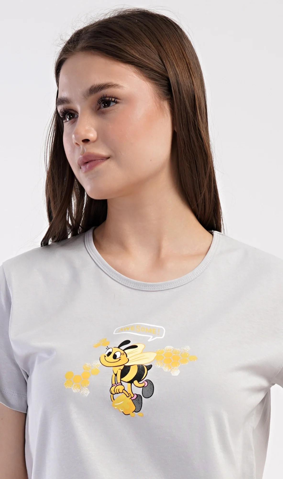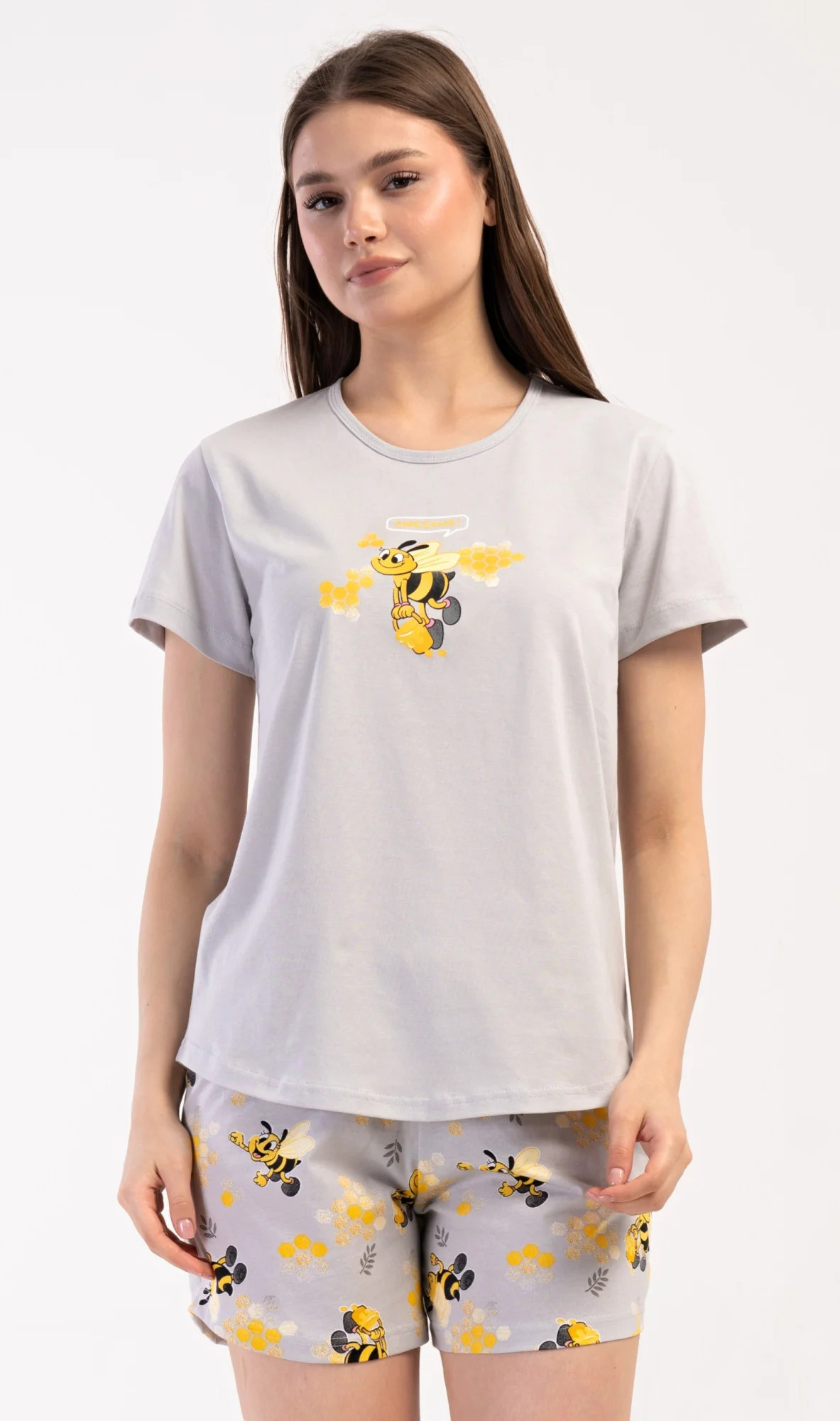 Dámské bavlněné šortkové pyžamo Včelky. Dámské pyžamo se skládá z trička s krátkým rukávem a šortkových kalhot. Jednobarevné tričko zdobí obrázek včelky. Stejný motiv se opakuje i na šortkách, které mají v pase gumu a šňůrku na stáhnutí, jsou bez kapes. Použitý bavlněný materiál je příjemný a poddajný na dotek.