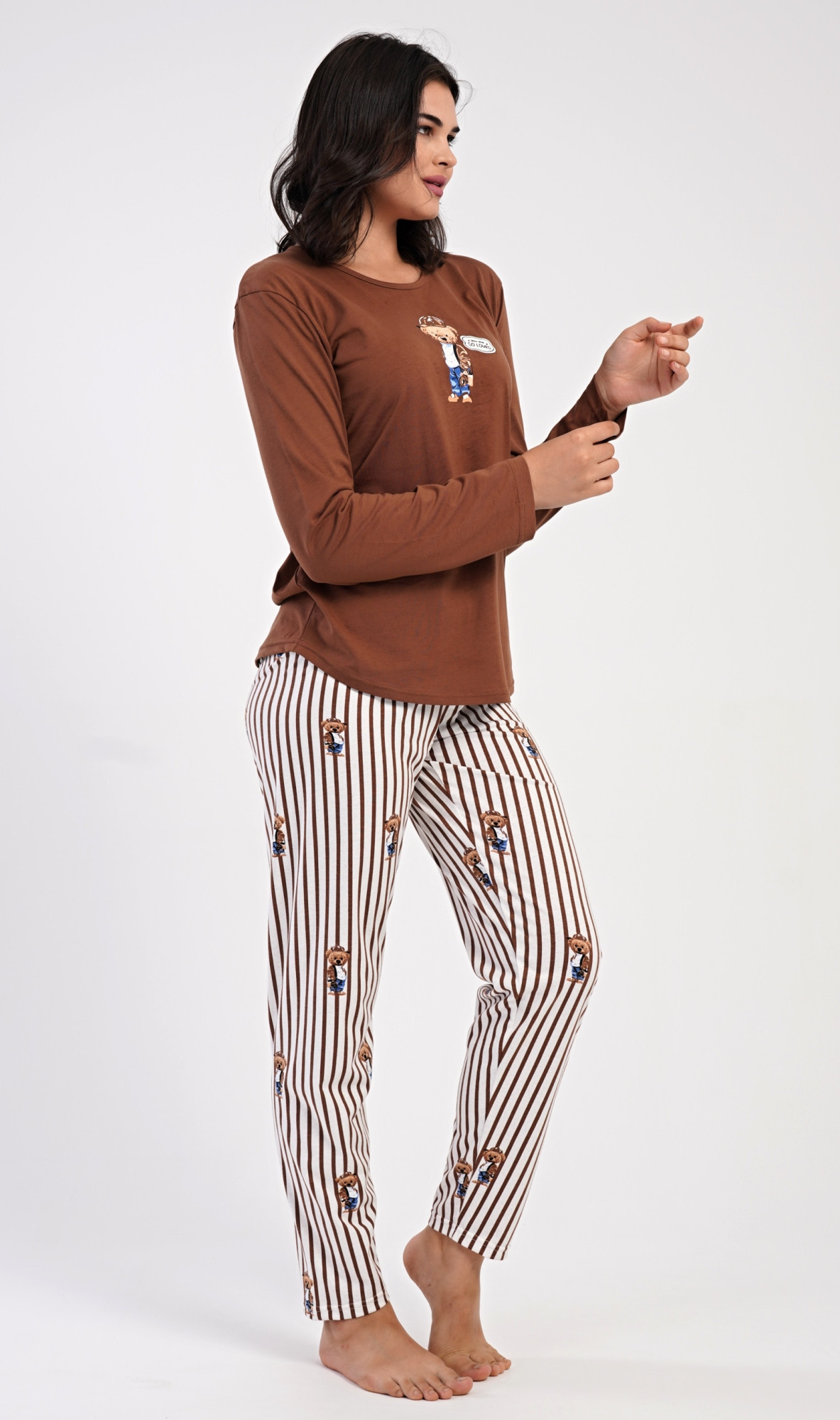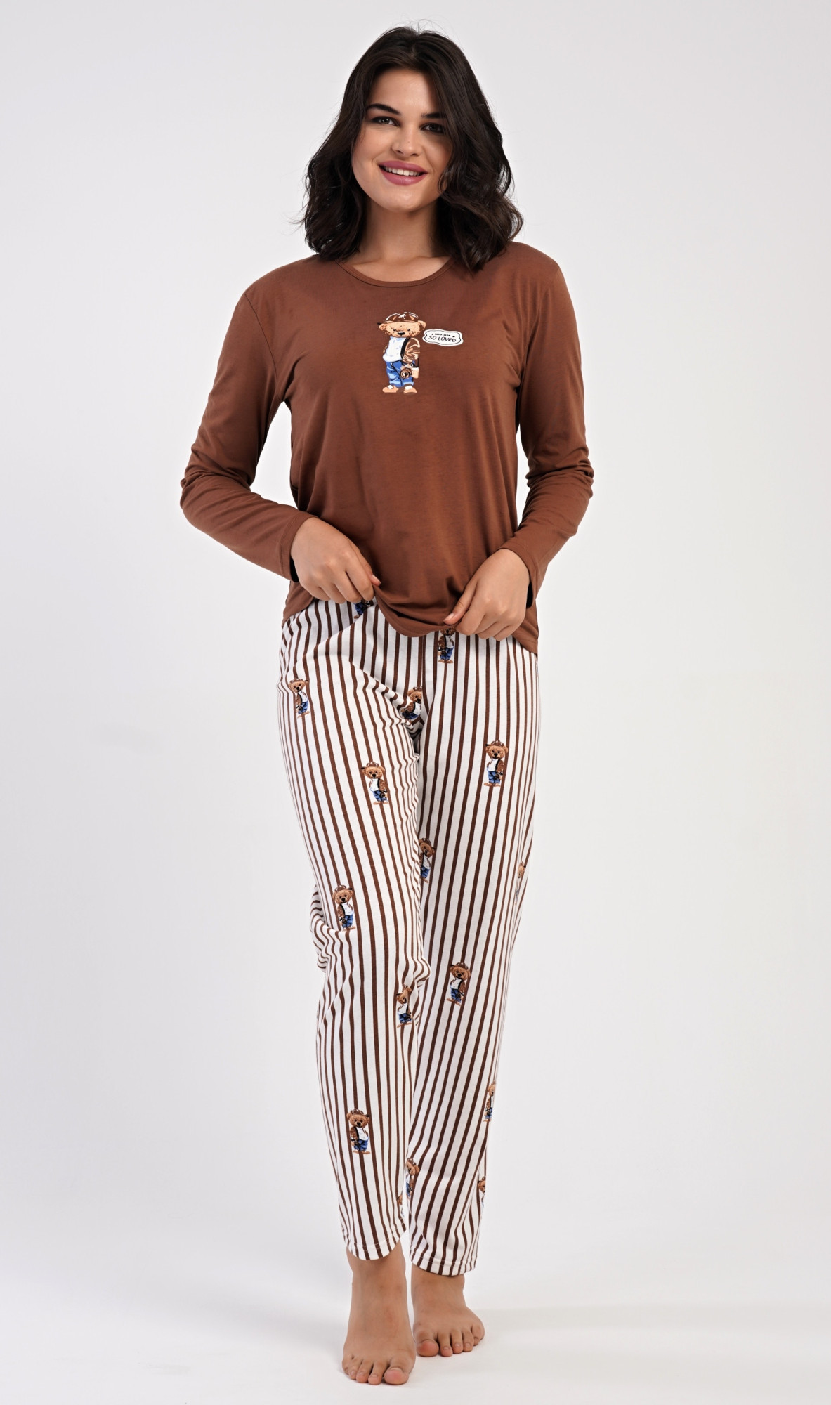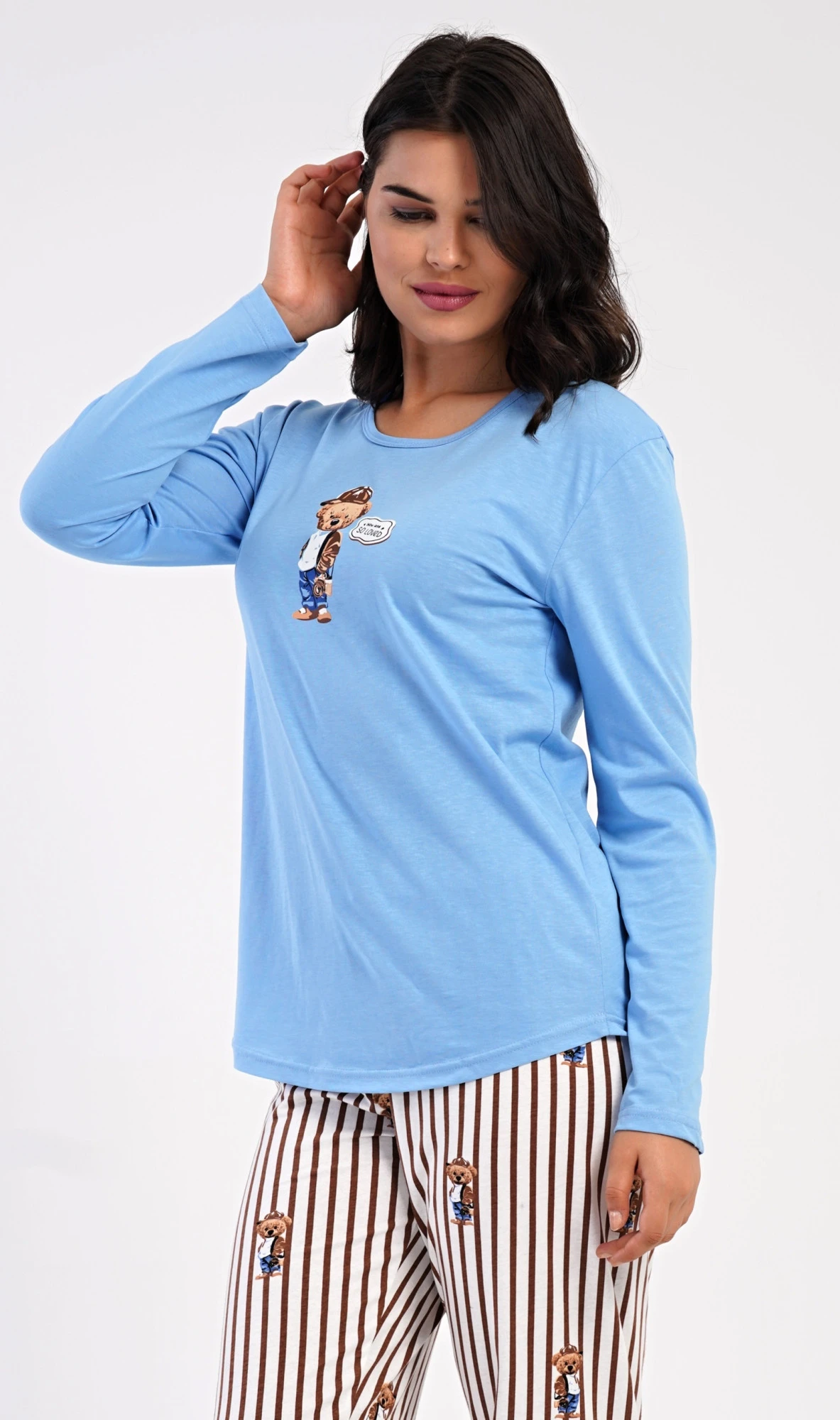 Dámské bavlněné dlouhé pyžamo Bear. Dámské pyžamo se skládá z trika s dlouhým rukávem a dlouhých kalhot. Jednobarevné triko je ozdobeno obrázkem medvěda. Tento motiv se opakuje i na proužkovaných kalhotách, které mají v pase gumu a šňůrku na stažení, nemají kapsy. Použitý bavlněný materiál je poddajný a příjemný na dotek.