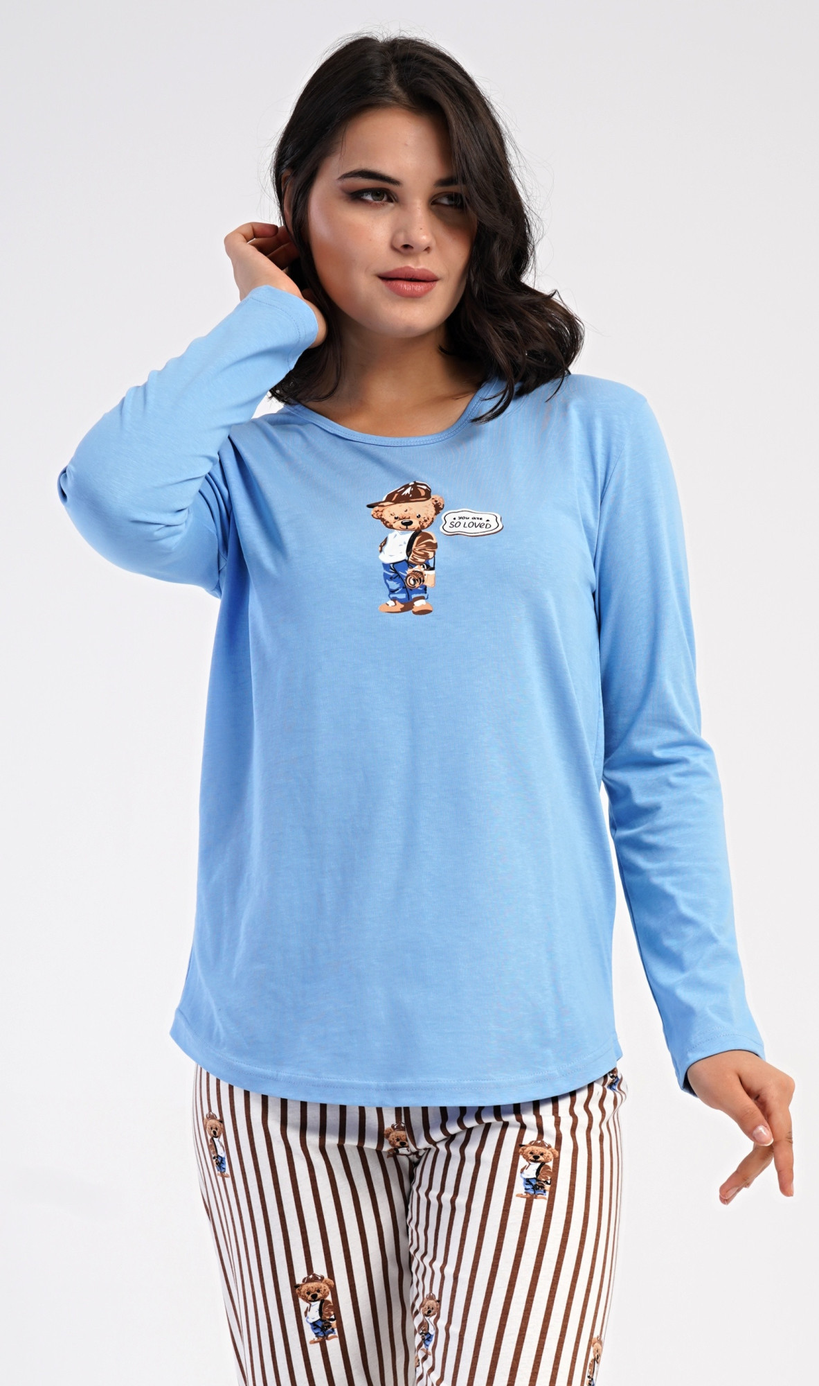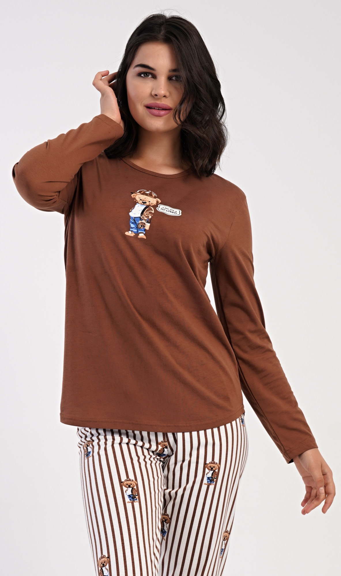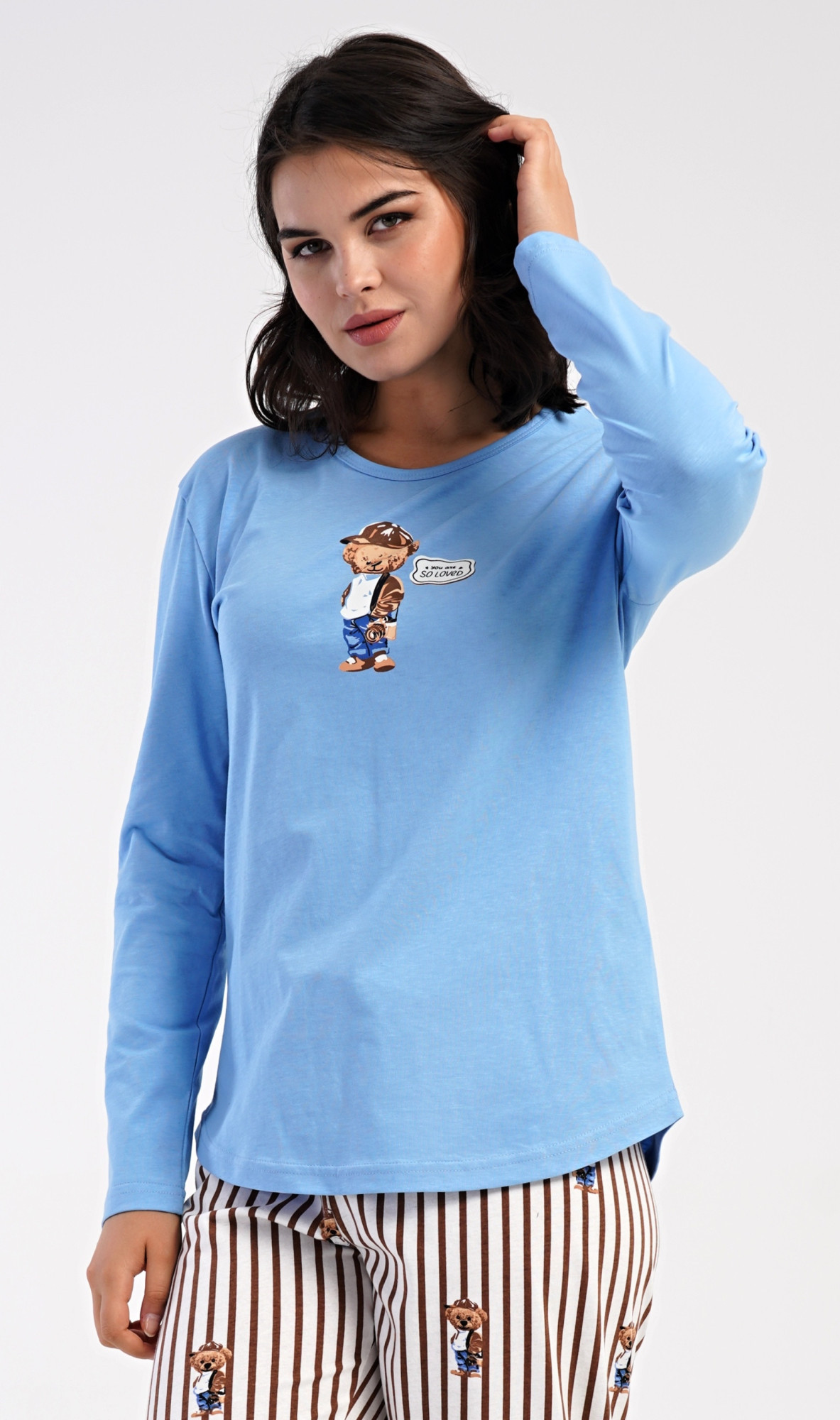 Dámské bavlněné dlouhé pyžamo Bear. Dámské pyžamo se skládá z trika s dlouhým rukávem a dlouhých kalhot. Jednobarevné triko je ozdobeno obrázkem medvěda. Tento motiv se opakuje i na proužkovaných kalhotách, které mají v pase gumu a šňůrku na stažení, nemají kapsy. Použitý bavlněný materiál je poddajný a příjemný na dotek.