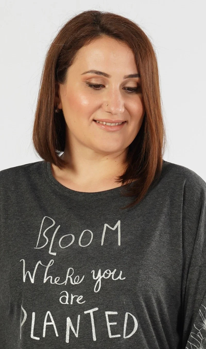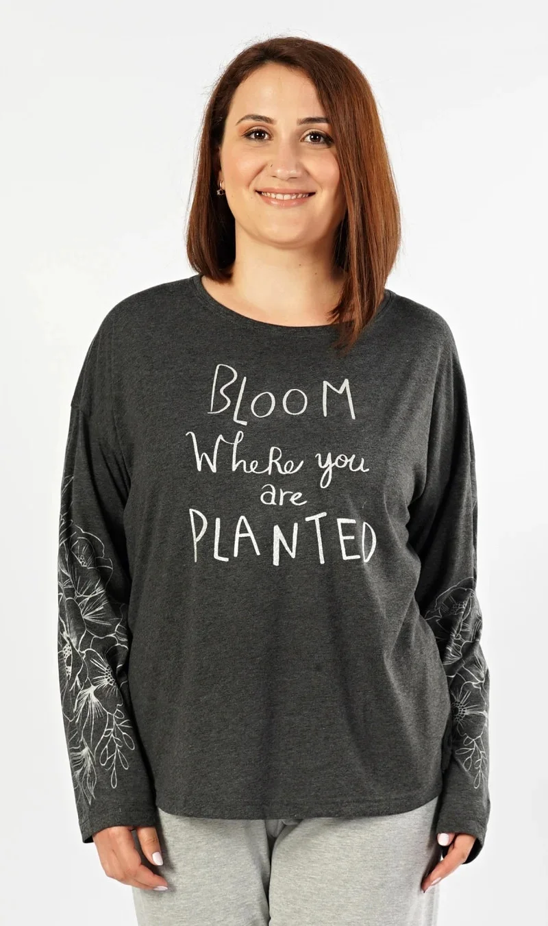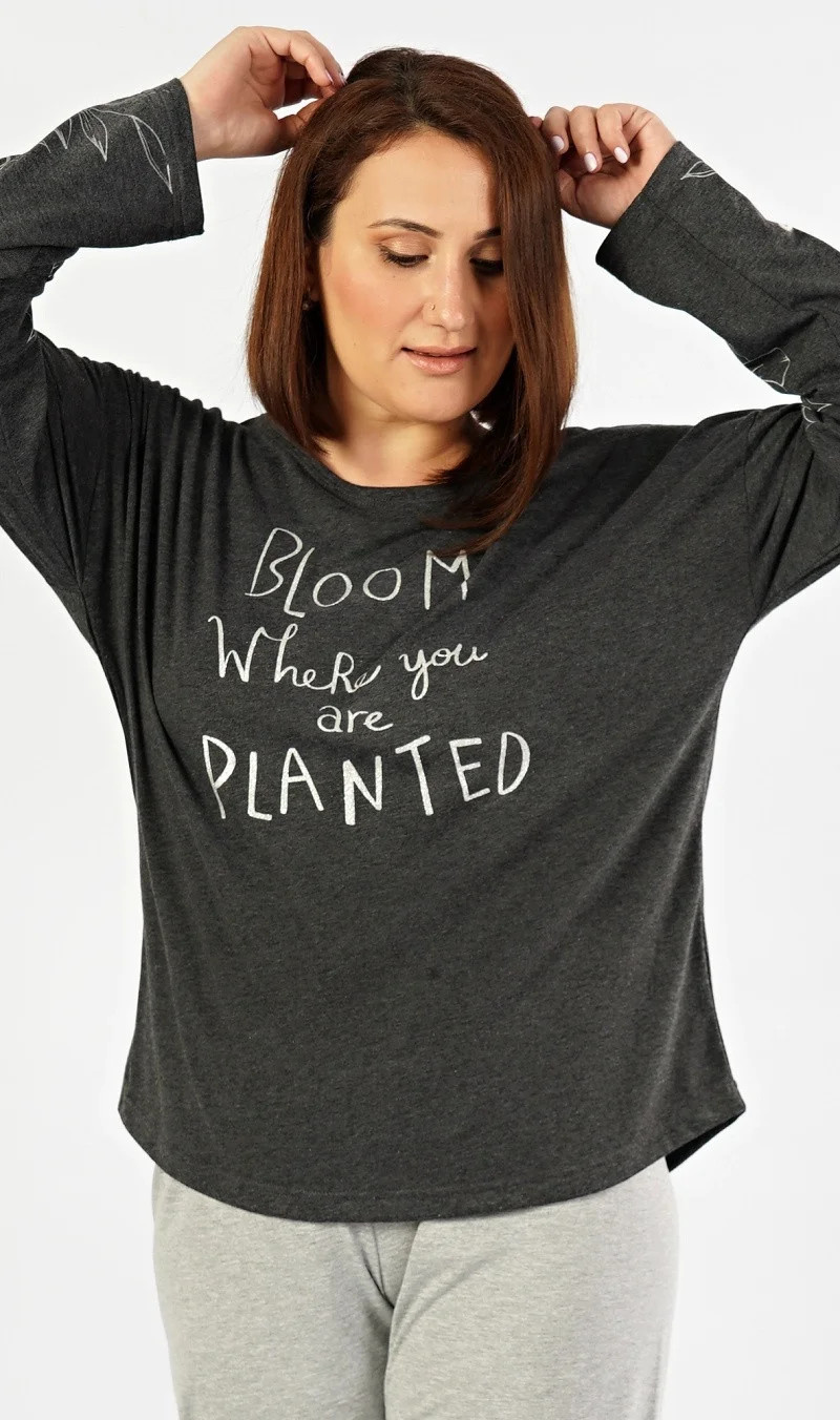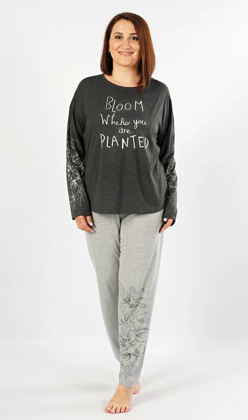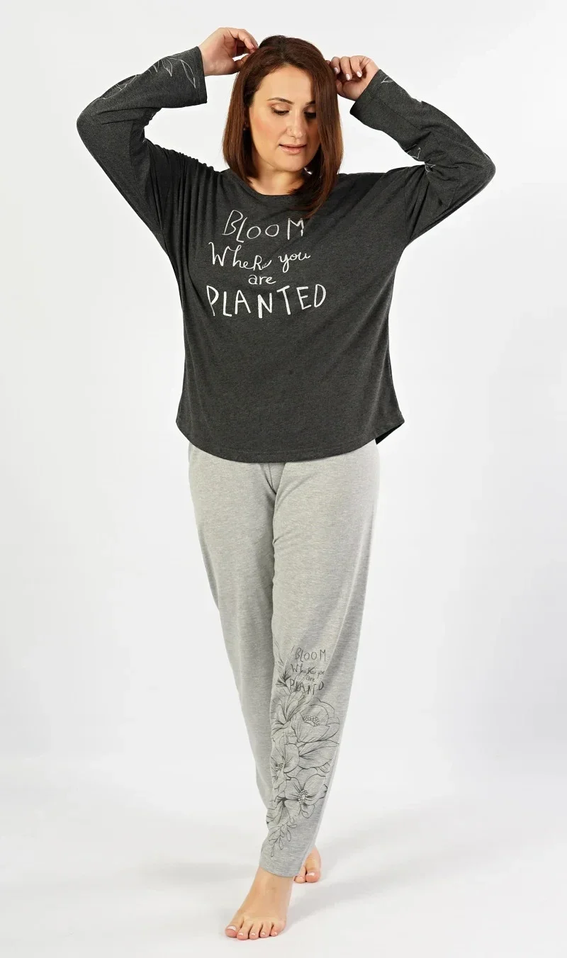 Dámské pyžamo dlouhé Berenika. Dámské pyžamo se skládá z trička s dlouhým rukávem a dlouhých kalhot. Triko je v tmavě šedé barvě se stříbrným nápisem a květinami na rukávu. Kalhoty jsou světle šedé s opakujícím se motivem jako na triku, jsou do gumy a na stažení šňůrkou. Použitý materiál s obsahem bavlny 70% je poddajný a příjemný na dotek.