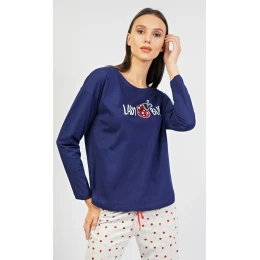 Dámské pyžamo dlouhé Beruška. Dámské pyžamo se skládá z trička s dlouhým rukávem a dlouhých kalhot. Triko je jednobarevné s obrázkem berušky a nápisem Lady Bug .Kalhoty jsou světle šedé a celopotištěné beruškami .Kalhoty jsou do gumy a na stažení šňůrkou a bez kapes .Použitý materiál je poddajný a příjemný na dotek.