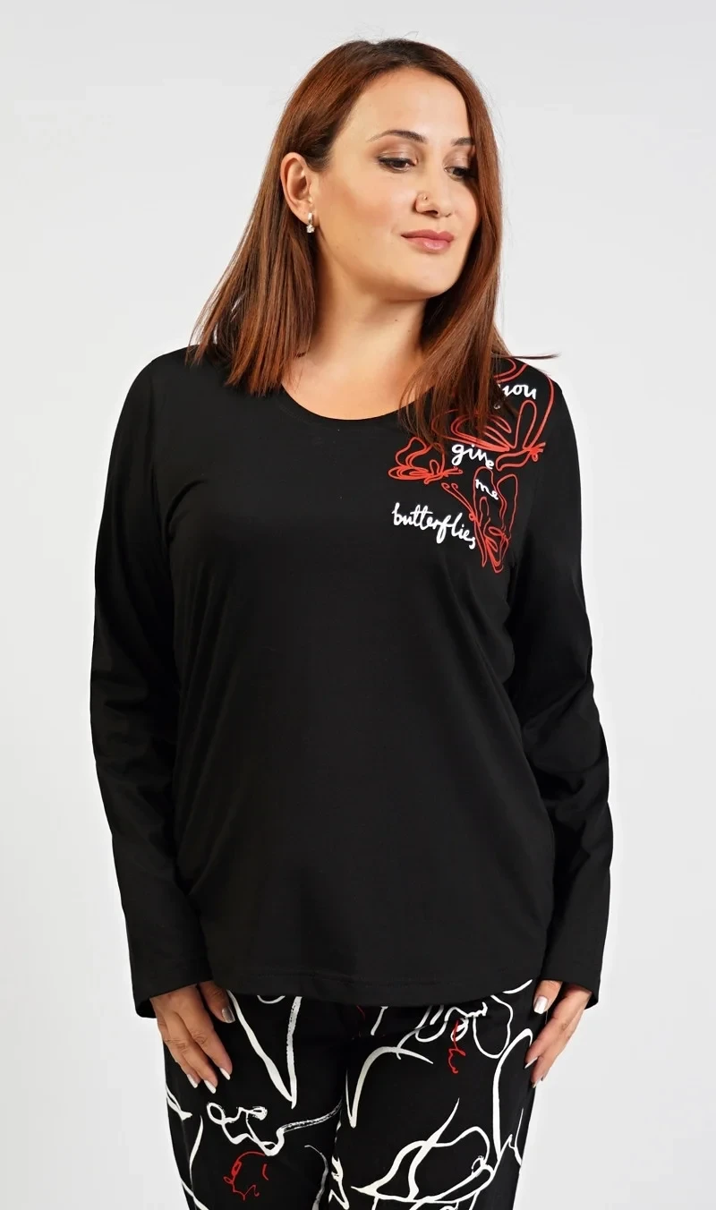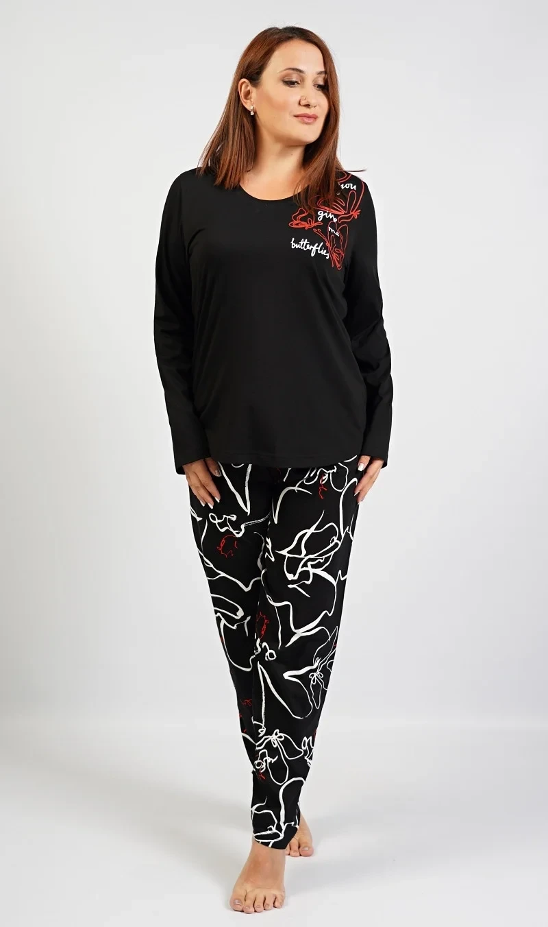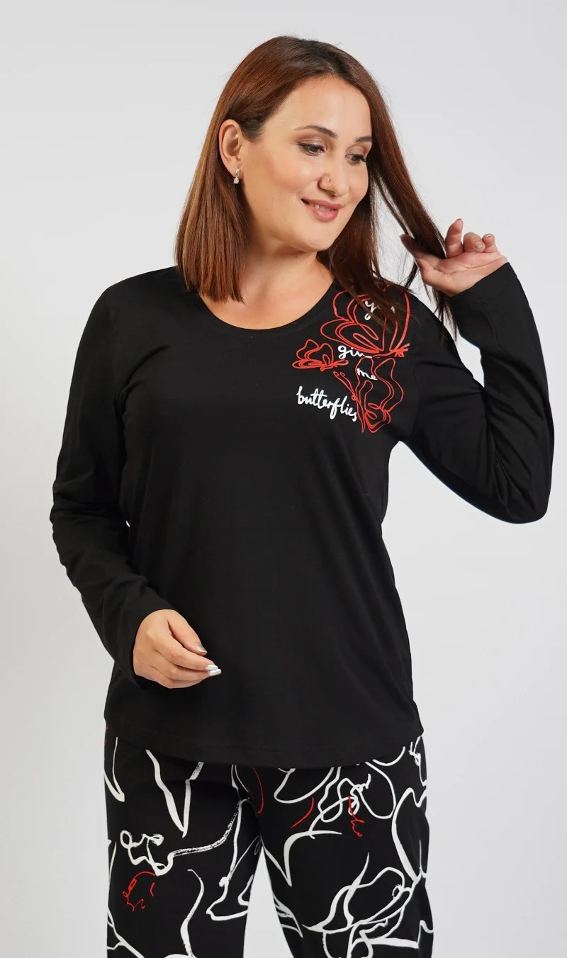 Dámské bavlněné pyžamo dlouhé Butterfly. Dámské pyžamo dlouhé se skládá z trika s dlouhým rukávem a dlouhých kalhot. Na jednobarevném černém triku je potisk červených motýlů a bílý nápis. Kalhoty mají v pase gumu a šňůrku na stažení, jsou bez kapes. Použitý bavlněný materiál je příjemný a poddajný na dotek.