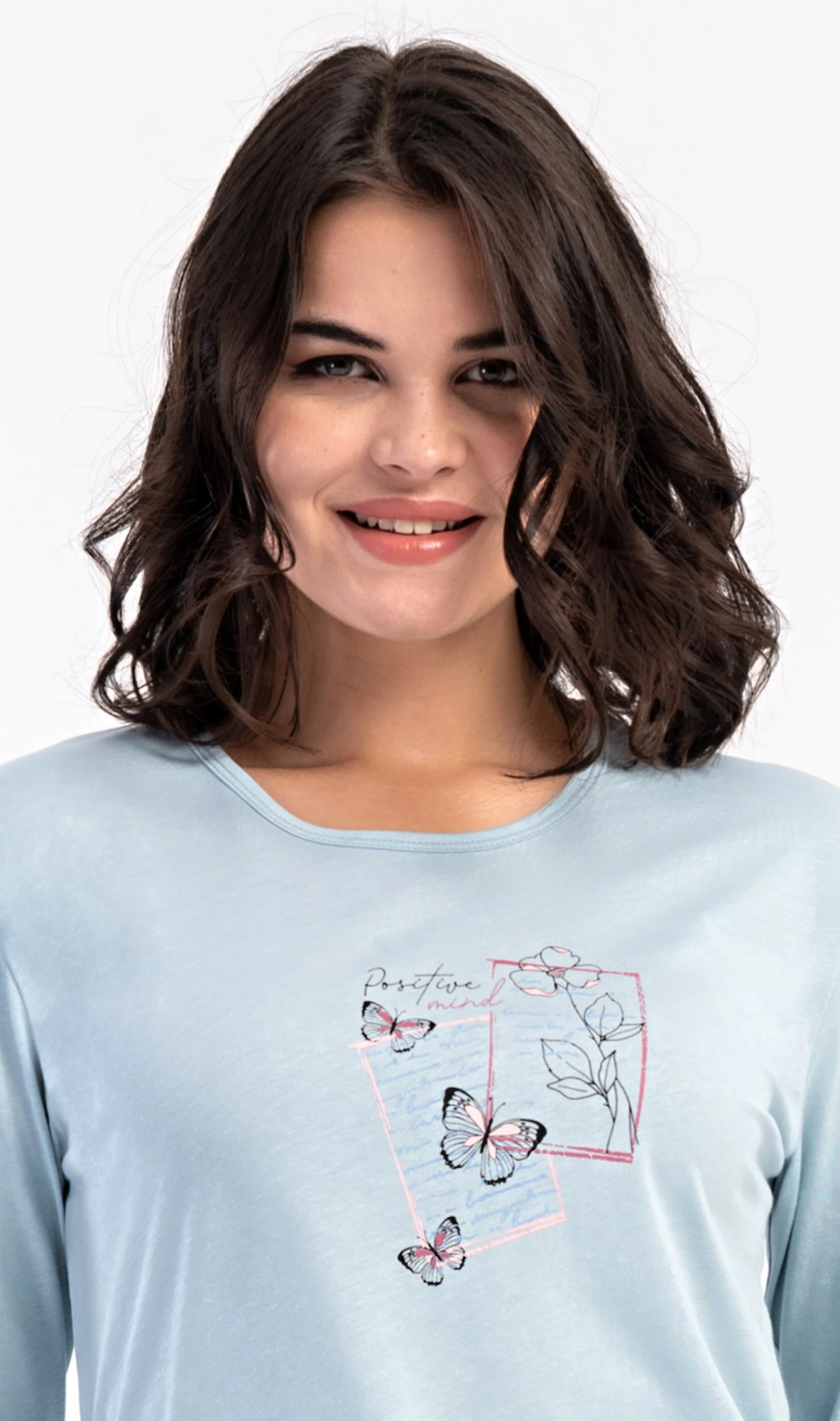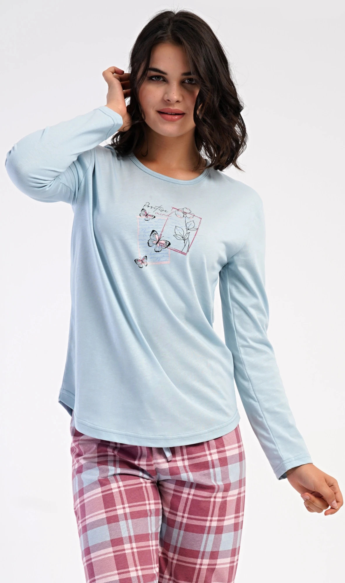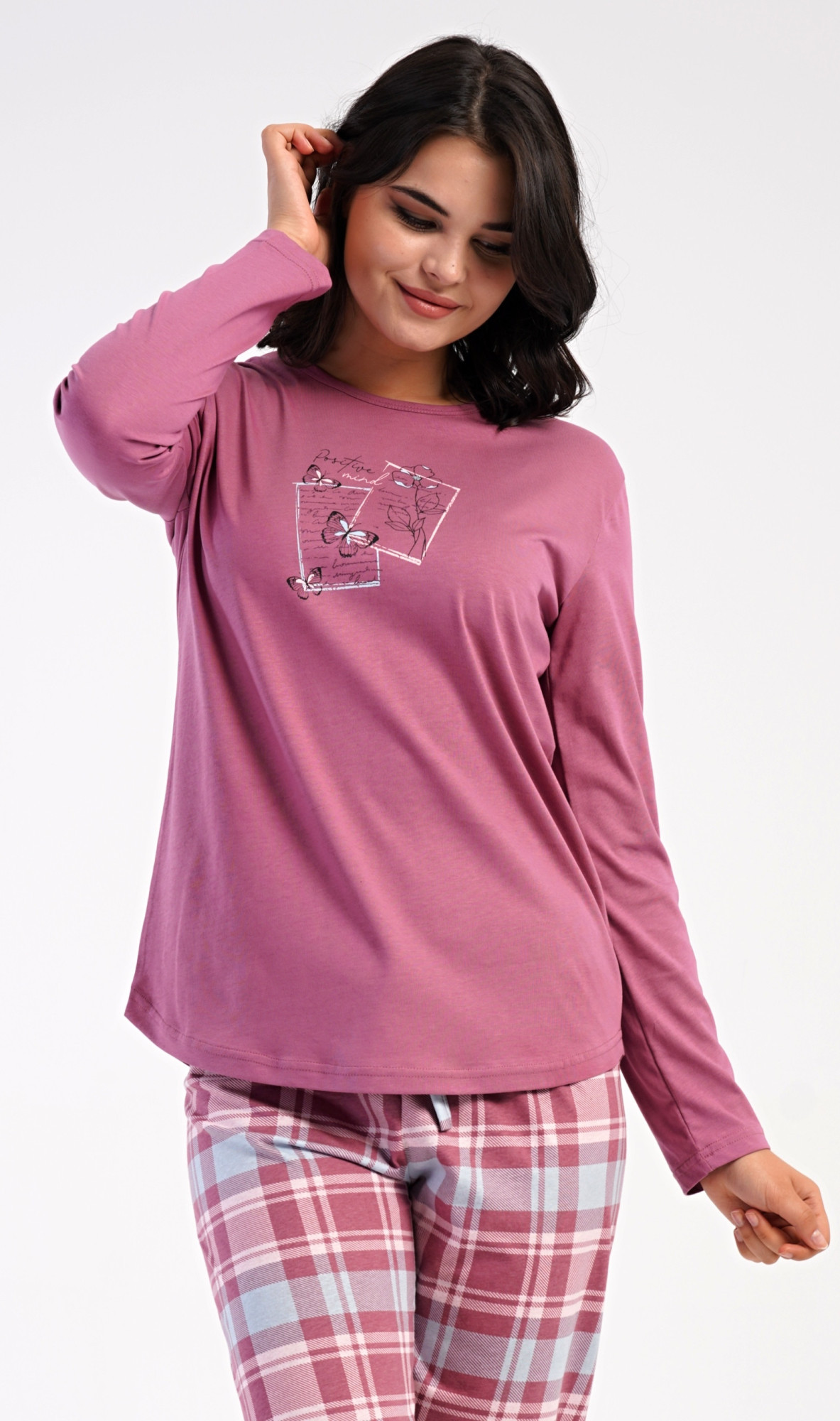 Dámské bavlněné dlouhé pyžamo Charlotte. Dámské pyžamo se skládá z trika s dlouhým rukávem a dlouhých kalhot. Jednobarevné triko s kulatým výstřihem zdobí na hrudi motýlci. Kárované kalhoty mají v pase gumu a šňůrku na stažení, nemají kapsy. Použitý bavlněný materiál je poddajný a příjemný na dotek.
