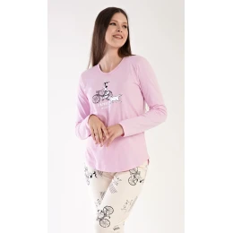 Dámské bavlněné pyžamo dlouhé Dívka na kole. Dámské pyžamo se skládá z trika s dlouhým rukávem a dlouhých kalhot, které jsou zakončené patenty. Triko je jednobarevné, zdobené obrázkem dívky na kole a nápisem FAMILY WARM. Kalhoty jsou krémové, potištěné stejným motivem, mají v pase gumu a šňůrku na stažení. Použitý materiál je poddajný a příjemný na dotek. Kalhoty i triko je složeno ze 100% bavlnou.