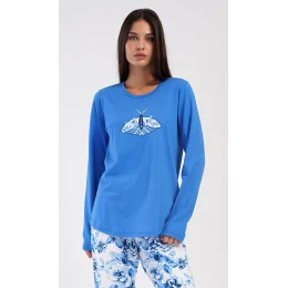 Dámské dlouhé bavlněné pyžamo Dominika. Dámské pyžamo se skládá z trika s dlouhým rukávem a dlouhých kalhot. Triko je jednobarevné, zdobené obrázkem motýla a květů. Květinový potisk se opakuje i na kalhotách, které mají v pase gumu a šňůrku na stažení, nemají kapsy. Použitý bavlněný materiál je poddajný a příjemný na dotek.