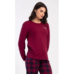 Dámské bavlněné dlouhé pyžamo Emma. Dámské pyžamo se skládá z trika s dlouhým rukávem a dlouhých kalhot. Jednobarevné triko s kulatým výstřihem zdobí na hrudi drobný nápis. Kárované kalhoty mají v pase gumu a šňůrku na stažení, nemají kapsy. Použitý bavlněný materiál je poddajný a příjemný na dotek.