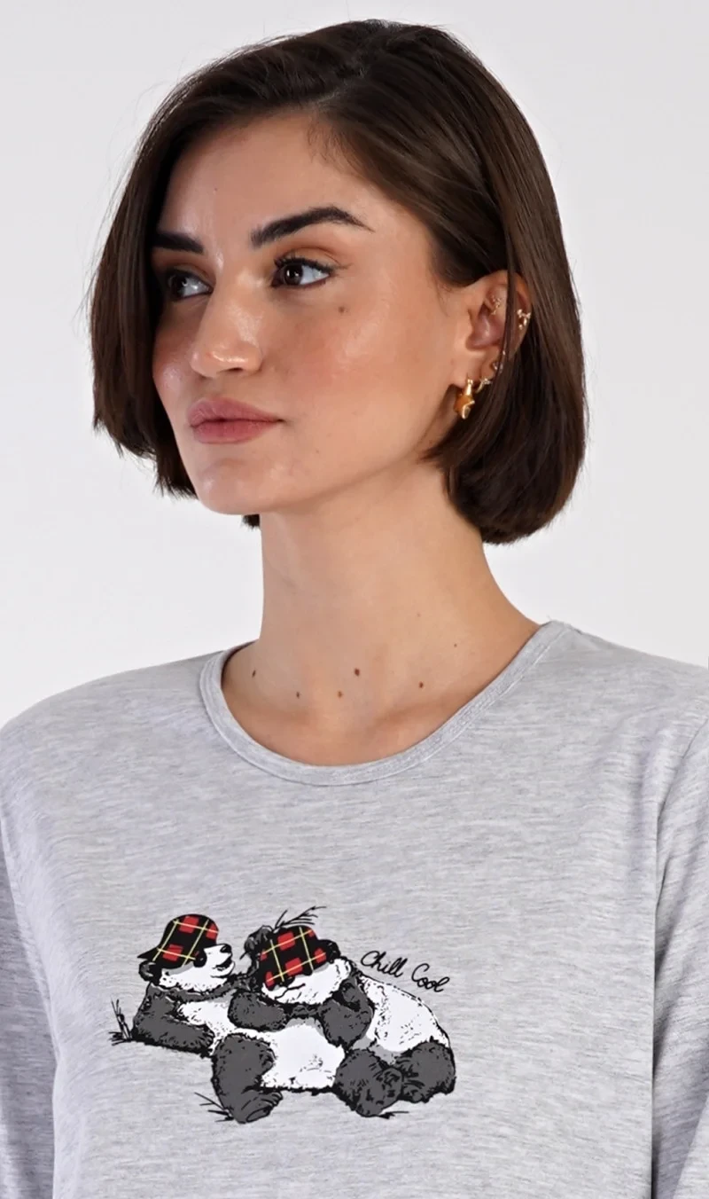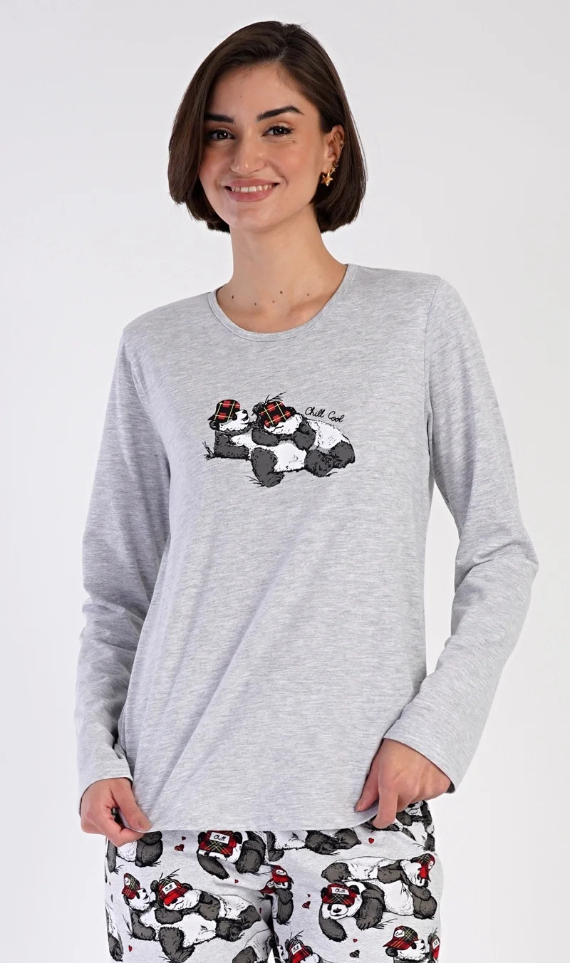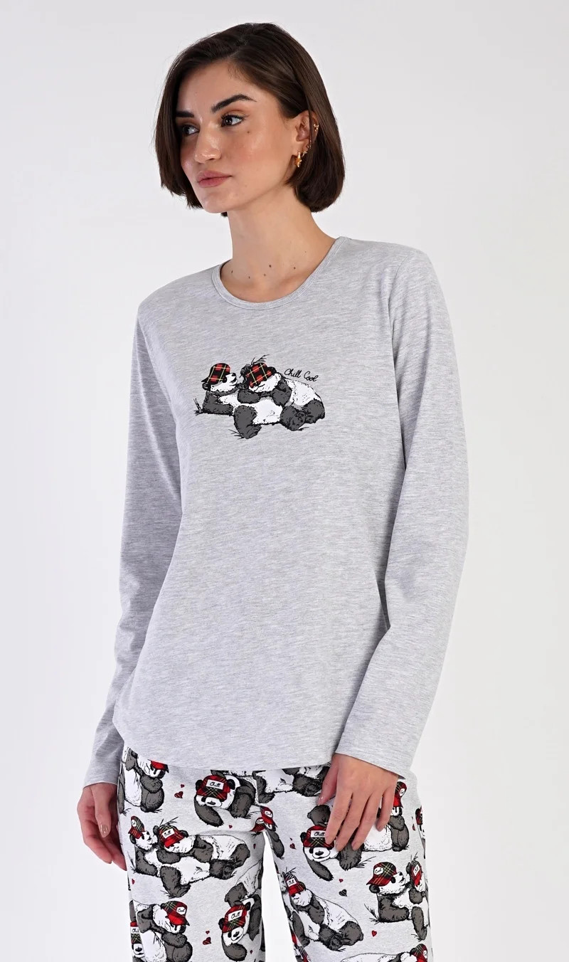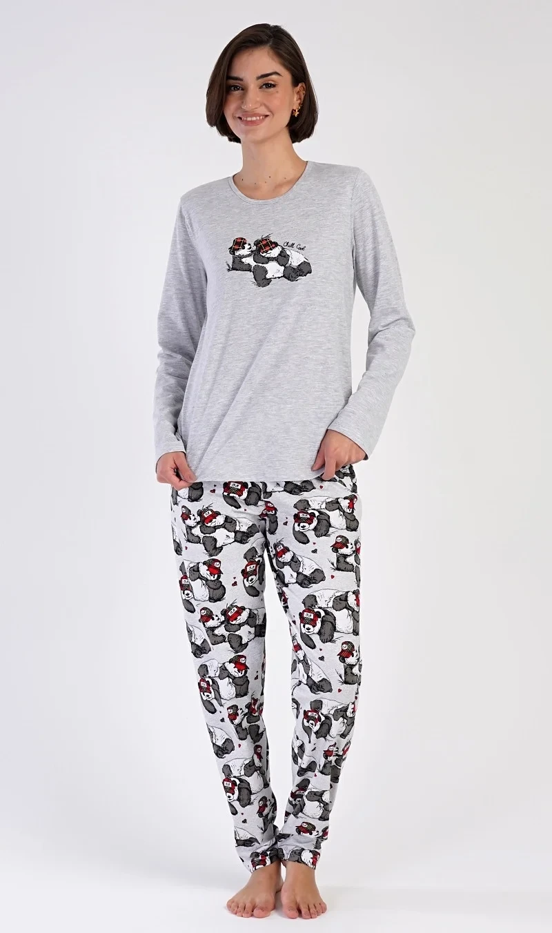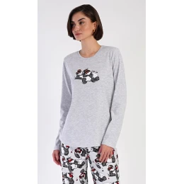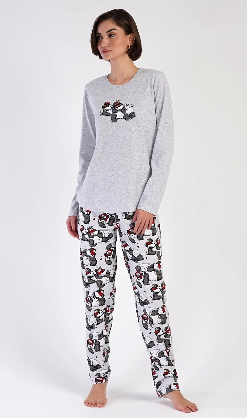 Dámské pyžamo dlouhé Enjoy. Dámské pyžamo se skládá z trika s dlouhým rukávem a dlouhých kalhot. Triko je jednobarevné, zdobené na hrudi drobným nápisem a obrázkem spících medvídků. Stejný motiv se opakuje i na kalhotách, které mají v pase gumu a šňůrku na stažení, nemají kapsy. Použitý materiál s obsahem bavlny 70% je poddajný a příjemný na dotek.