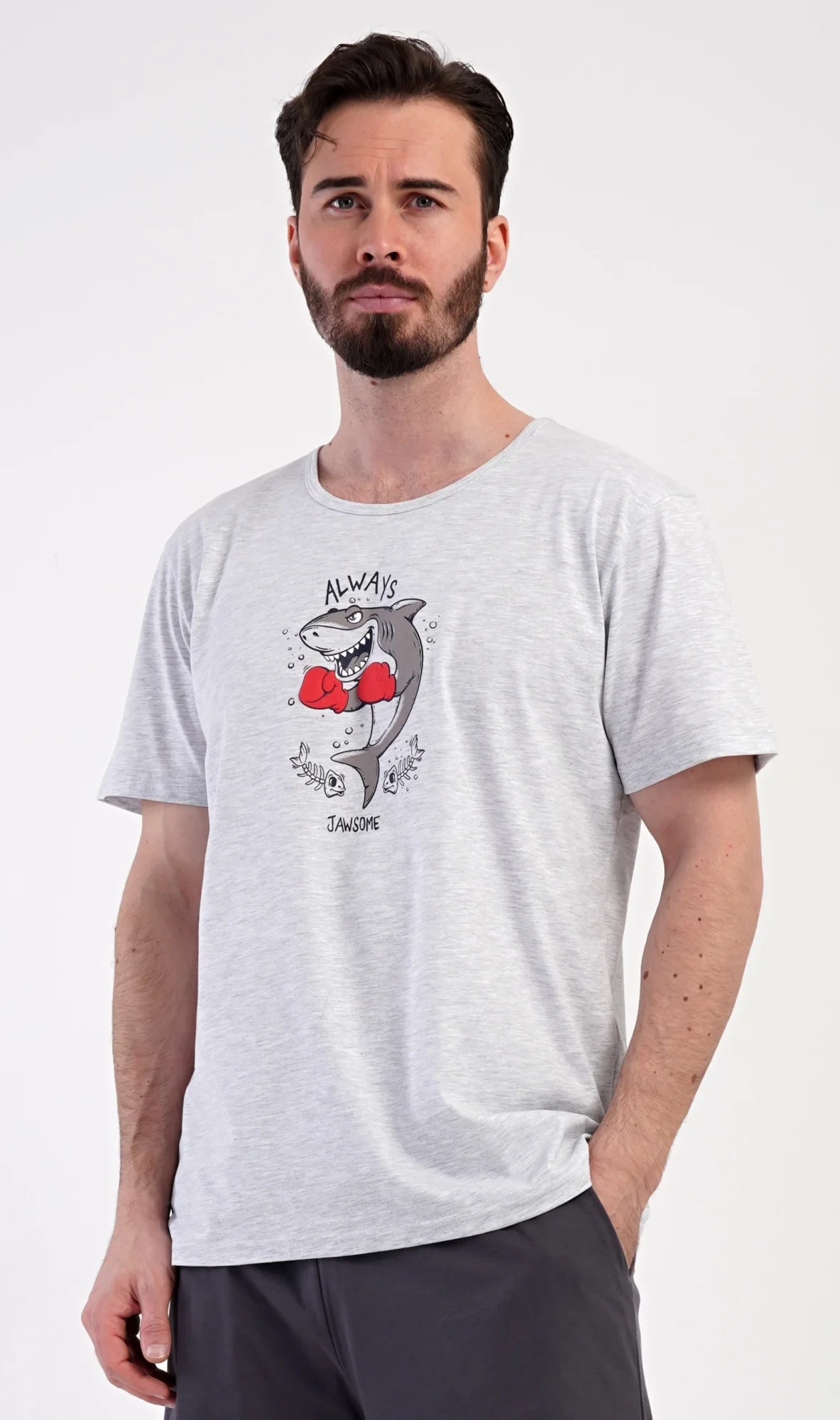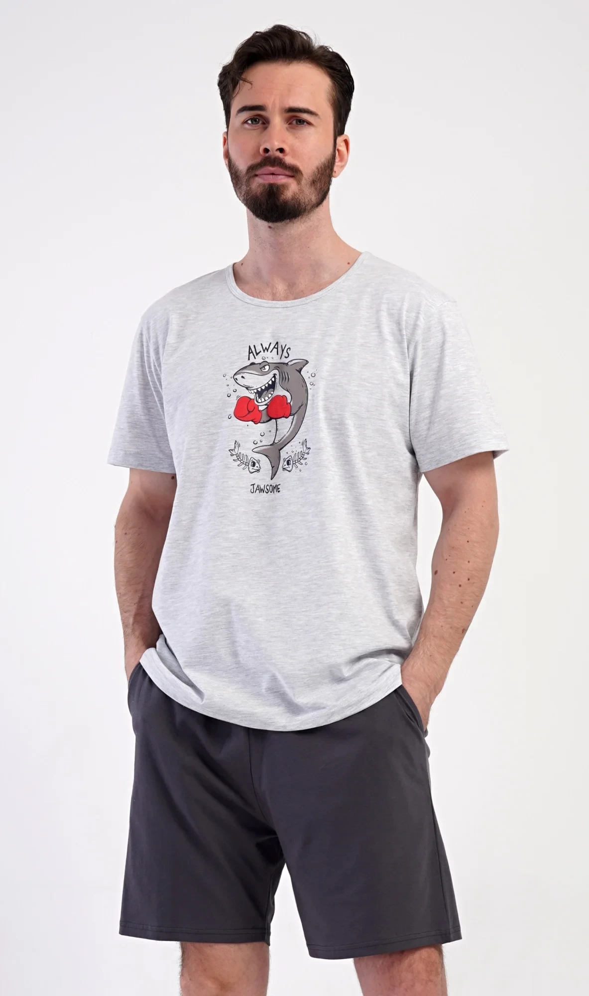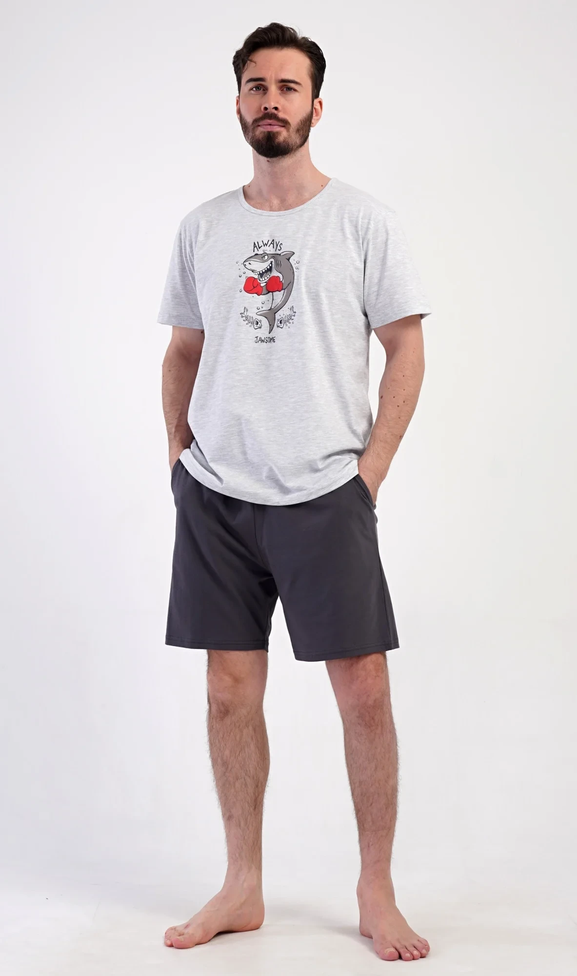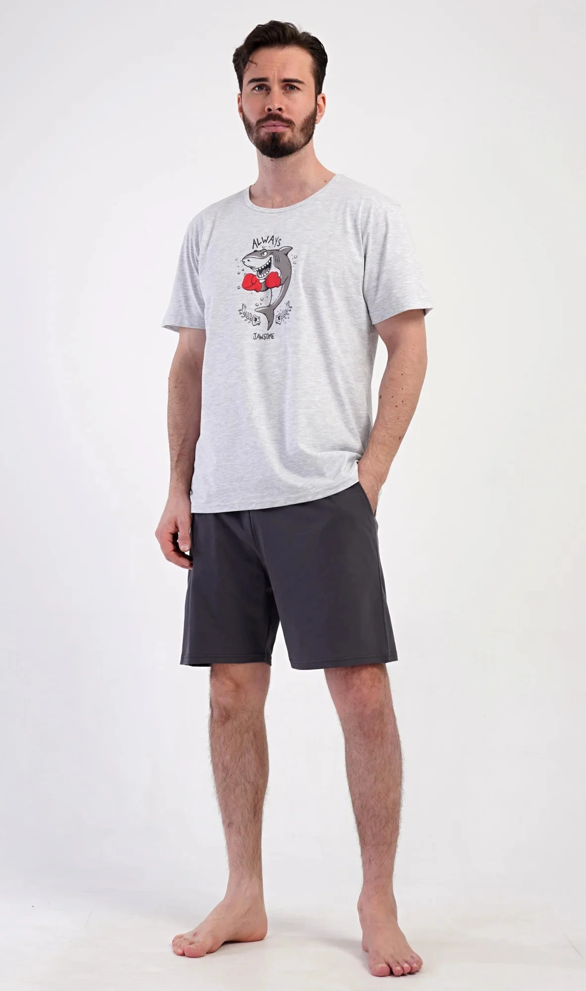 Pánské šortkové pyžamo Žralok. Pánské pyžamo se skládá z trička s krátkým rukávem a krátkých šortkových kalhot. Na tričku je obrázek žraloka. Šortky mají kapsy, v pase gumu a šňůrku na stáhnutí. Použitý materiál je příjemný a poddaný na dotek. Obsah bavlny u trička je 70% a u šortek 100%. Pyžamo je vhodné i na denní nošení a oceníte ho obzvlášť v horkých letních dnech.