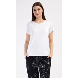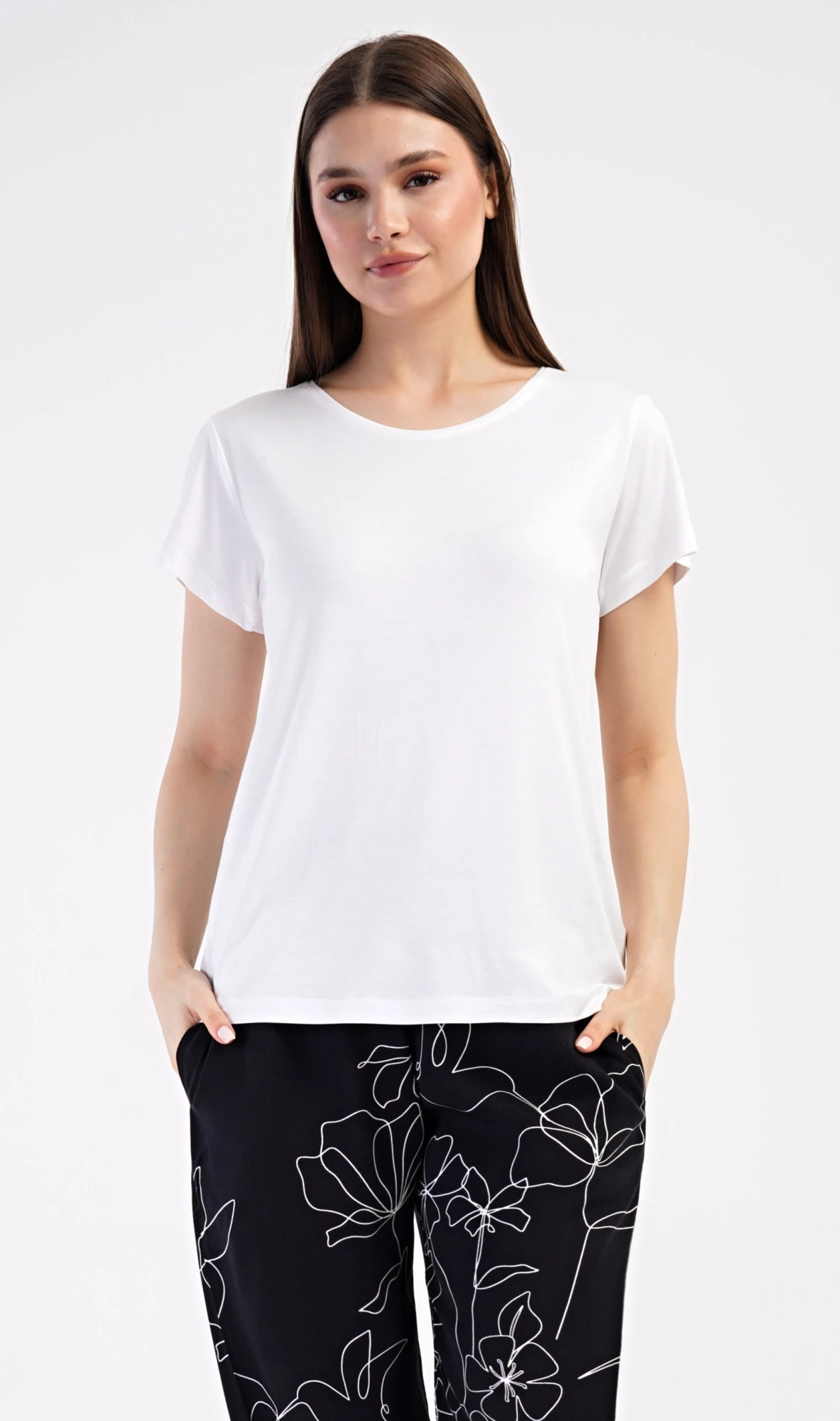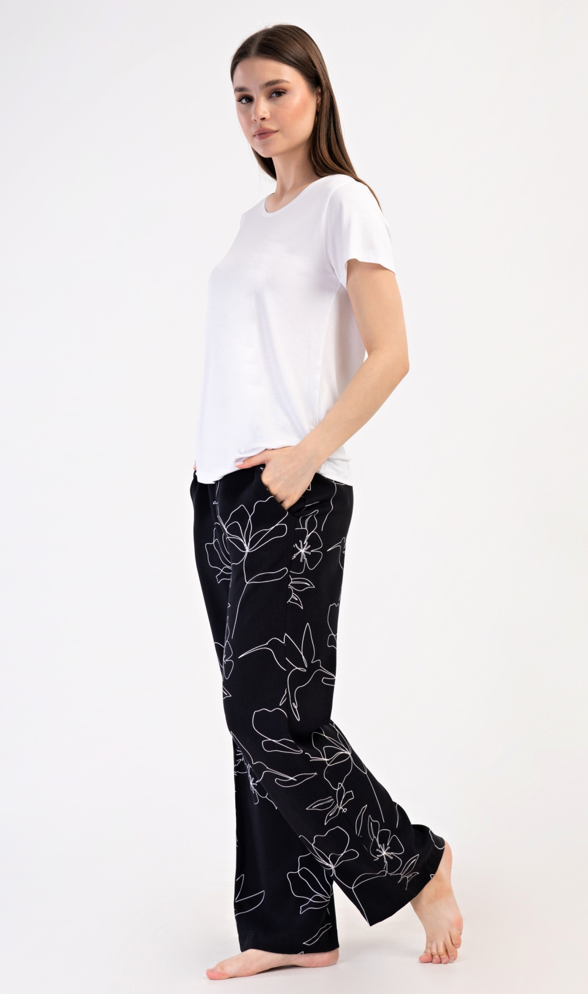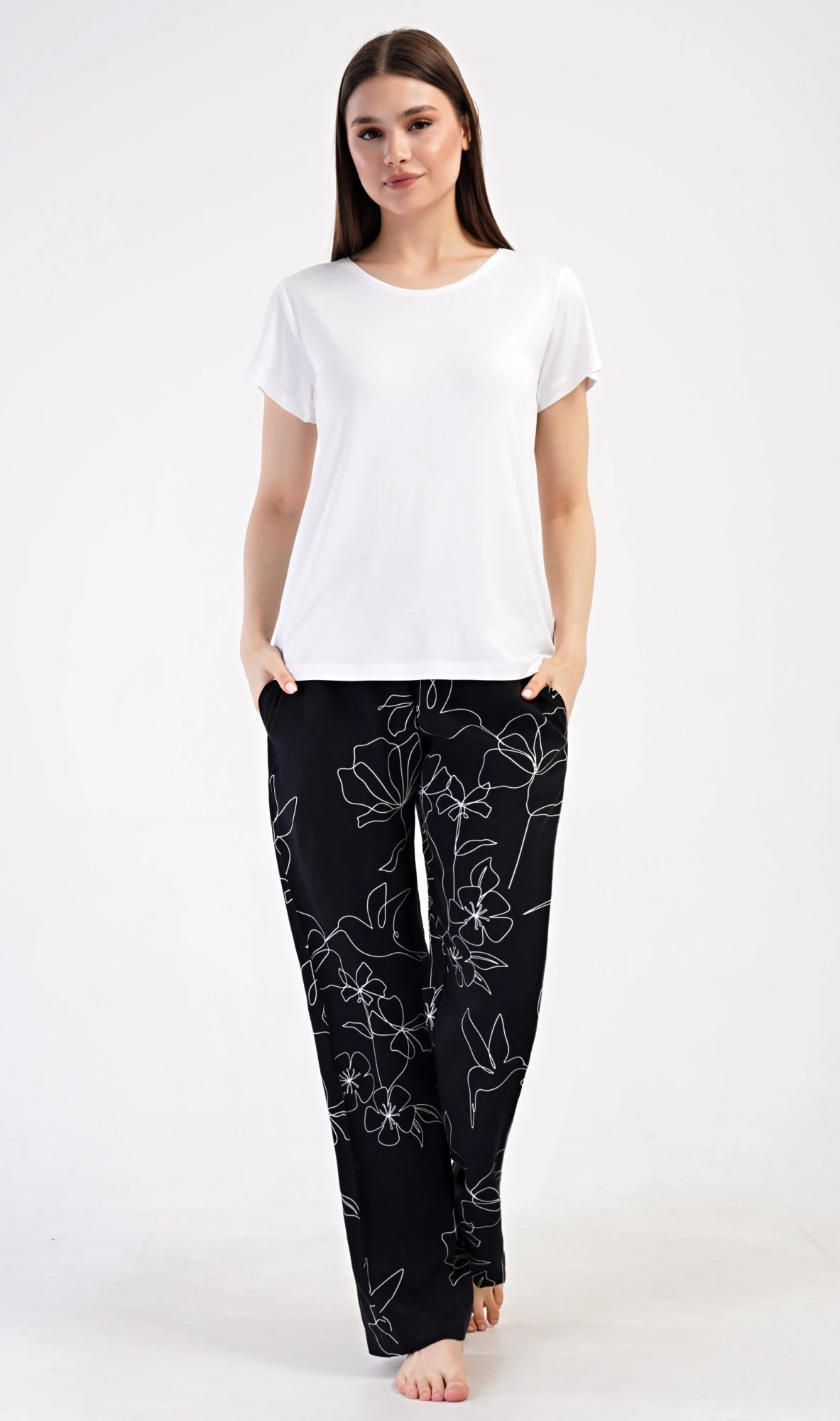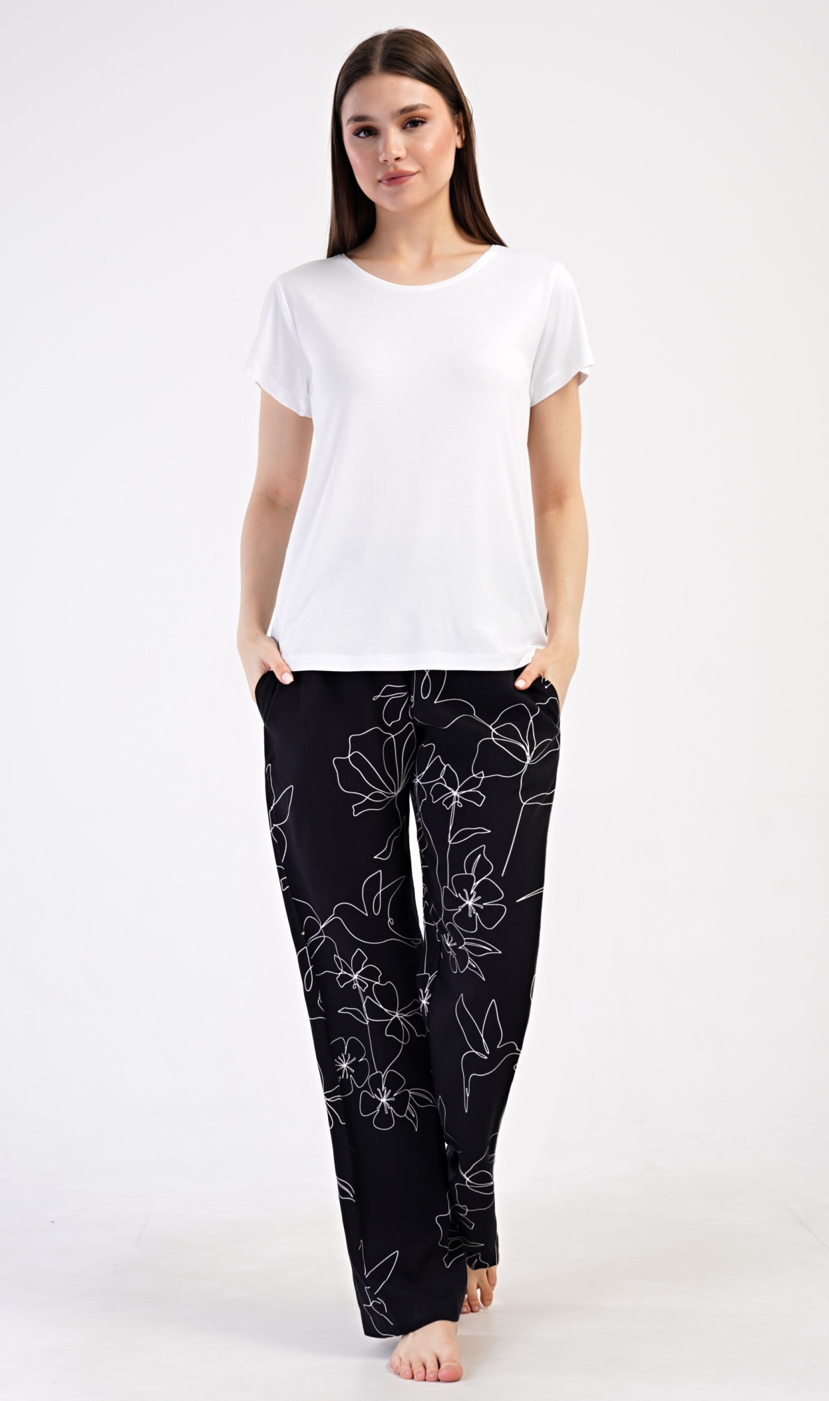 Dámské pyžamo s krátkým rukávem Fiona. Dámské pyžamo se skládá z trika s krátkým rukávem a dlouhých kalhot. Triko je jednobarevné, bez potisku, má kulatý výstřih. Kalhoty potištěné květinovým vzorem mají v pase gumu a šňůrku na stažení, nemají kapsy. Použitý viskózový materiál je poddajný a příjemný na dotek.