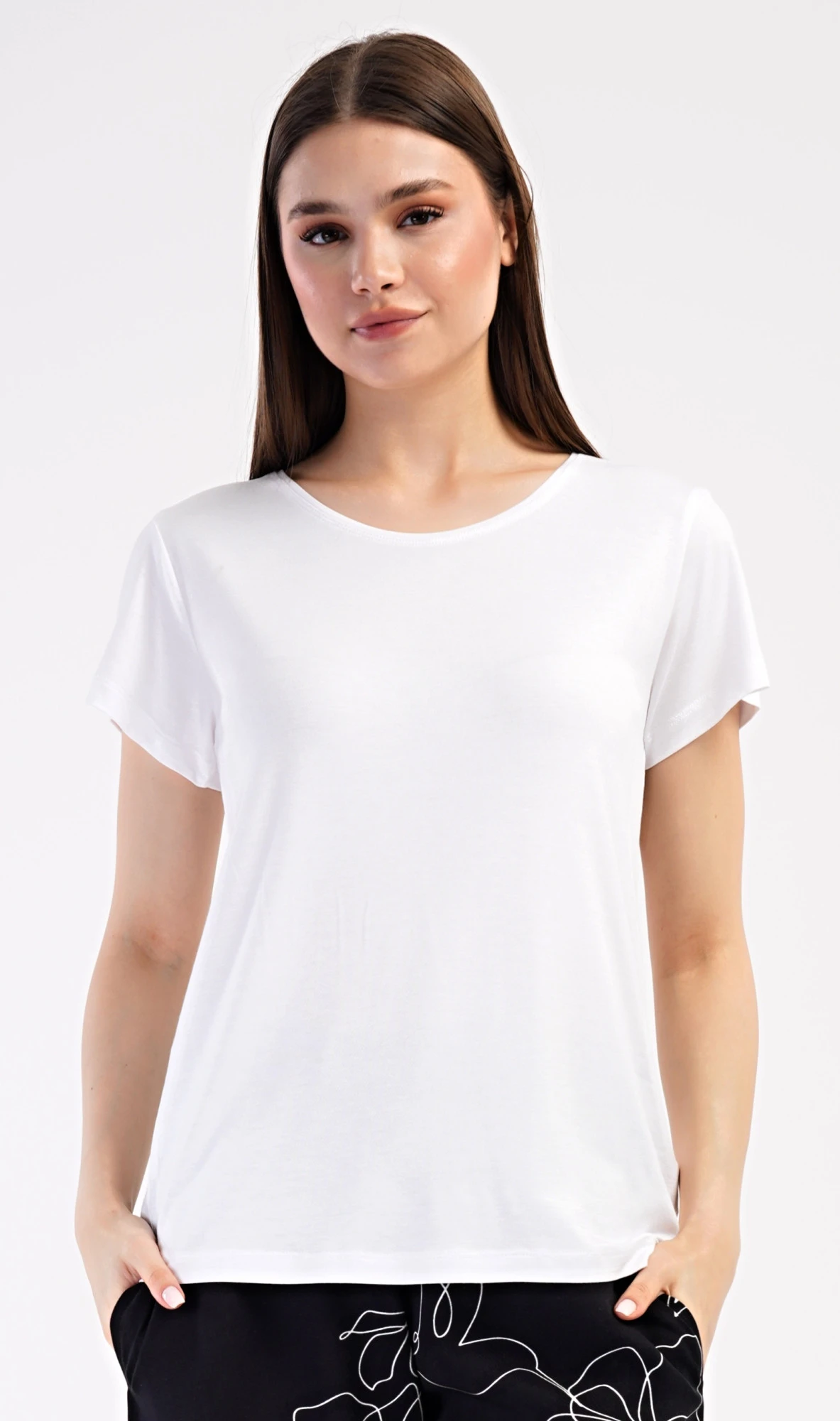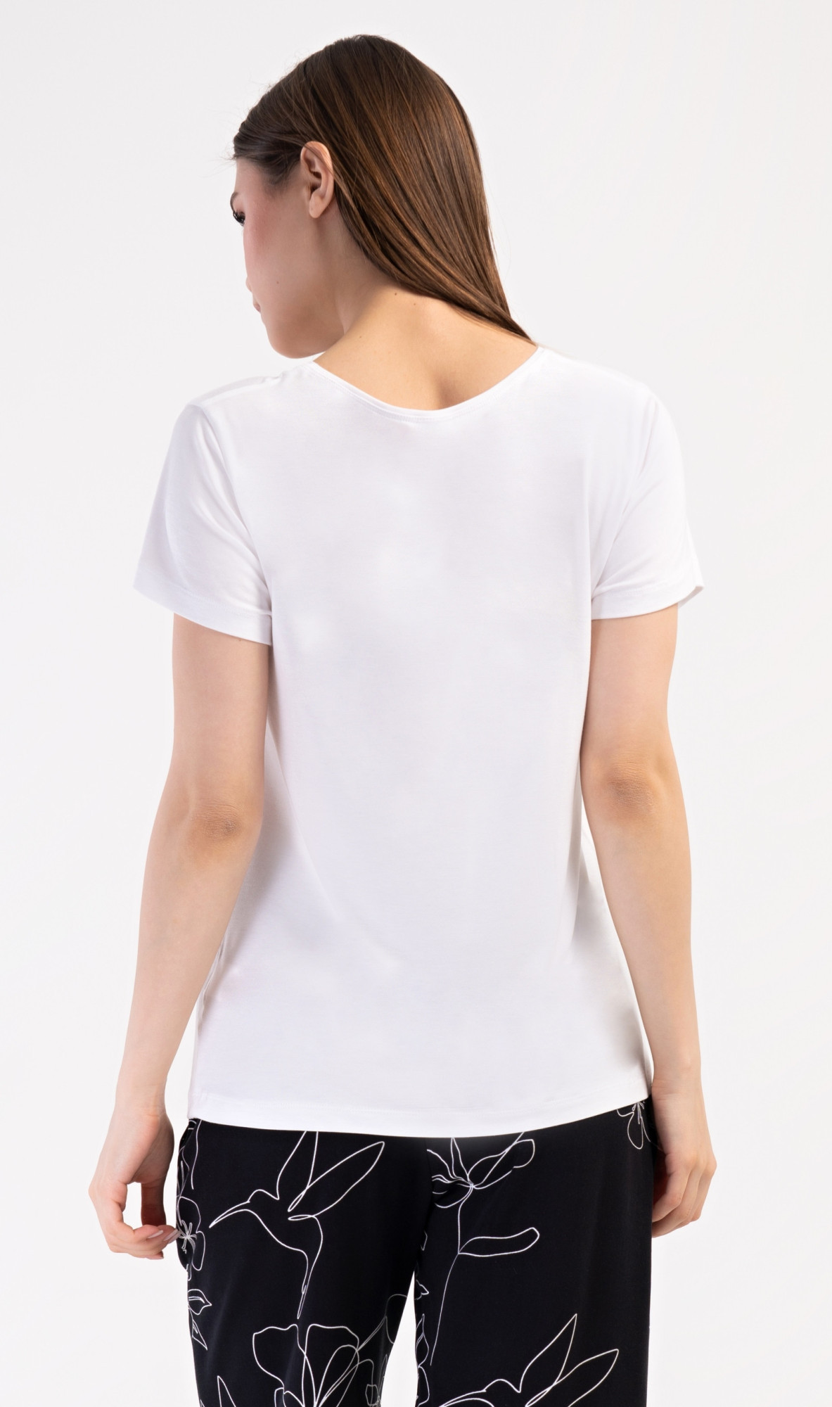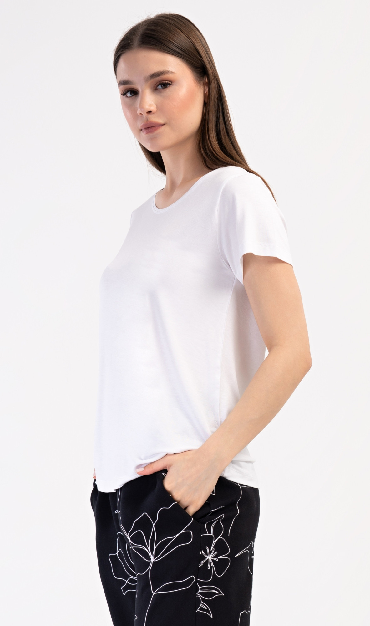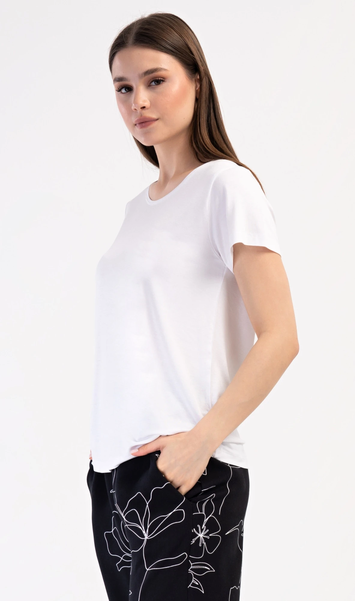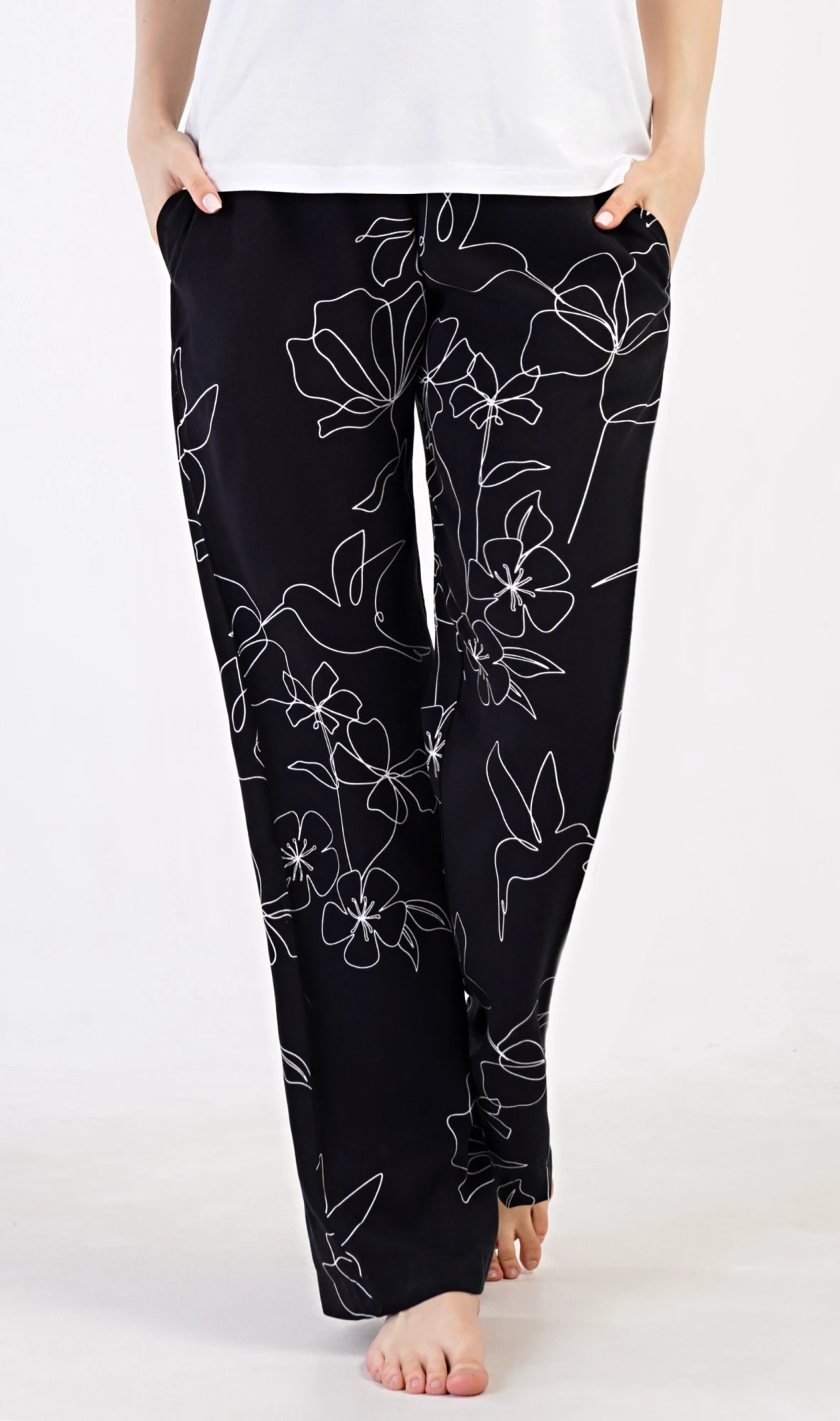 Dámské pyžamo s krátkým rukávem Fiona. Dámské pyžamo se skládá z trika s krátkým rukávem a dlouhých kalhot. Triko je jednobarevné, bez potisku, má kulatý výstřih. Kalhoty potištěné květinovým vzorem mají v pase gumu a šňůrku na stažení, nemají kapsy. Použitý viskózový materiál je poddajný a příjemný na dotek.