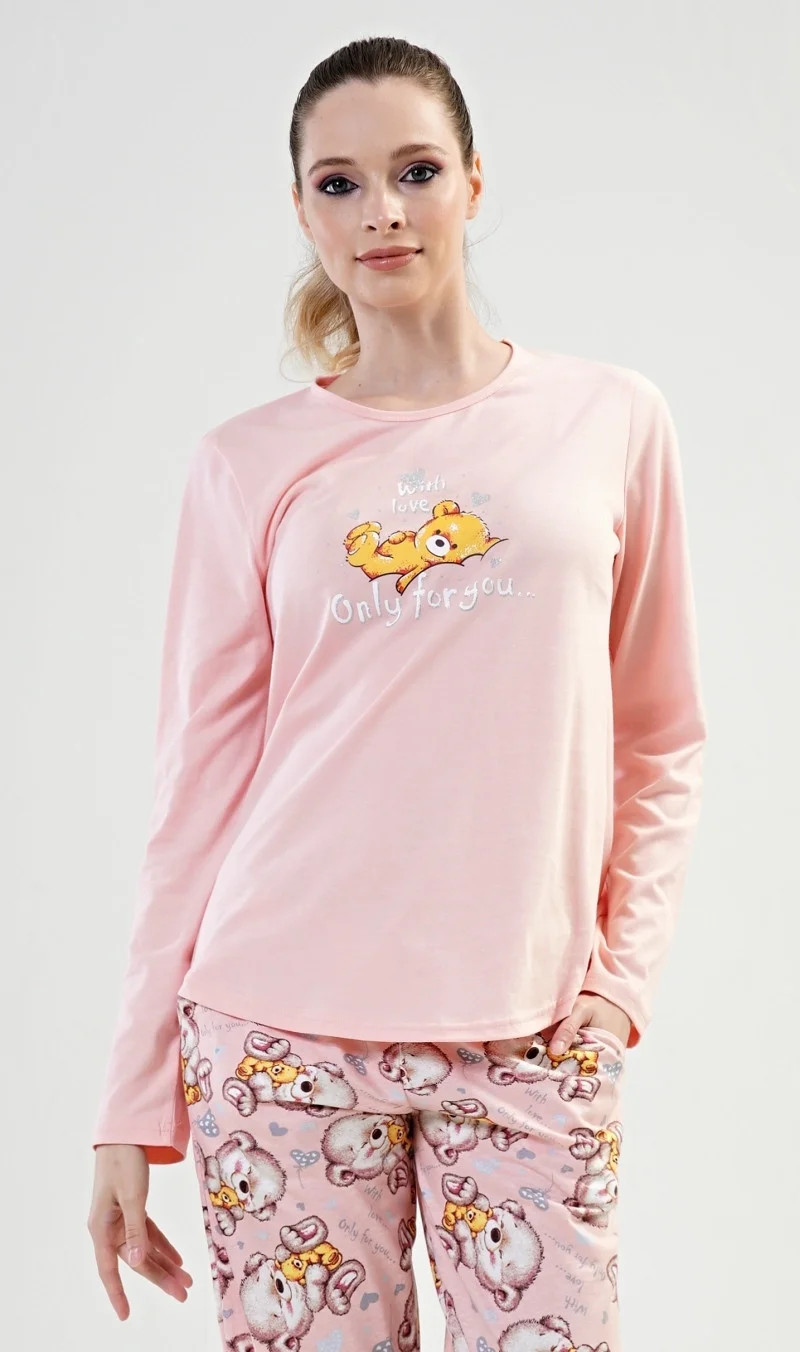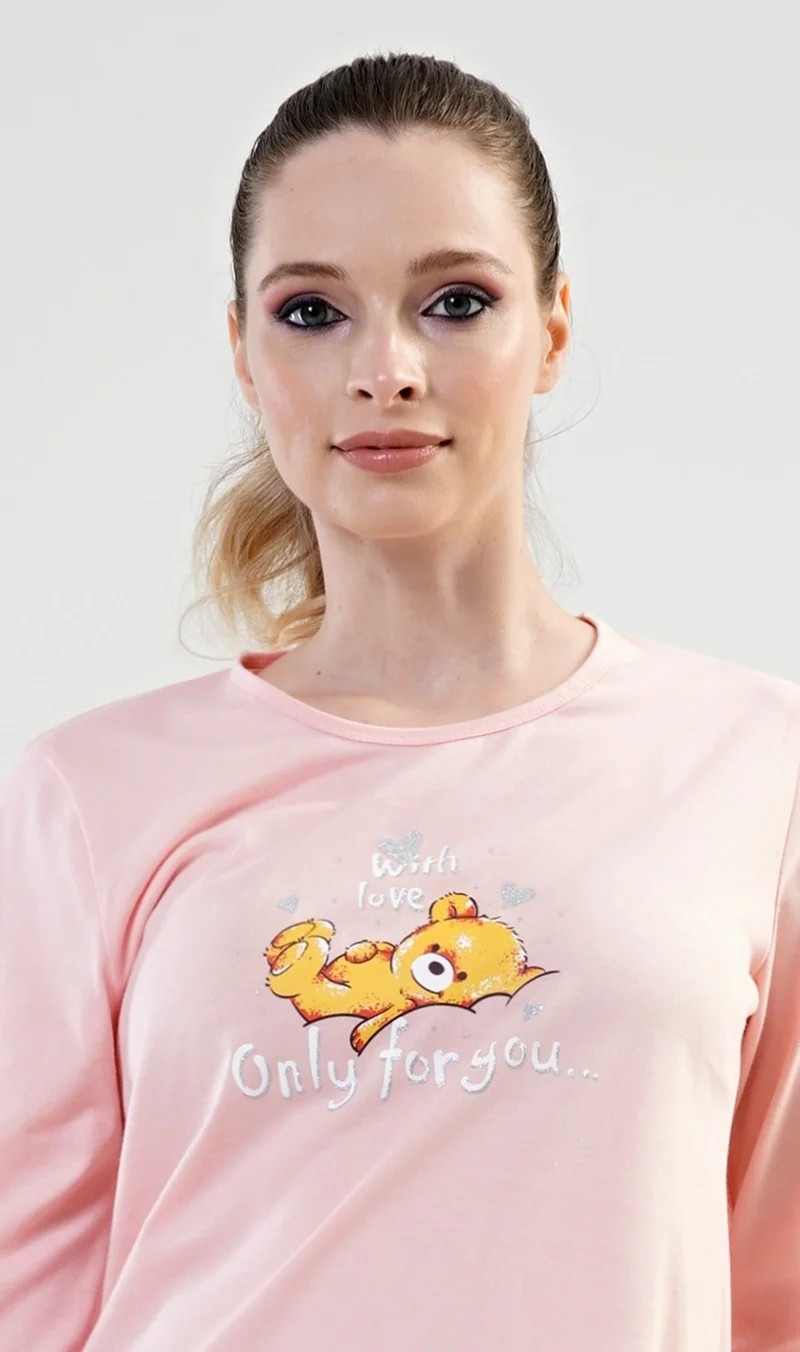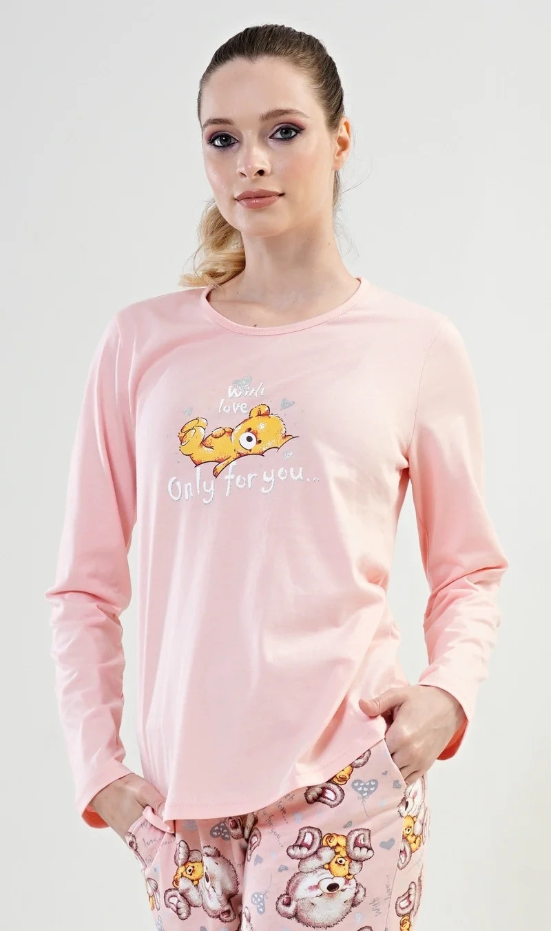Dámské bavlněné pyžamo dlouhé Only for you. Dámské pyžamo se skládá z trička s dlouhým rukávem a dlouhých kalhot. Triko je jednobarevné, zdobené potiskem ležícího plyšového medvěda a nápisem Only for you. Kalhoty jsou světle lososové, potištěné plyšovými medvědy. Kalhoty jsou do gumy, na stažení šňůrkou a mají kapsy. Použitý materiál je poddajný a jemný na dotek.