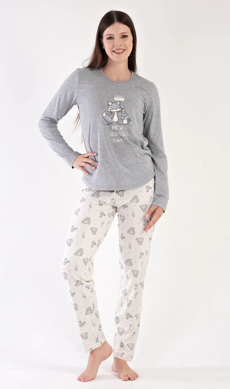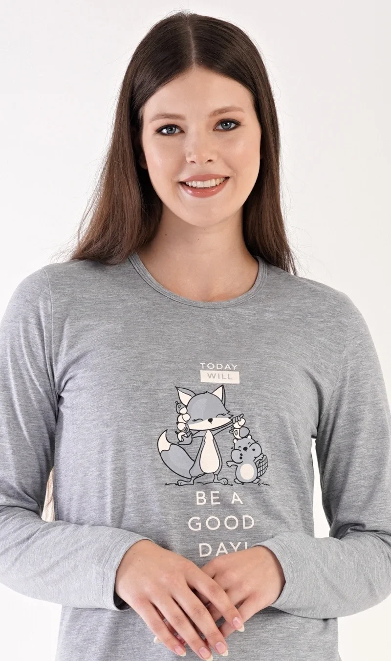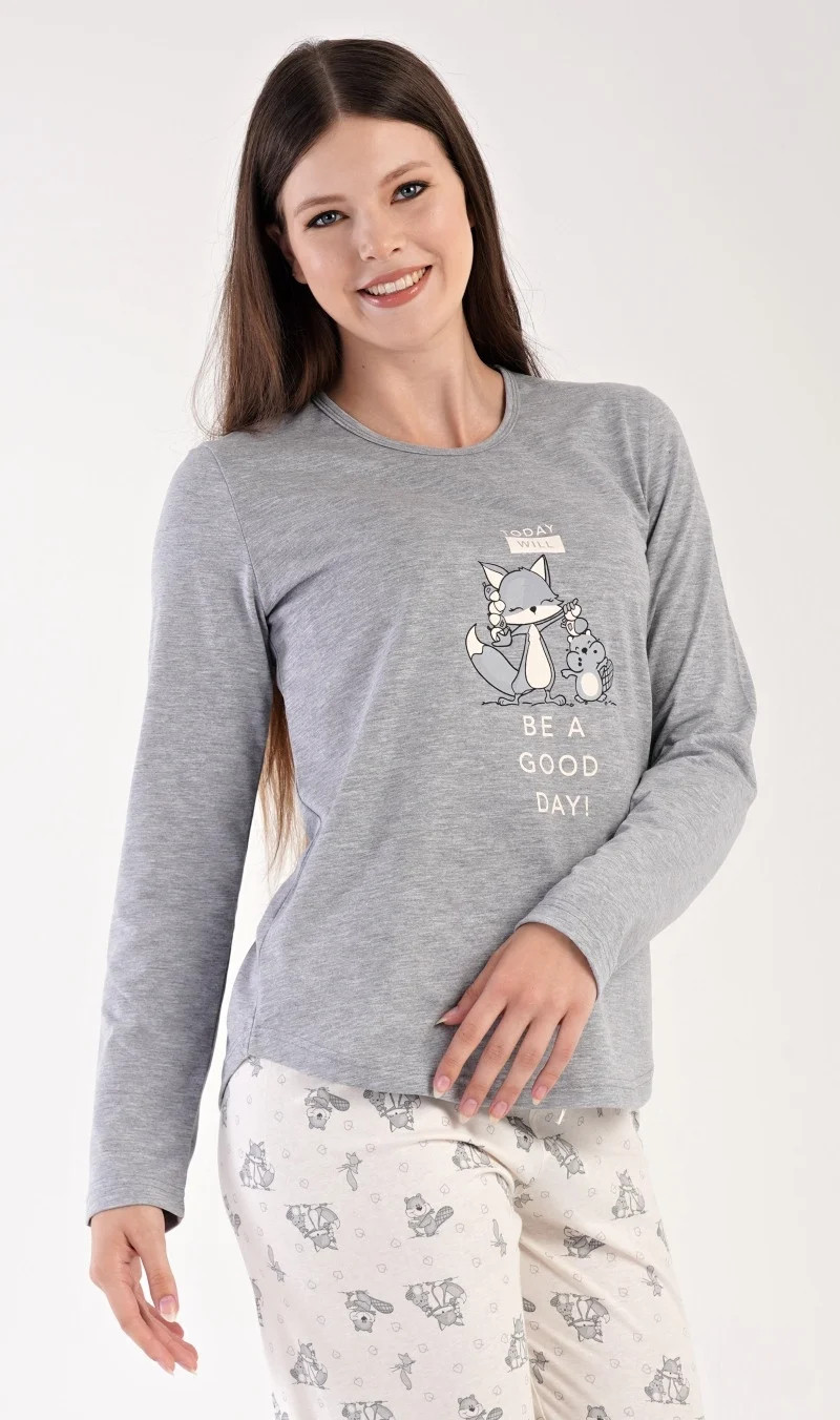 Dámské pyžamo dlouhé Forest party. Dámské pyžamo se skládá z trika s dlouhým rukávem a dlouhých kalhot. Triko je jednobarevné, zdobené obrázkem zvířátek v lese a nápisem TODAY WILL BE A GOOD DAY. Kalhoty jsou světle šedé, také potištěné zvířátky. Kalhoty mají v pase gumu a šňůrku na stažení. Použitý materiál je poddajný a příjemný na dotek.
