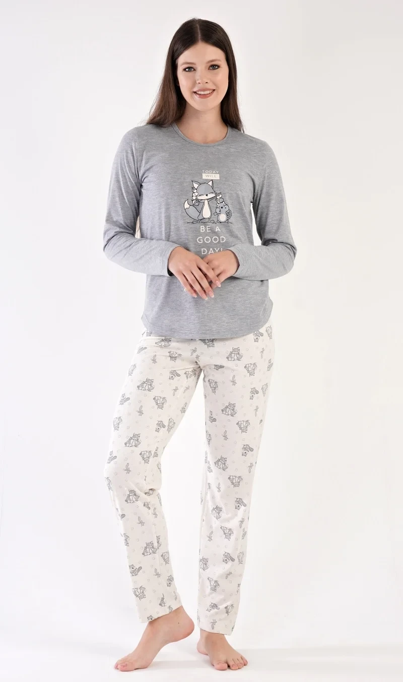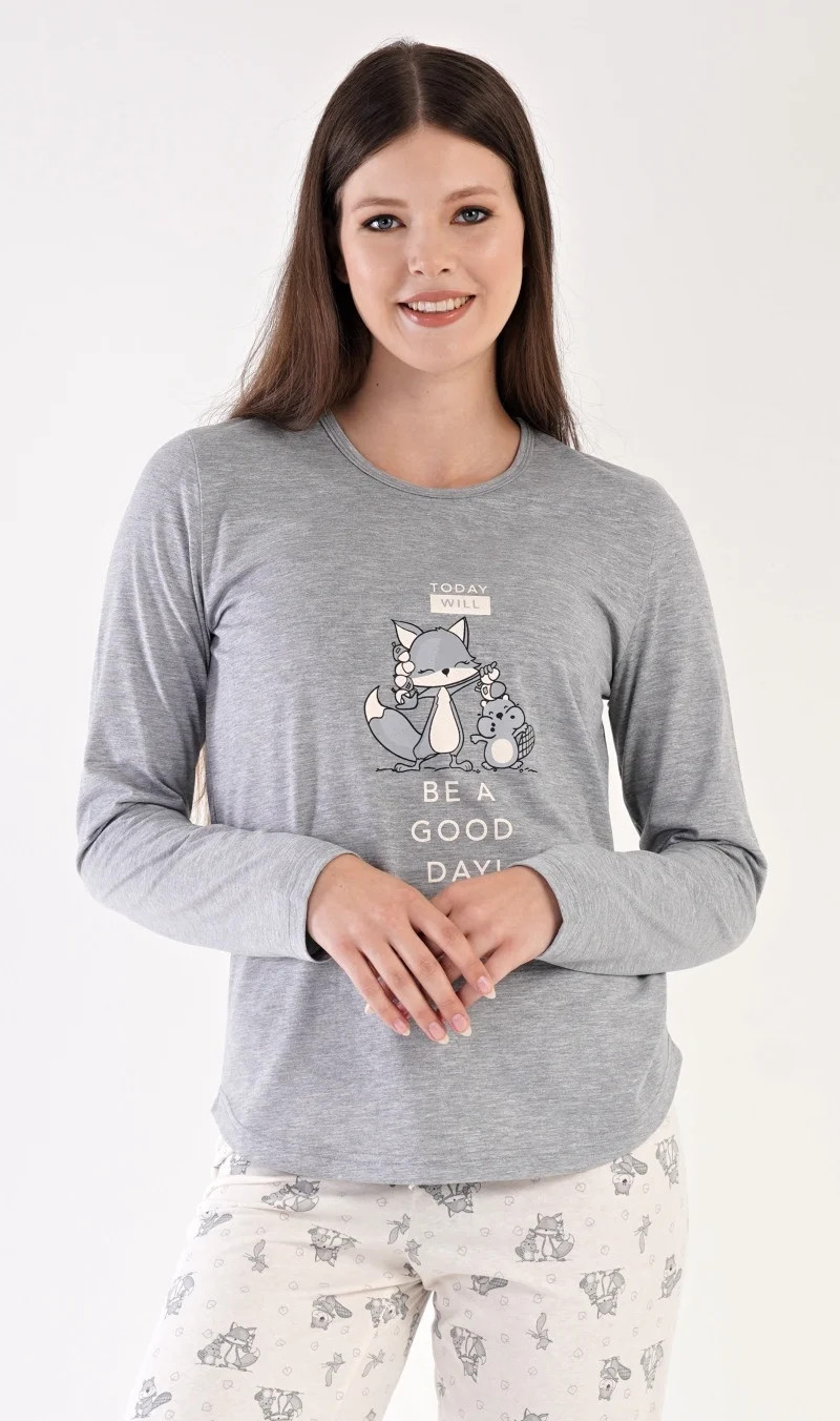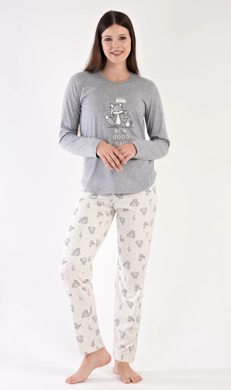 Dámské pyžamo dlouhé Forest party. Dámské pyžamo se skládá z trika s dlouhým rukávem a dlouhých kalhot. Triko je jednobarevné, zdobené obrázkem zvířátek v lese a nápisem TODAY WILL BE A GOOD DAY. Kalhoty jsou světle šedé, také potištěné zvířátky. Kalhoty mají v pase gumu a šňůrku na stažení. Použitý materiál je poddajný a příjemný na dotek.