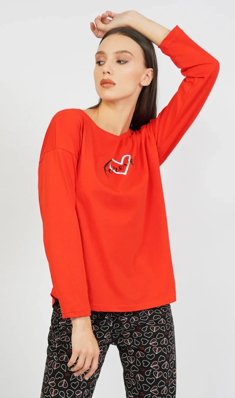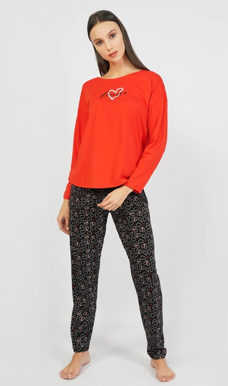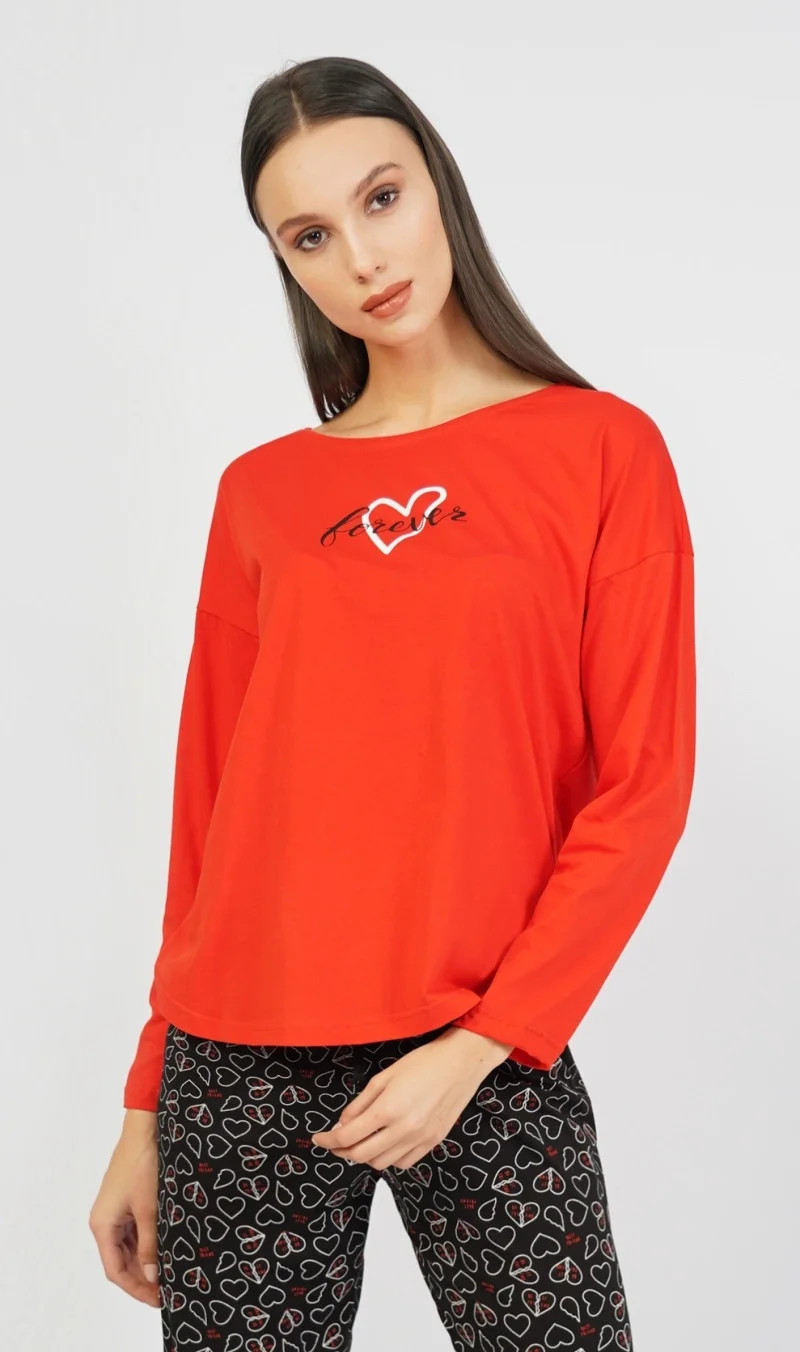 Dámské pyžamo dlouhé Forever. Dámské pyžamo dlouhé Forever se skládá z trička s dlouhým rukávem a dlouhých nohavic. Na jednobarevném tričku je malý obrázek srdíčka, který se opakuje i na dlouhých kalhotách. Použitý materiál je jemný a poddajný na dotek.