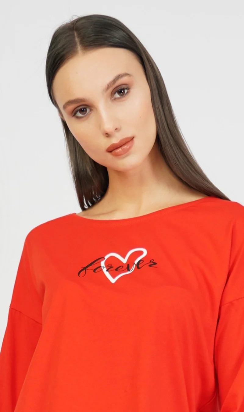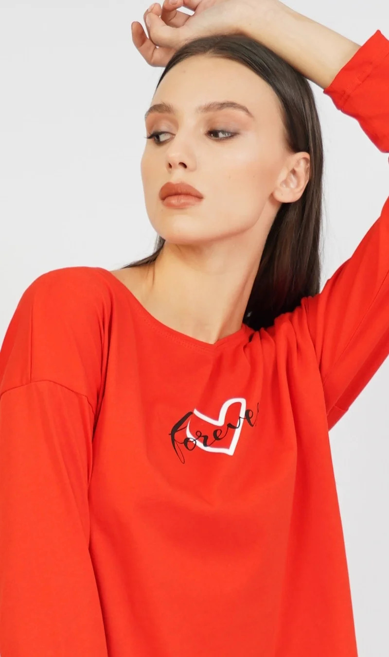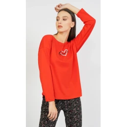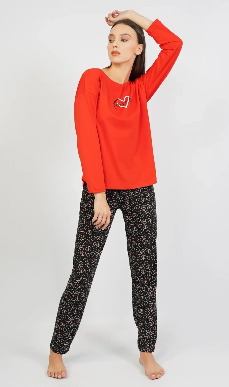Dámské pyžamo dlouhé Forever. Dámské pyžamo dlouhé Forever se skládá z trička s dlouhým rukávem a dlouhých nohavic. Na jednobarevném tričku je malý obrázek srdíčka, který se opakuje i na dlouhých kalhotách. Použitý materiál je jemný a poddajný na dotek.