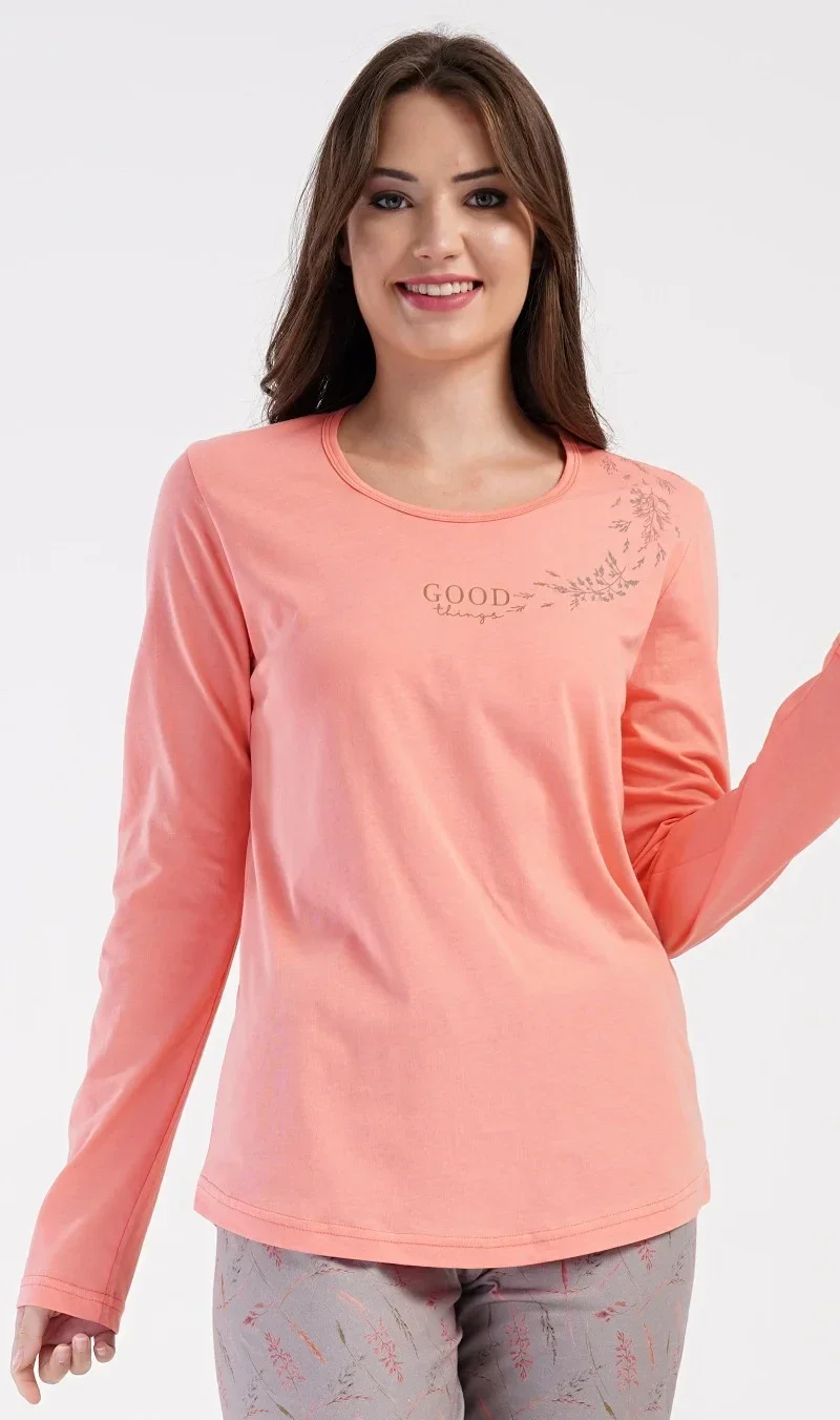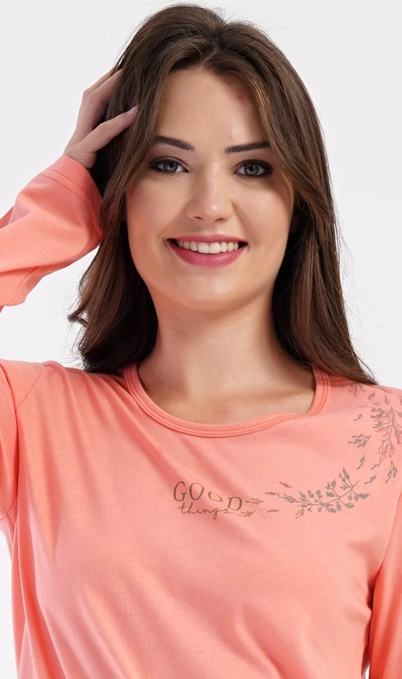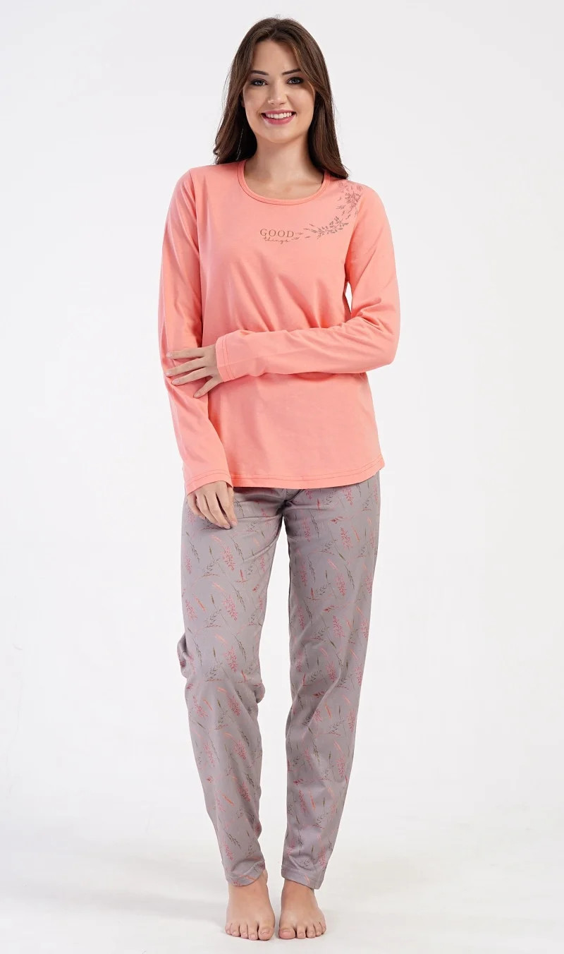 Dámské bavlněné dlouhé pyžamo Good things. Dámské pyžamo se skládá z trika s dlouhým rukávem a dlouhých kalhot. Triko je jednobarevné, zdobené menším obrázkem a nápisem 'Good things'. Kalhoty mají v pase gumu a šňůrku na stažení, nemají kapsy. Použitý bavlněný materiál je poddajný a příjemný na dotek.