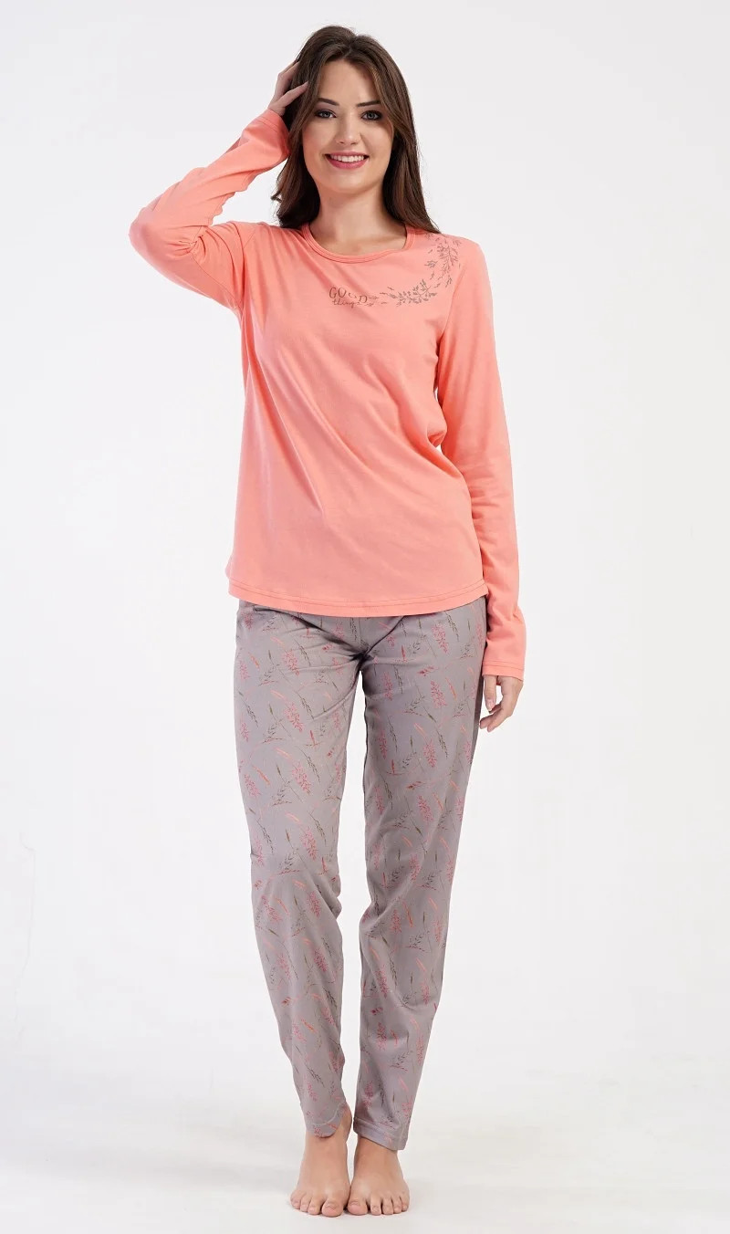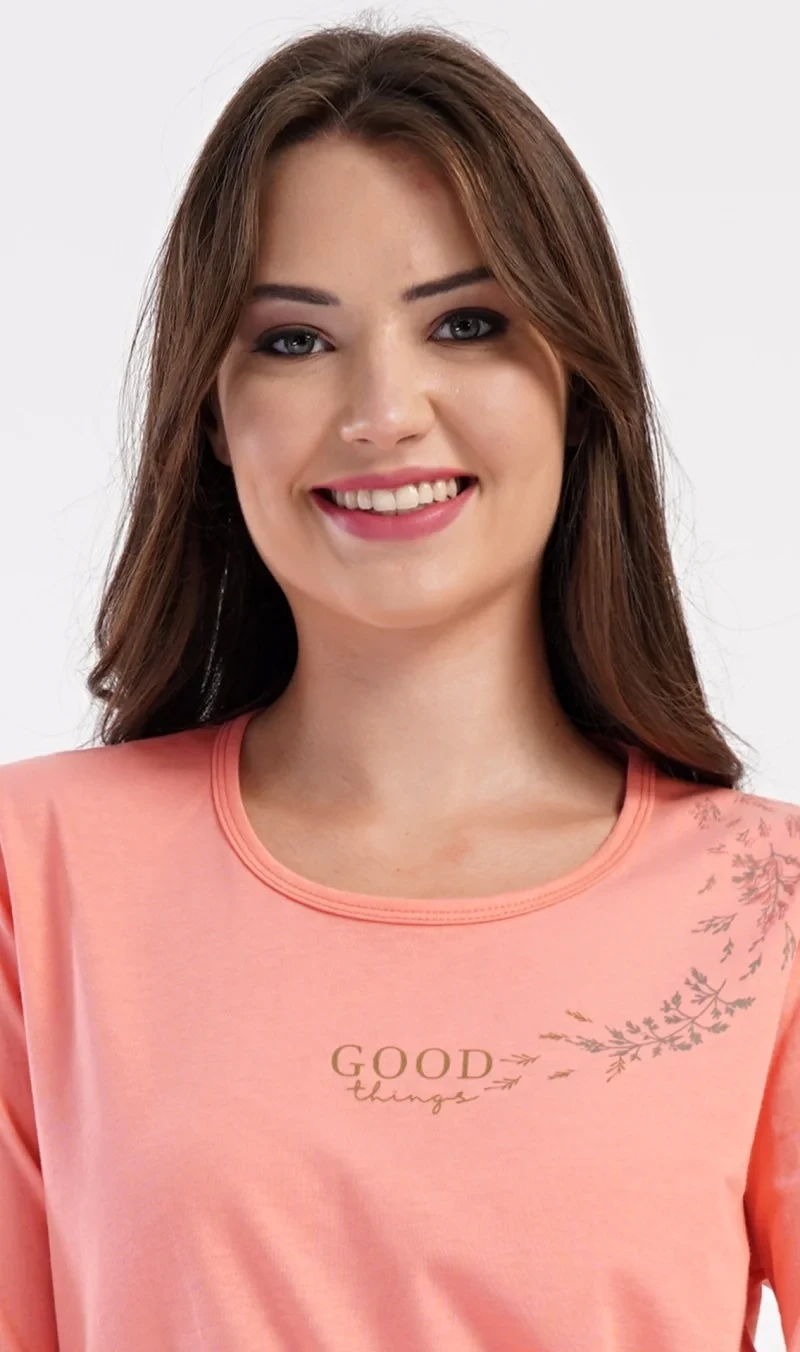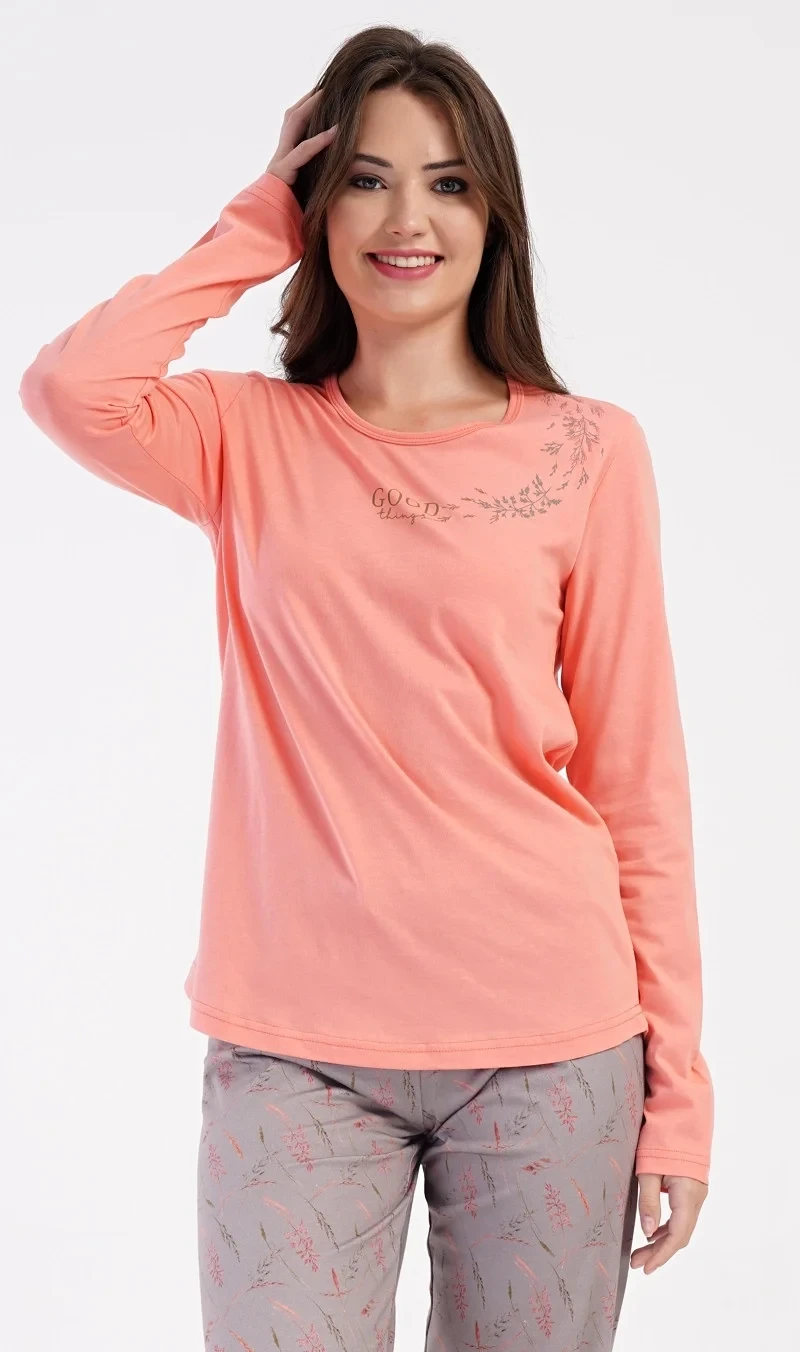 Dámské bavlněné dlouhé pyžamo Good things. Dámské pyžamo se skládá z trika s dlouhým rukávem a dlouhých kalhot. Triko je jednobarevné, zdobené menším obrázkem a nápisem 'Good things'. Kalhoty mají v pase gumu a šňůrku na stažení, nemají kapsy. Použitý bavlněný materiál je poddajný a příjemný na dotek.