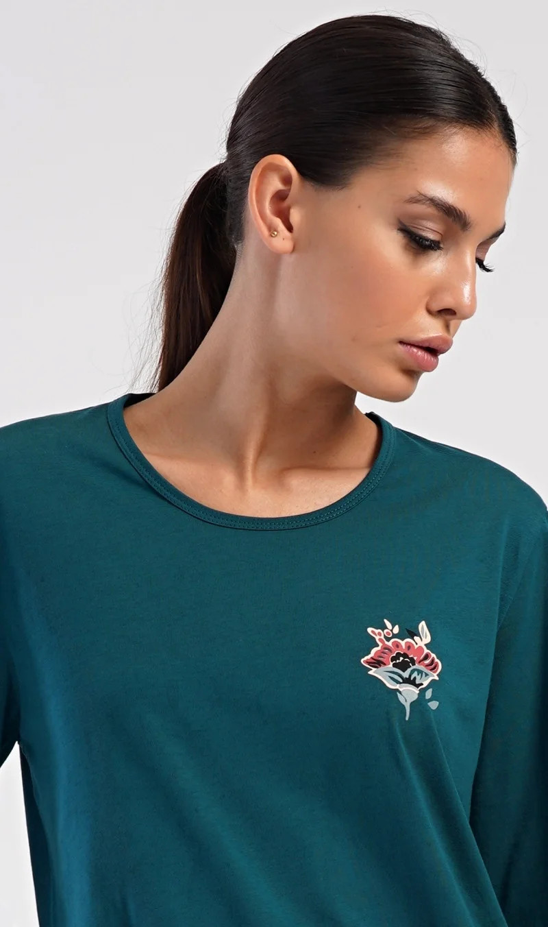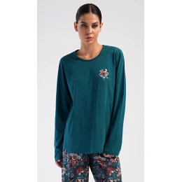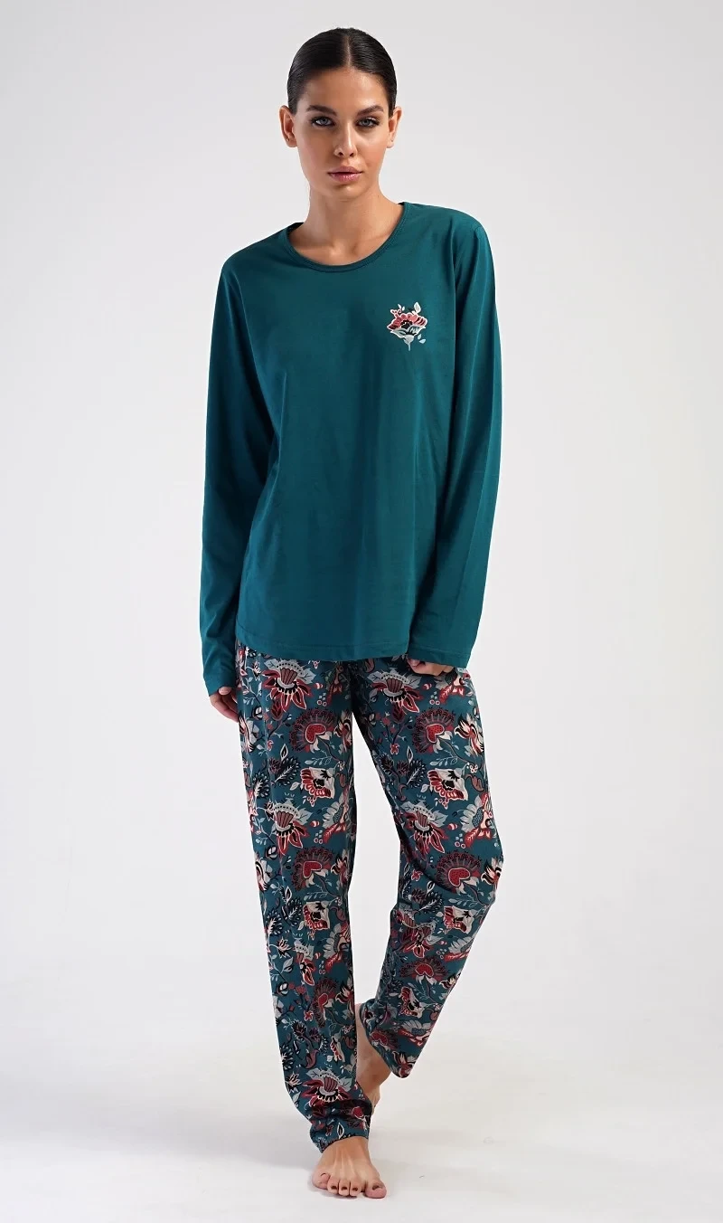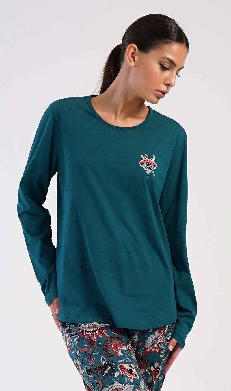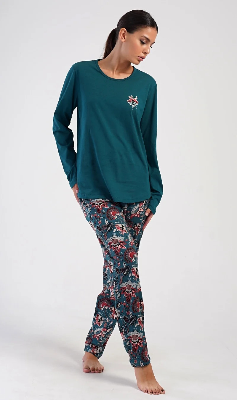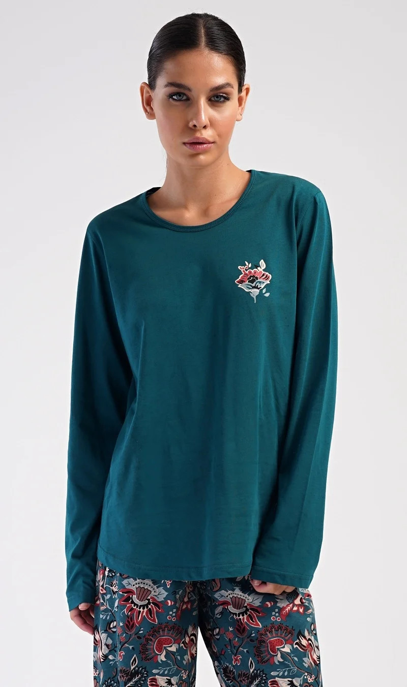 Dámské bavlněné dlouhé pyžamo Ines. Dámské pyžamo se skládá z trika s dlouhým rukávem a dlouhých kalhot. Triko je jednobarevné, zdobené obrázkem orientálního květu. Tento motiv se opakuje i na kalhotách, které mají v pase gumu a šňůrku na stažení, nemají kapsy. Použitý bavlněný materiál je poddajný a příjemný na dotek.