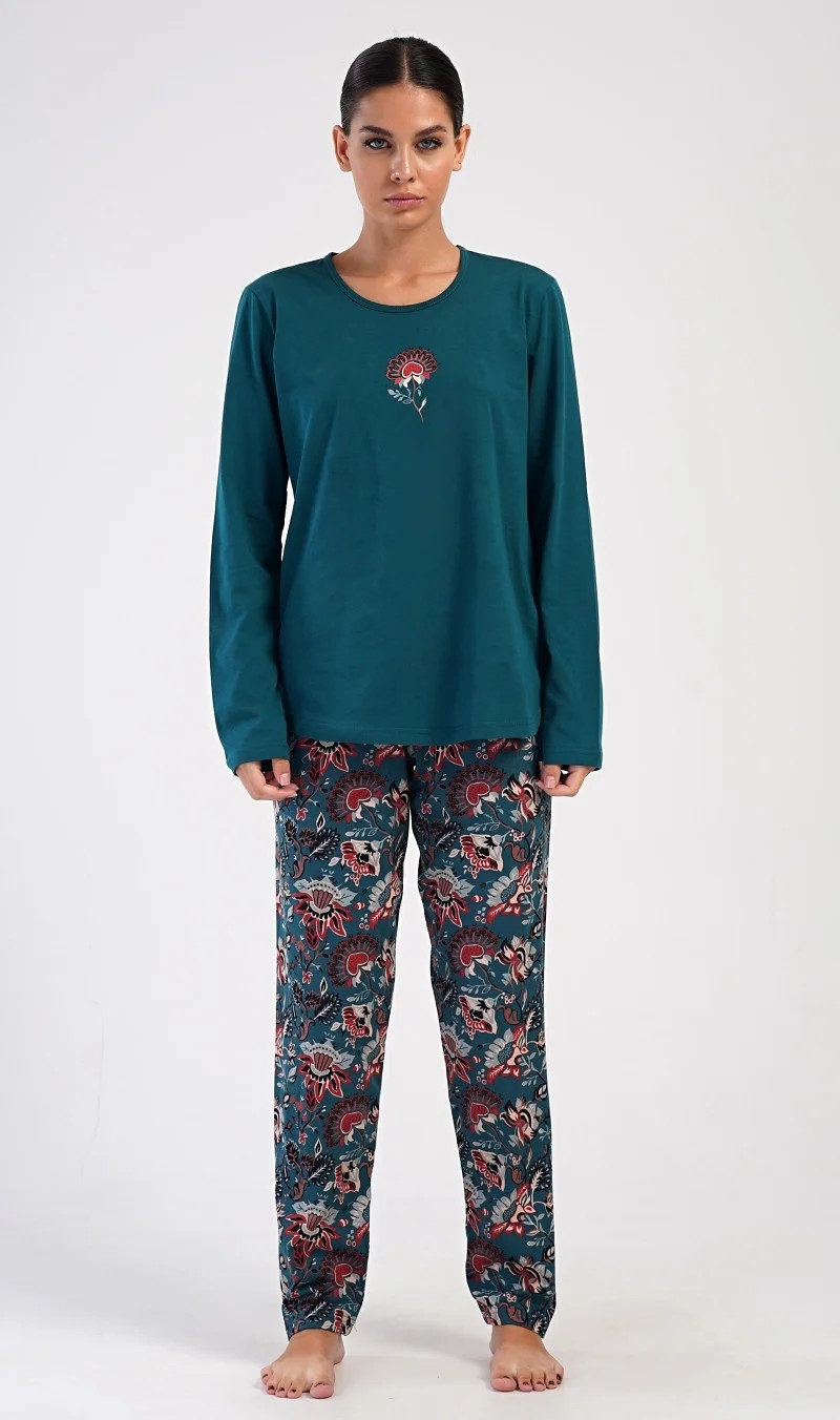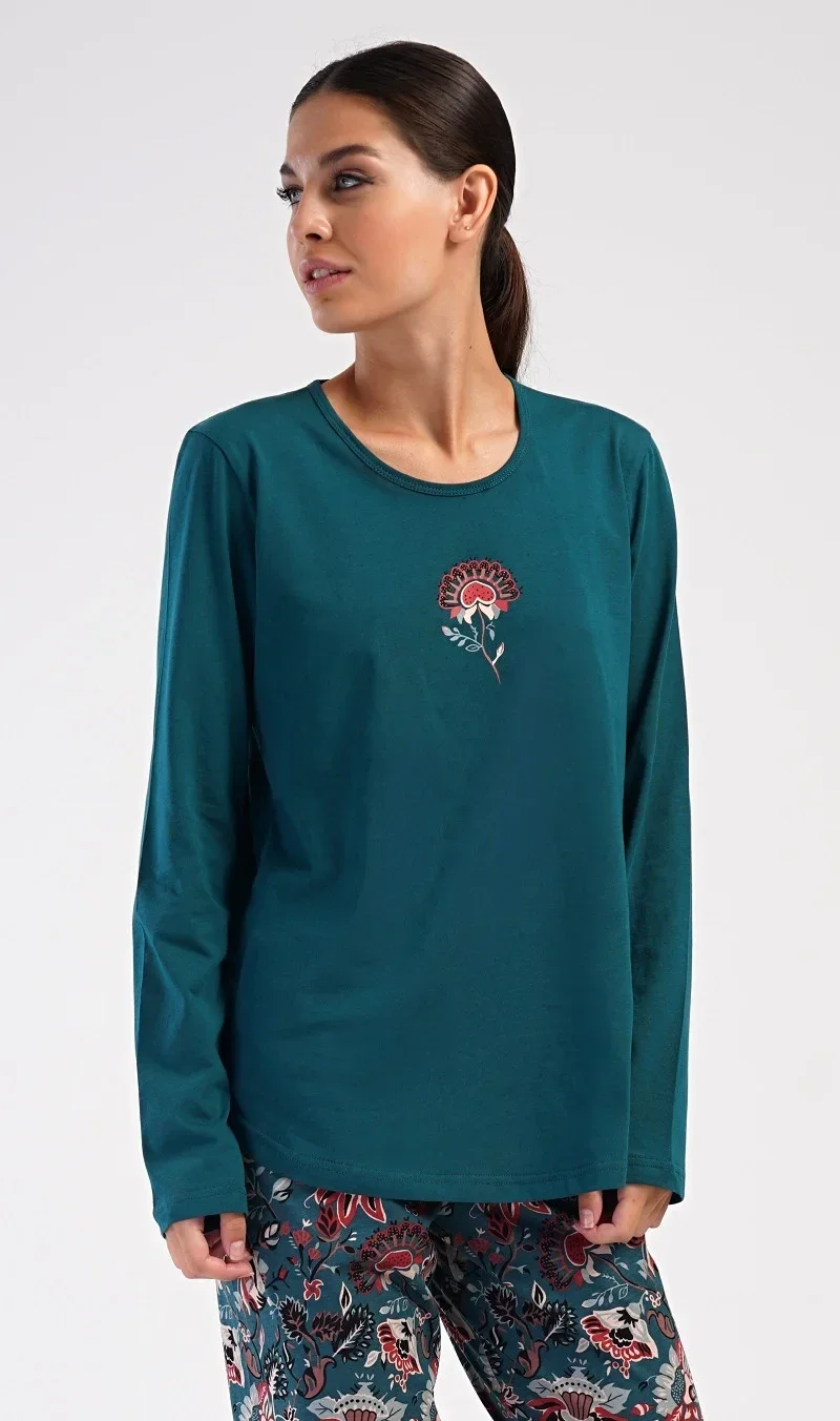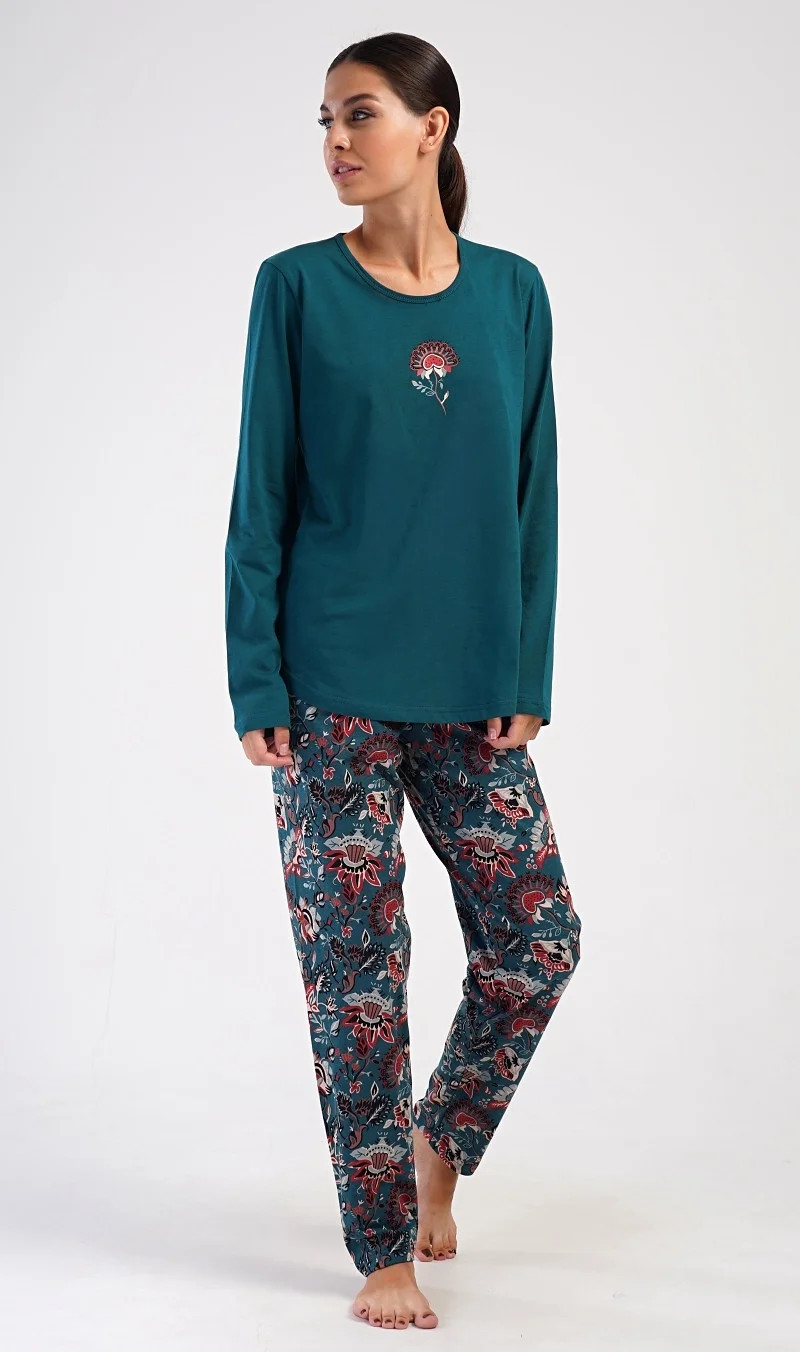 Dámské bavlněné dlouhé pyžamo Jasmína. Dámské pyžamo se skládá z trika s dlouhým rukávem a dlouhých kalhot. Triko je jednobarevné, zdobené obrázkem orientálního květu. Tento motiv se opakuje i na kalhotách, které mají v pase gumu a šňůrku na stažení, nemají kapsy. Použitý bavlněný materiál je poddajný a příjemný na dotek.