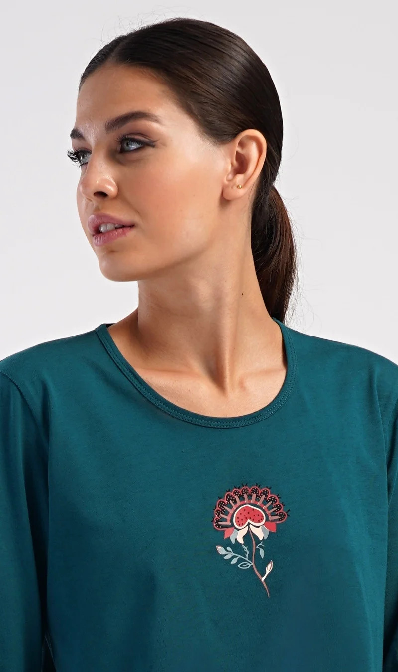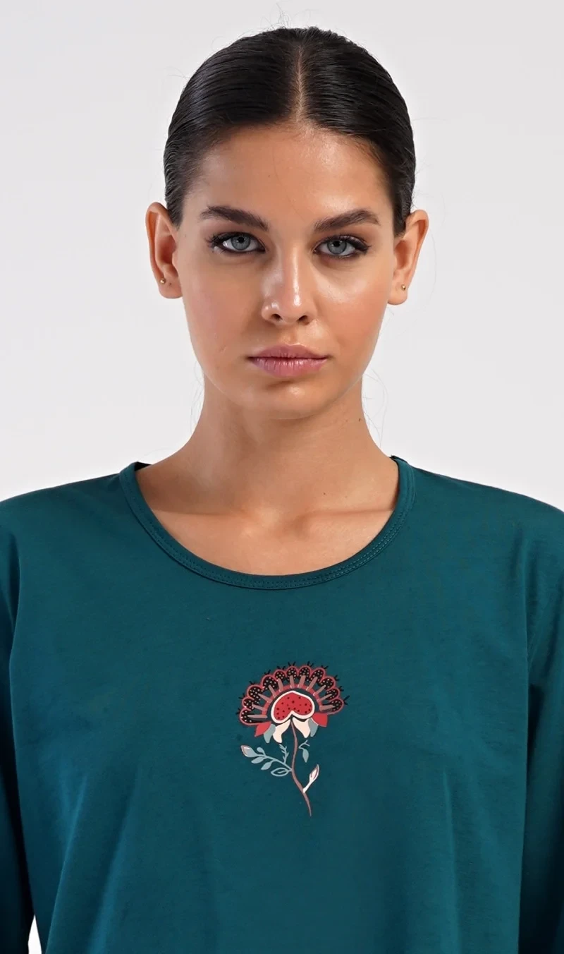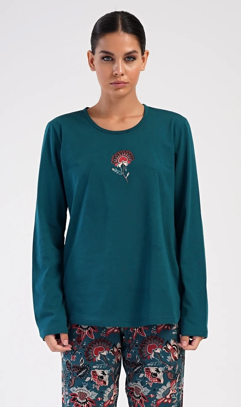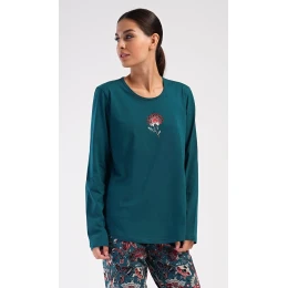 Dámské bavlněné dlouhé pyžamo Jasmína. Dámské pyžamo se skládá z trika s dlouhým rukávem a dlouhých kalhot. Triko je jednobarevné, zdobené obrázkem orientálního květu. Tento motiv se opakuje i na kalhotách, které mají v pase gumu a šňůrku na stažení, nemají kapsy. Použitý bavlněný materiál je poddajný a příjemný na dotek.