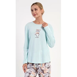 Dámské bavlněné dlouhé pyžamo Jezevec. Dámské pyžamo se skládá z trika s dlouhým rukávem a dlouhých kalhot. Triko s kulatým výstřihem je na hrudi zdobeno obrázkem malého jezevce. Tento motiv se opakuje i na kalhotách, které mají v pase gumu a šňůrku na stažení, nemají kapsy. Použitý bavlněný materiál je poddajný a příjemný na dotek.