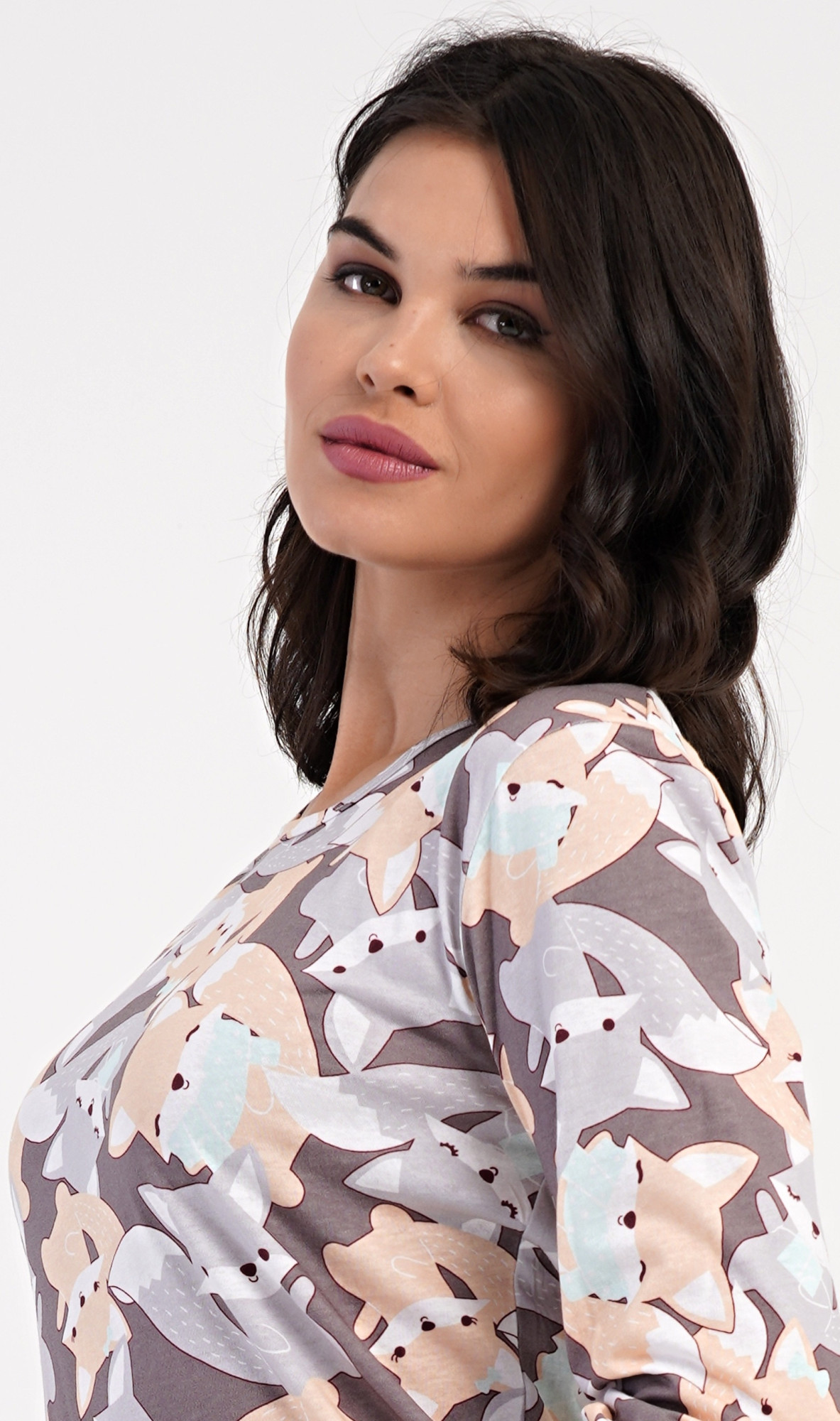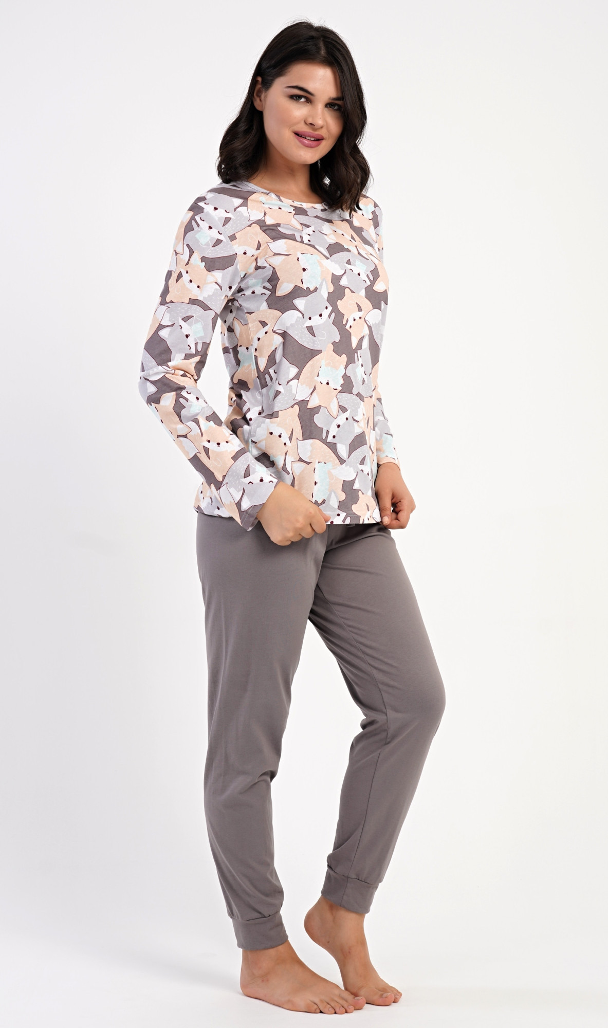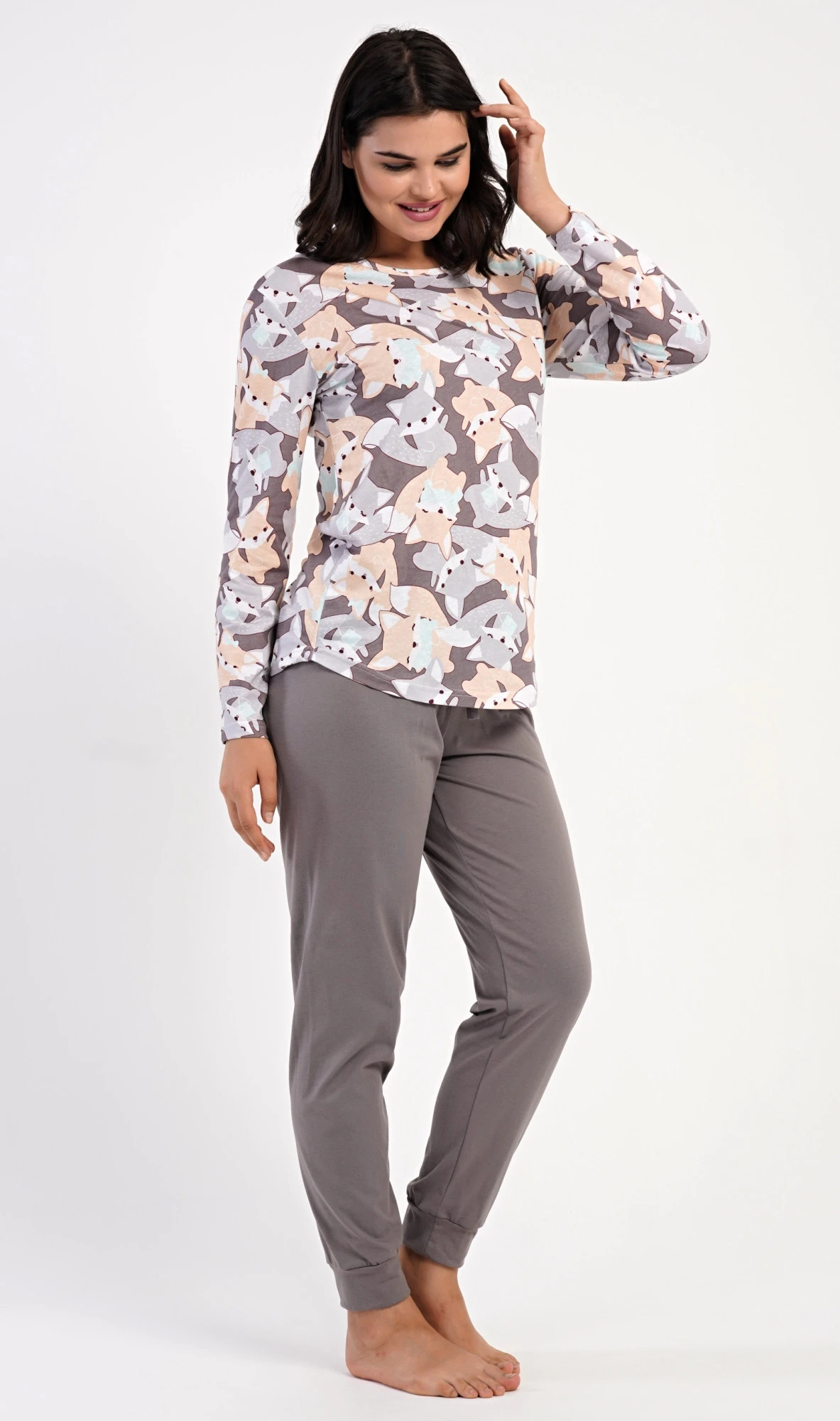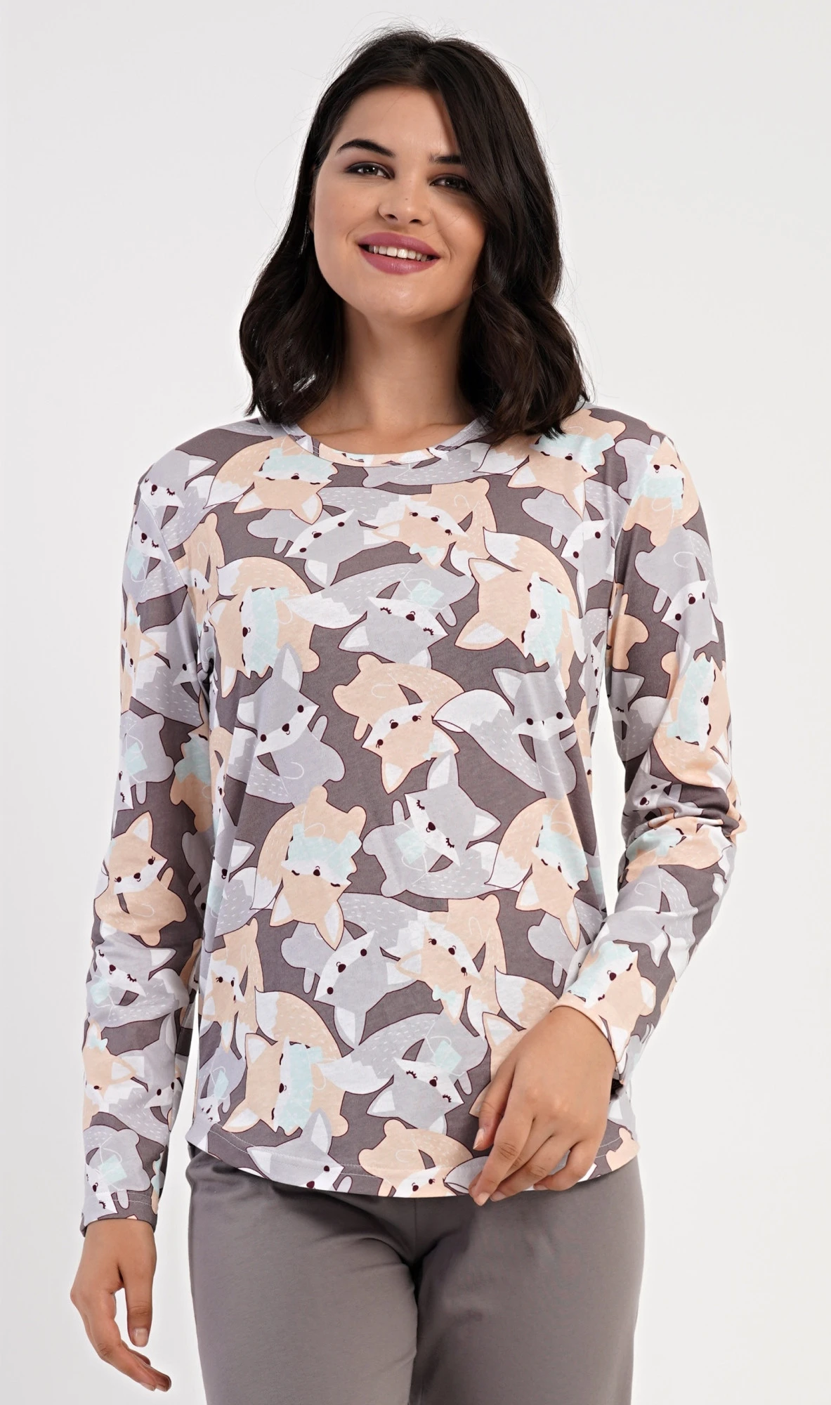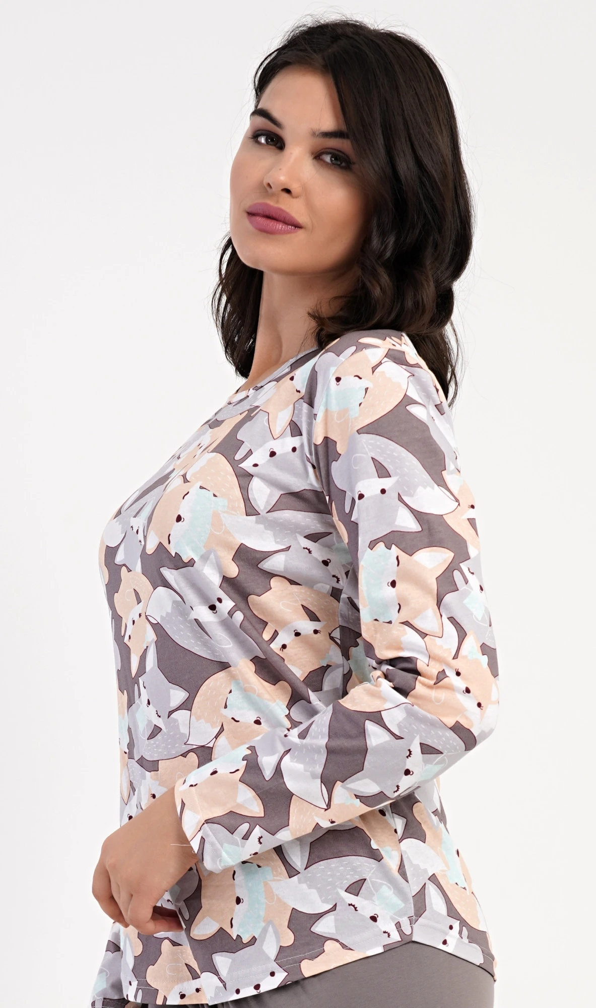 Dámské bavlněné dlouhé pyžamo Kamarádi z lesa. Dámské pyžamo se skládá z trika s dlouhým rukávem a dlouhých kalhot. Triko s kulatým výstřihem je potištěno obrázky lišek a jezevců. Jednobarevné kalhoty mají v pase gumu a šňůrku na stažení, nemají kapsy. Použitý bavlněný materiál je poddajný a příjemný na dotek.