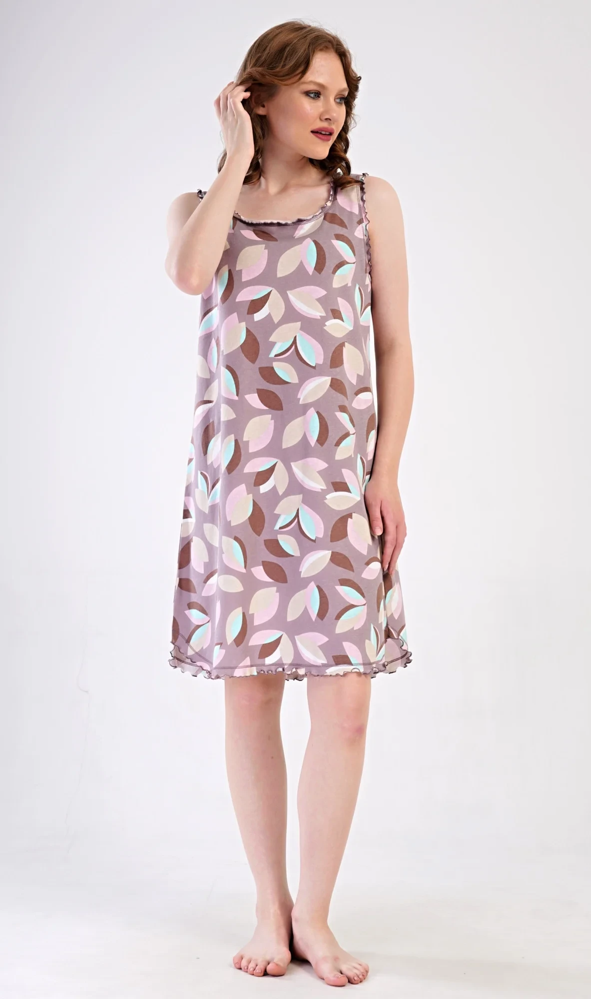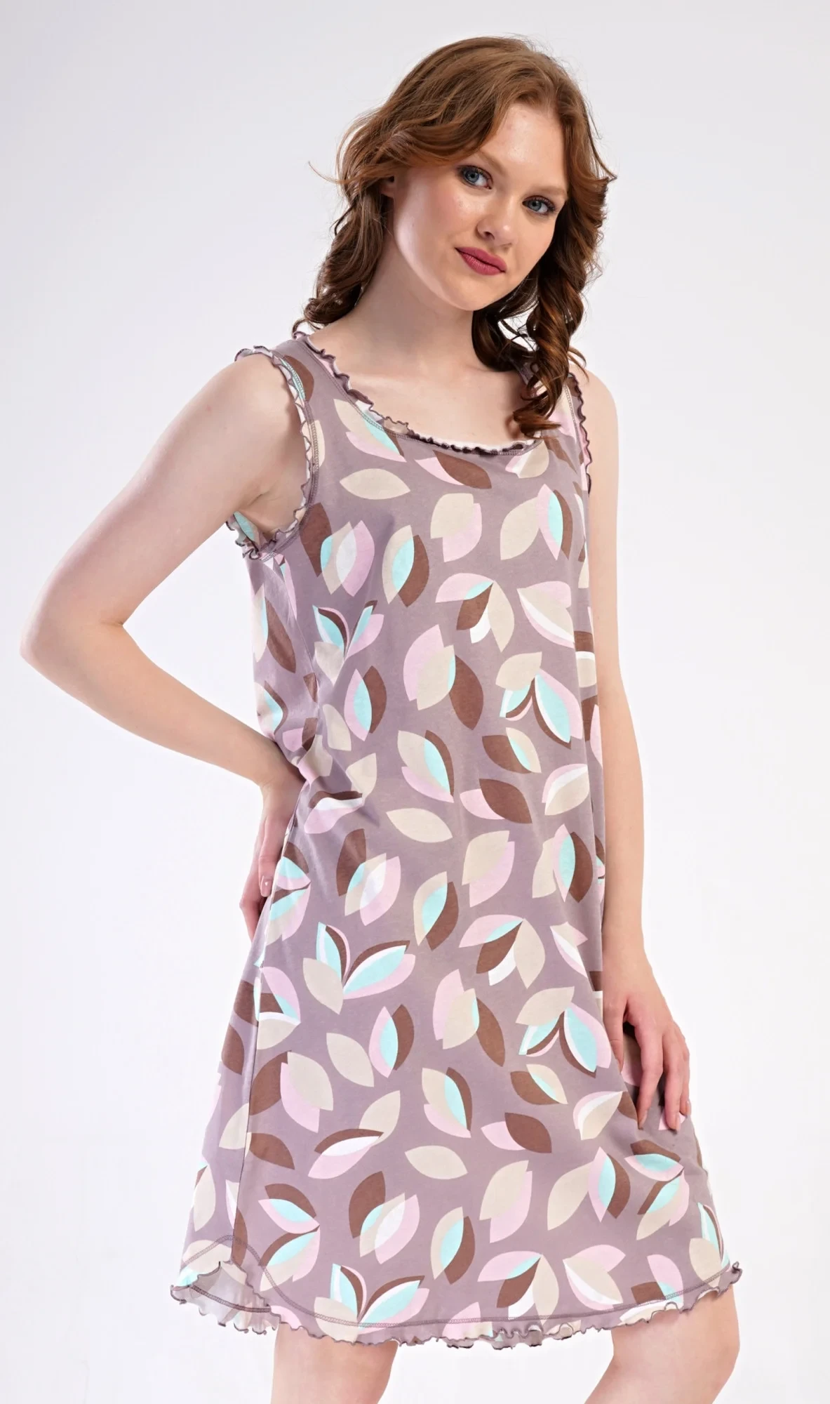 Dámská bavlněná noční košile na ramínka Klára. Noční košile se širšími ramínky a kulatým výstřihem je potištěna obrázky listů. Lem výstřihu, rukávů a spodní část košile jsou ozdobeny žlábkováním. Použitý materiál s obsahem bavlny 100% je příjemný a poddajný na dotek. Košile je vhodná i na denní nošení, obvzlášť 'na doma' v horkých letních dnech.