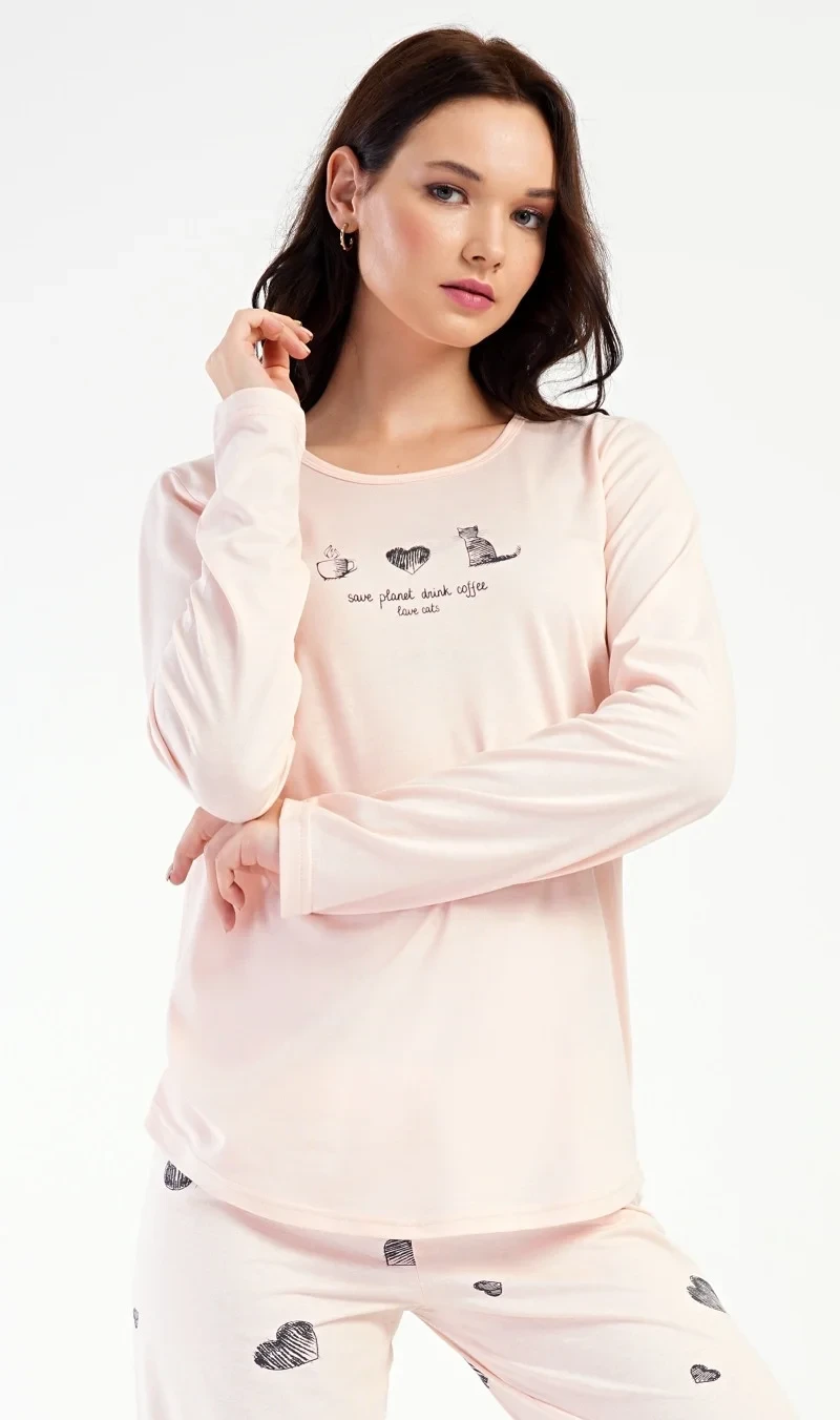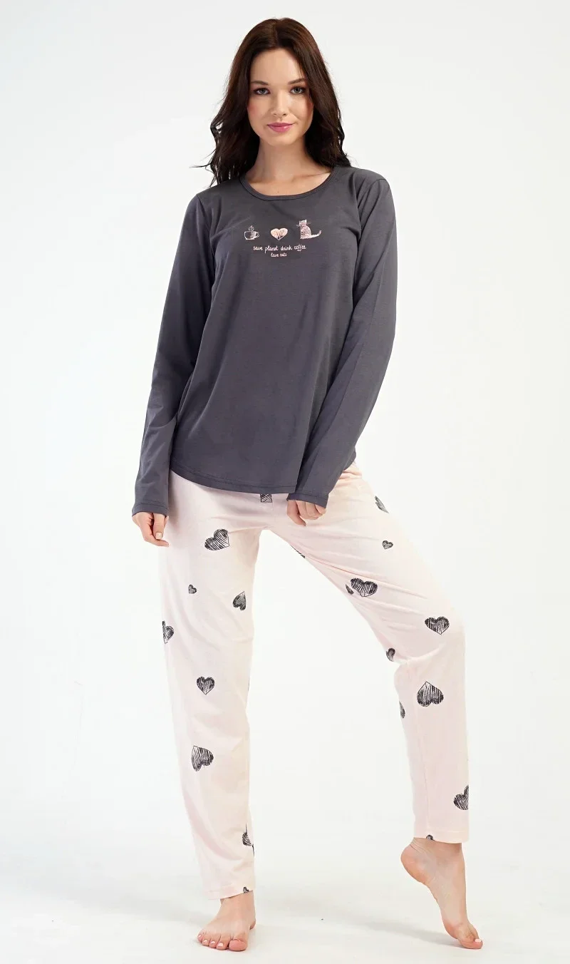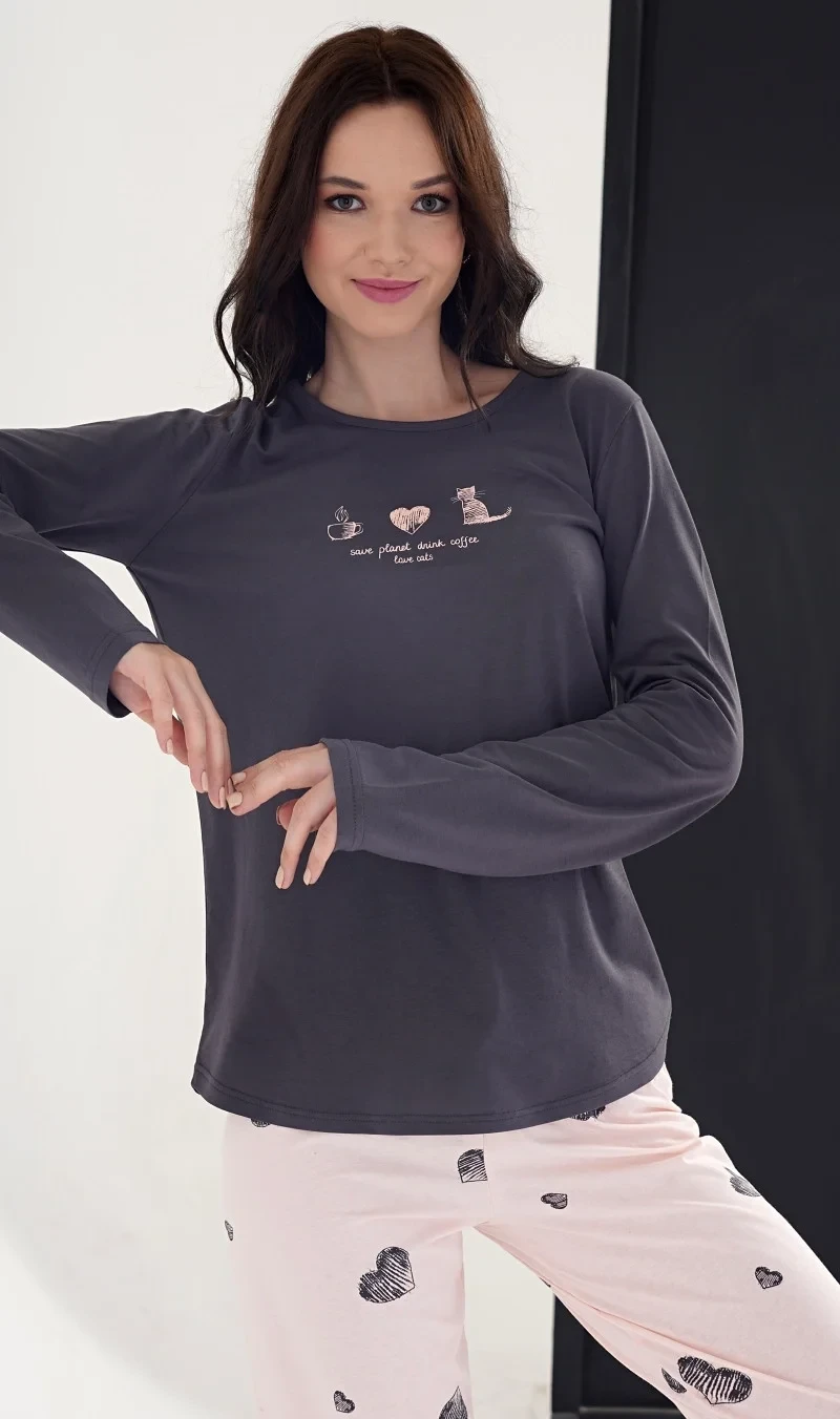 Dámské bavlněné dlouhé pyžamo Kočka. Dámské pyžamo se skládá z trika s dlouhým rukávem a dlouhých kalhot. Triko je jednobarevné, zdobené obrázkem šálku kávy, kočky a srdce. Potisk srdíček se opakuje i na kalhotách, které mají v pase gumu a šňůrku na stažení, nemají kapsy. Použitý bavlněný materiál je poddajný a příjemný na dotek.