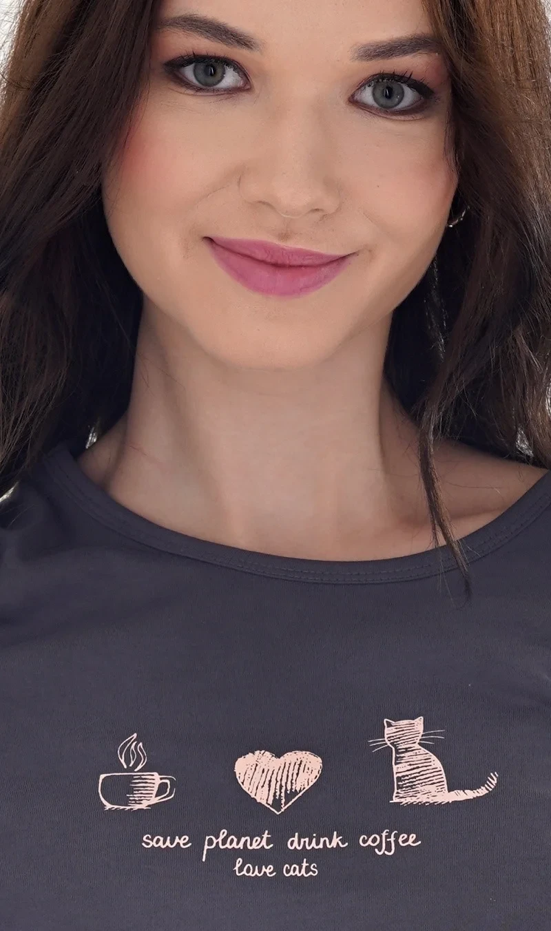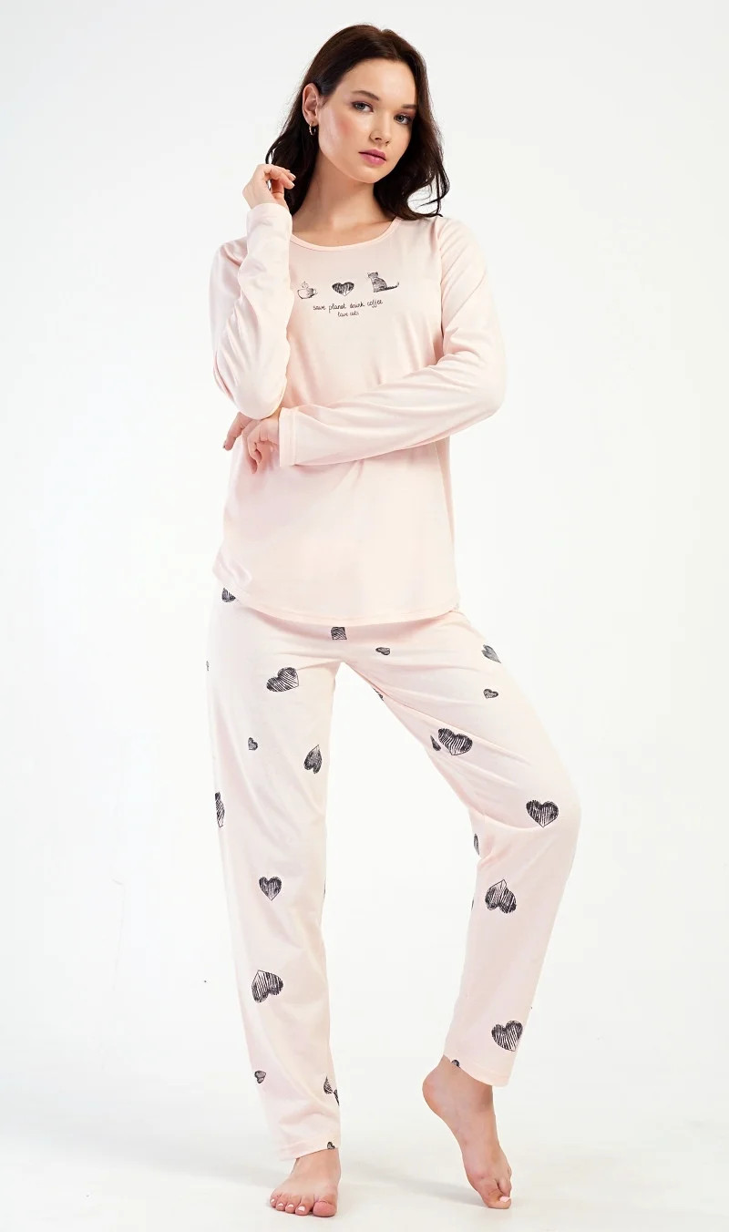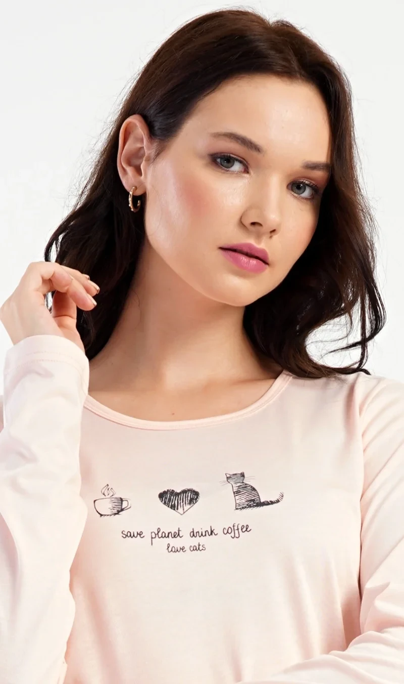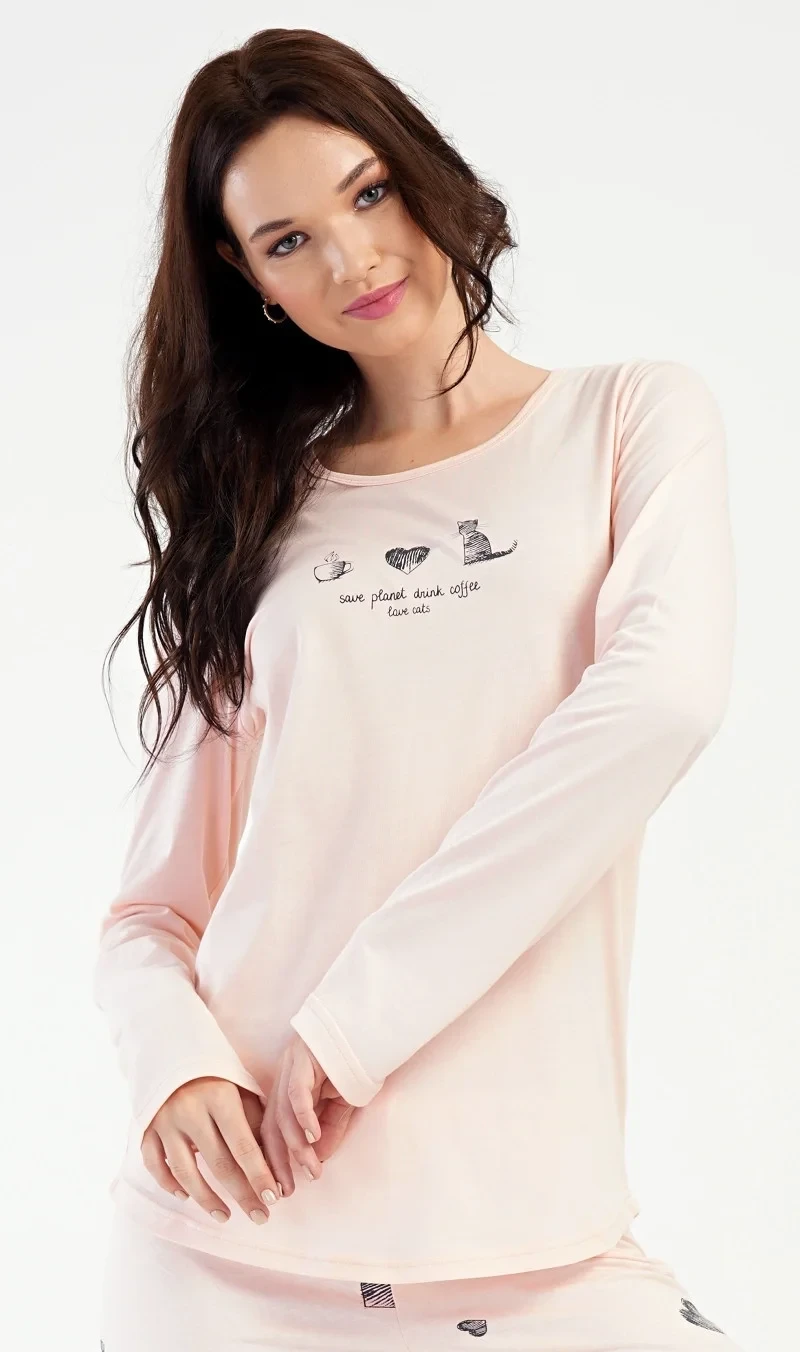 Dámské bavlněné dlouhé pyžamo Kočka. Dámské pyžamo se skládá z trika s dlouhým rukávem a dlouhých kalhot. Triko je jednobarevné, zdobené obrázkem šálku kávy, kočky a srdce. Potisk srdíček se opakuje i na kalhotách, které mají v pase gumu a šňůrku na stažení, nemají kapsy. Použitý bavlněný materiál je poddajný a příjemný na dotek.
