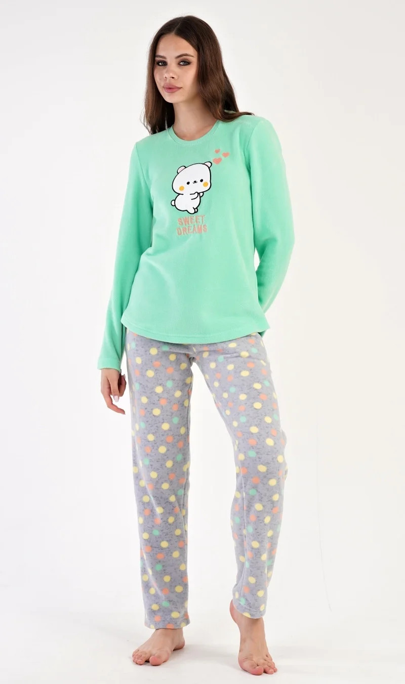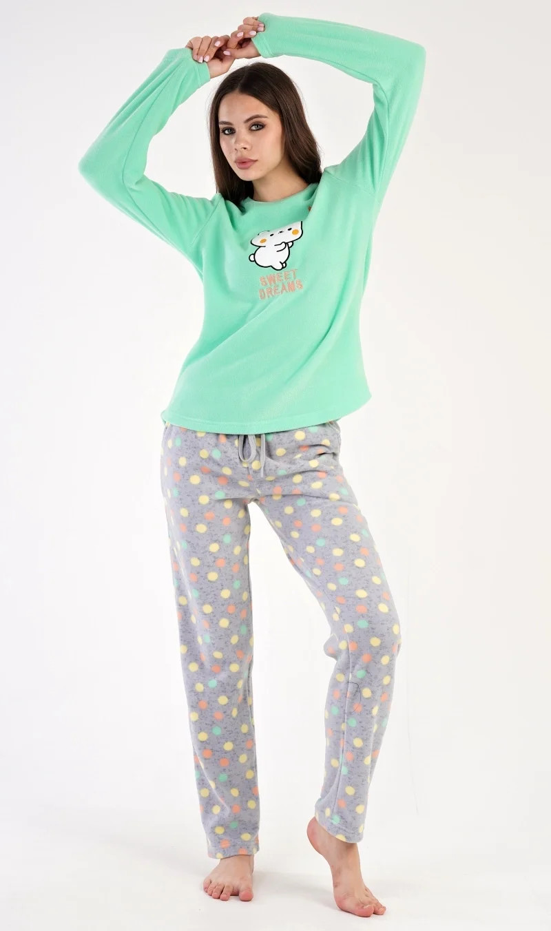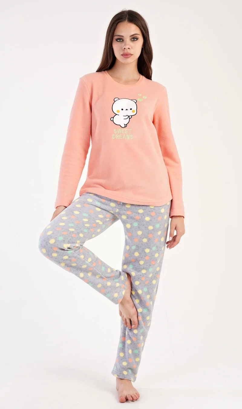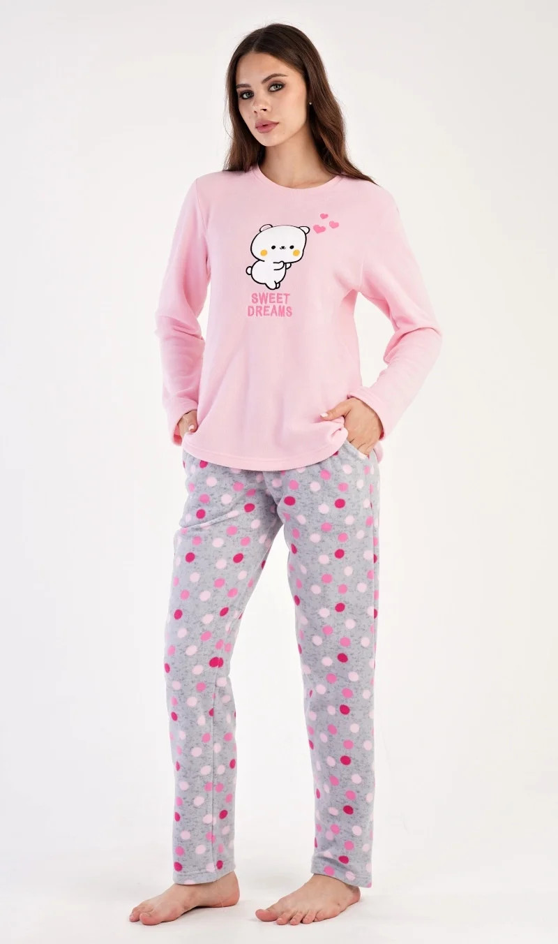 Dámské polarové dlouhé pyžamo Kotě. Dámské pyžamo se skládá z trika s dlouhým rukávem a dlouhých kalhot. Triko je ozdobené aplikací - obrázkem koťátka a nápisem SWEET DREAMS. Polarový materiál je hřejivý a hebký na dotek. Vzorované kalhoty jsou do gumy, mají šňůrku na stažení a praktické kapsy, také jsou vyrobeny z polaru. Toto pyžamko je díky hřejivosti vhodné i jako domácí oblečení pro chladné dny.