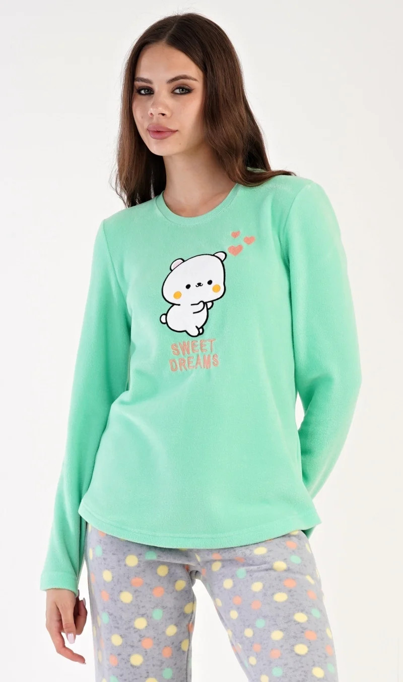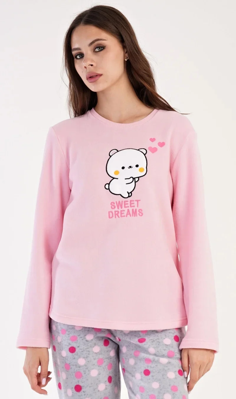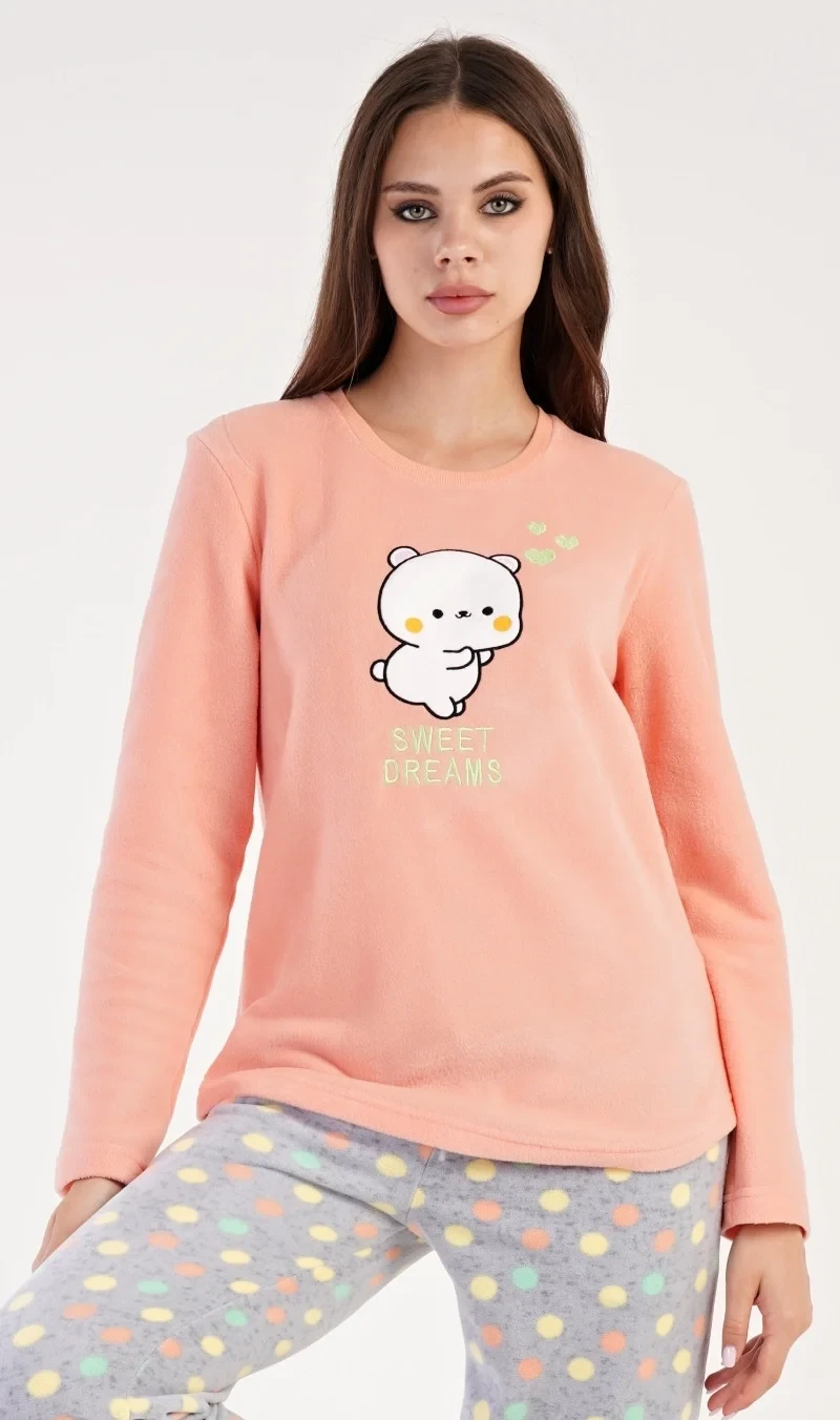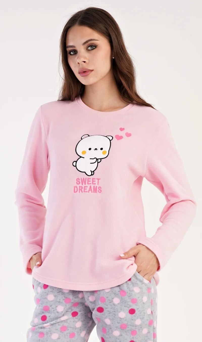 Dámské polarové dlouhé pyžamo Kotě. Dámské pyžamo se skládá z trika s dlouhým rukávem a dlouhých kalhot. Triko je ozdobené aplikací - obrázkem koťátka a nápisem SWEET DREAMS. Polarový materiál je hřejivý a hebký na dotek. Vzorované kalhoty jsou do gumy, mají šňůrku na stažení a praktické kapsy, také jsou vyrobeny z polaru. Toto pyžamko je díky hřejivosti vhodné i jako domácí oblečení pro chladné dny.