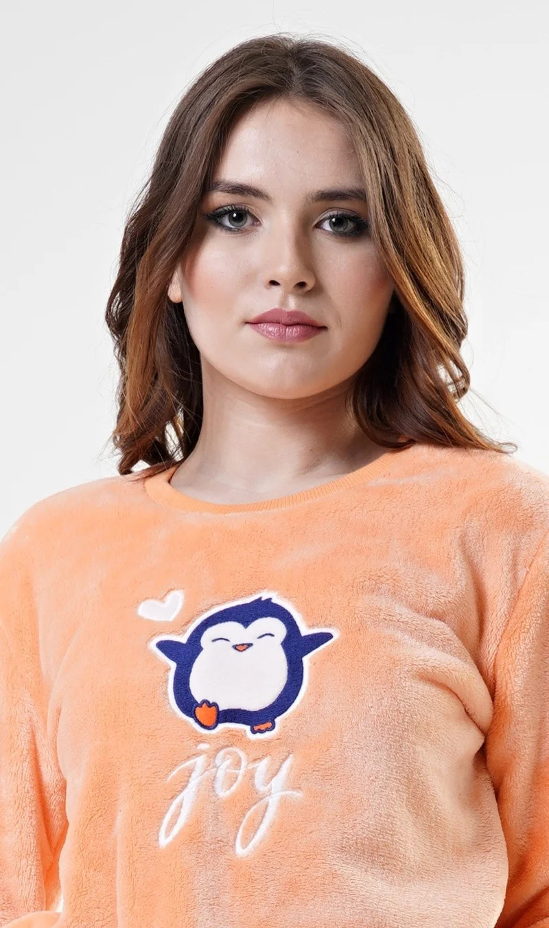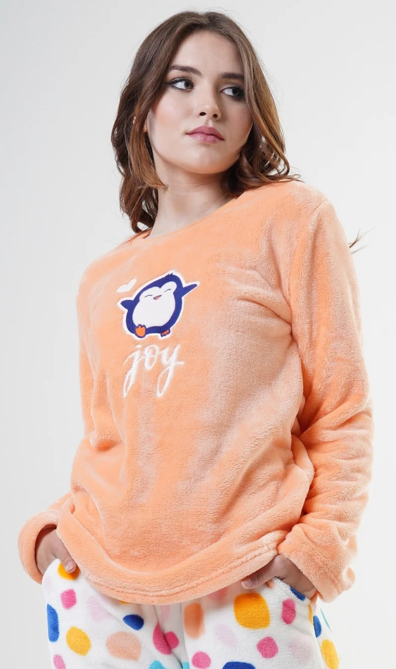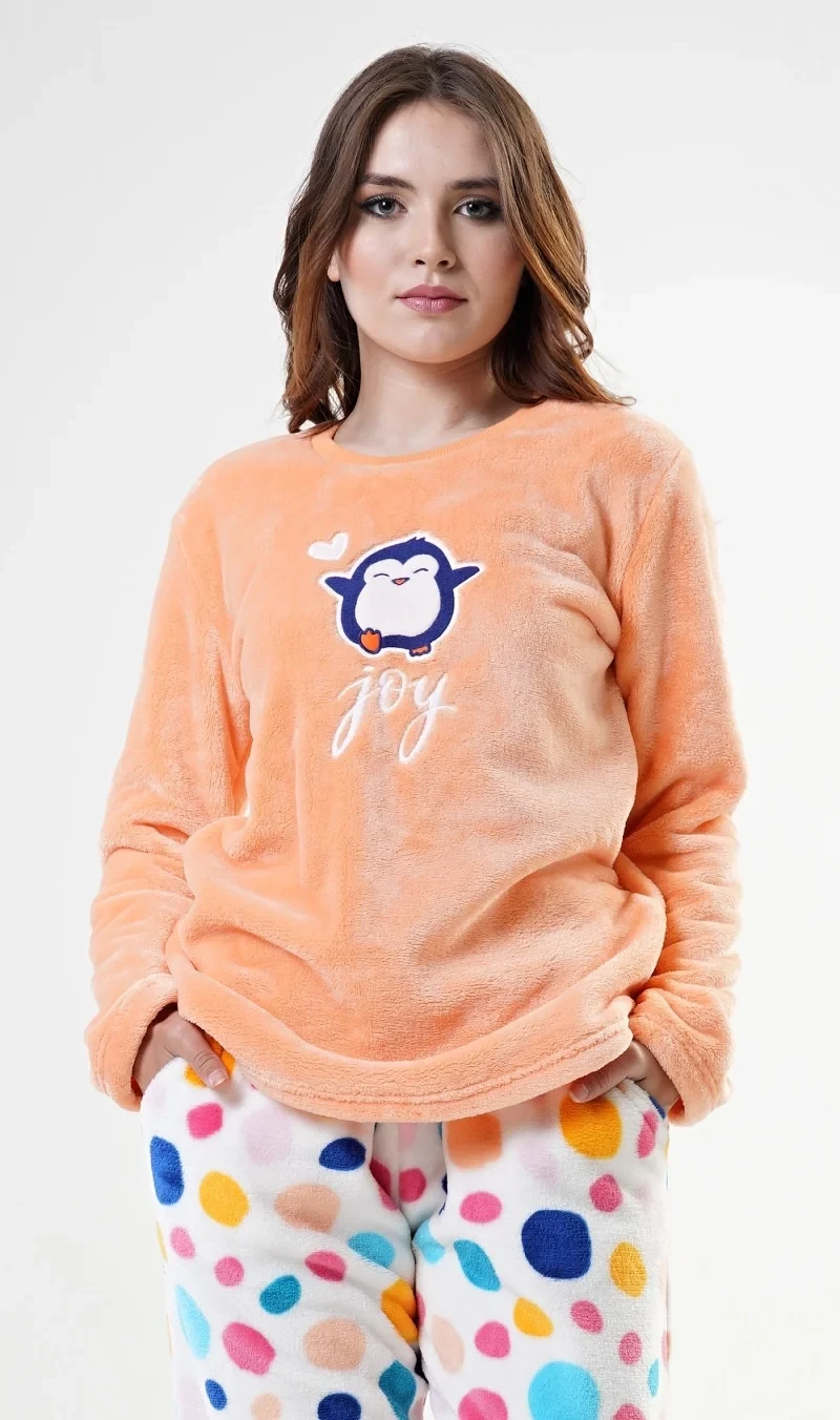 Dámské pyžamo dlouhé softové Kuličky. Dámské pyžamo se skládá z trika s dlouhým rukávem a dlouhých kalhot. Triko je ozdobené aplikací - obrázkem malého tučňáka a nápisem JOY. Softový materiál je hřejivý a hebký na dotek. Kalhoty jsou zdobené pestrobarevnými kuličkami. Kalhoty jsou do gumy, na stažení šňůrkou a mají kapsy, také jsou vyrobeny ze softu.