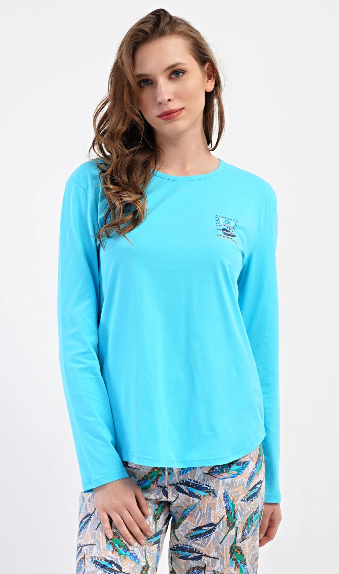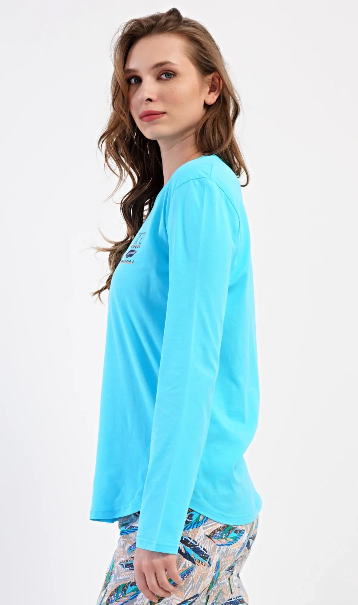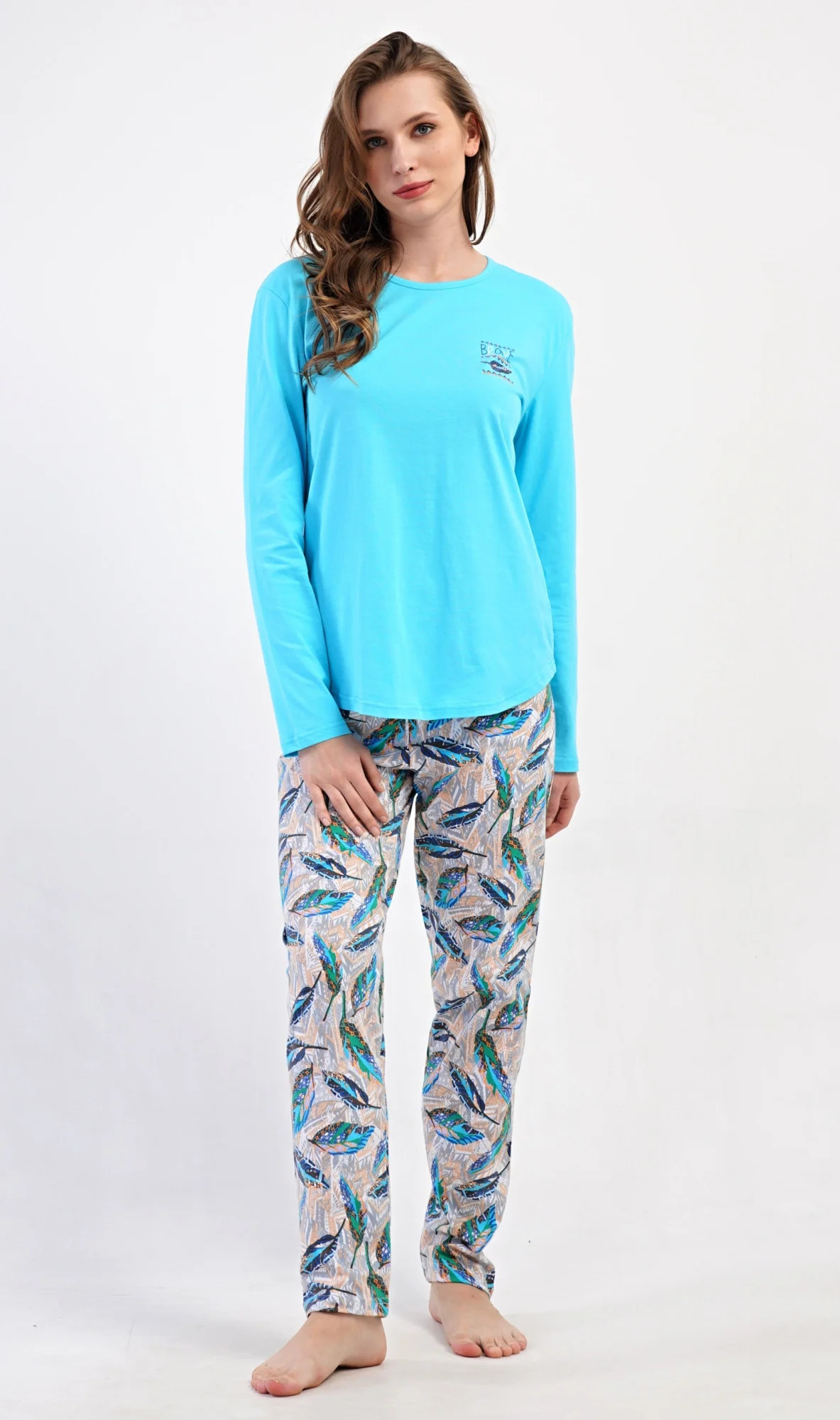 Dámské bavlněné dlouhé pyžamo Listy. Dámské pyžamo se skládá z trika s dlouhým rukávem a dlouhých kalhot. Triko je jednobarevné, zdobené na hrudi drobným obrázkem listu. Motiv listů se opakuje i na kalhotách, které mají v pase gumu a šňůrku na stažení, nemají kapsy. Použitý bavlněný materiál je poddajný a příjemný na dotek.