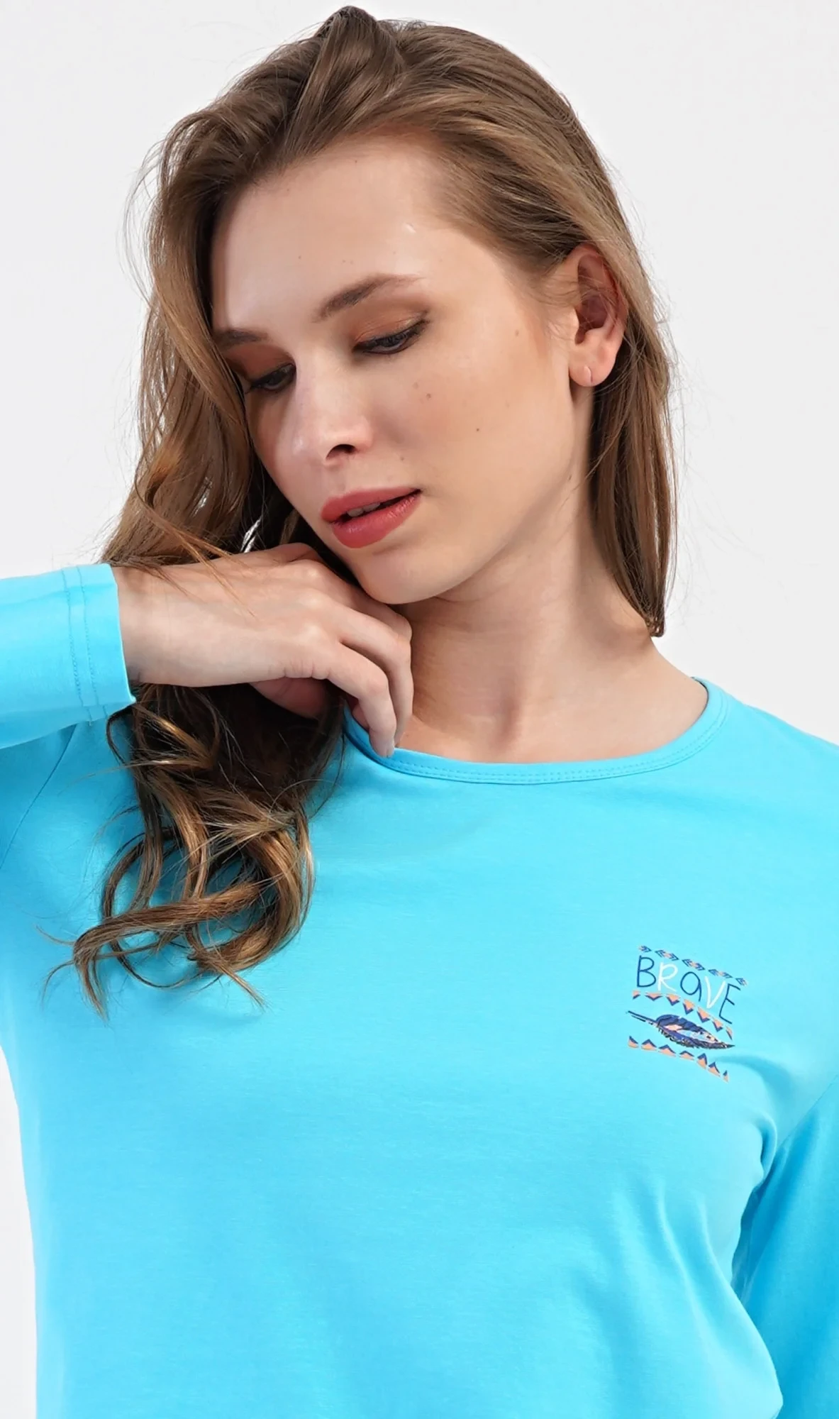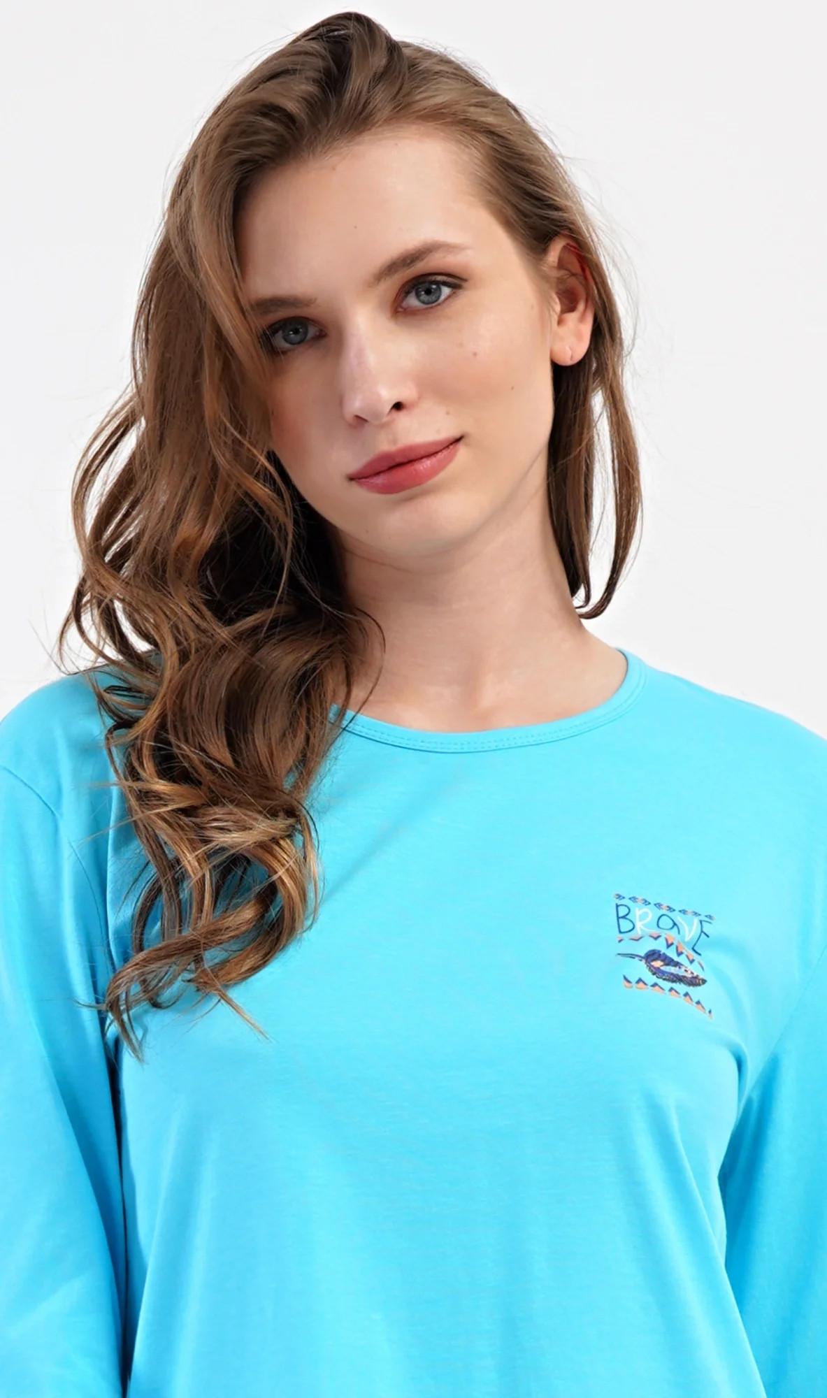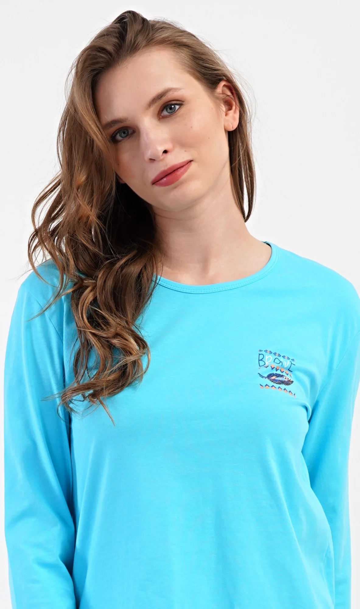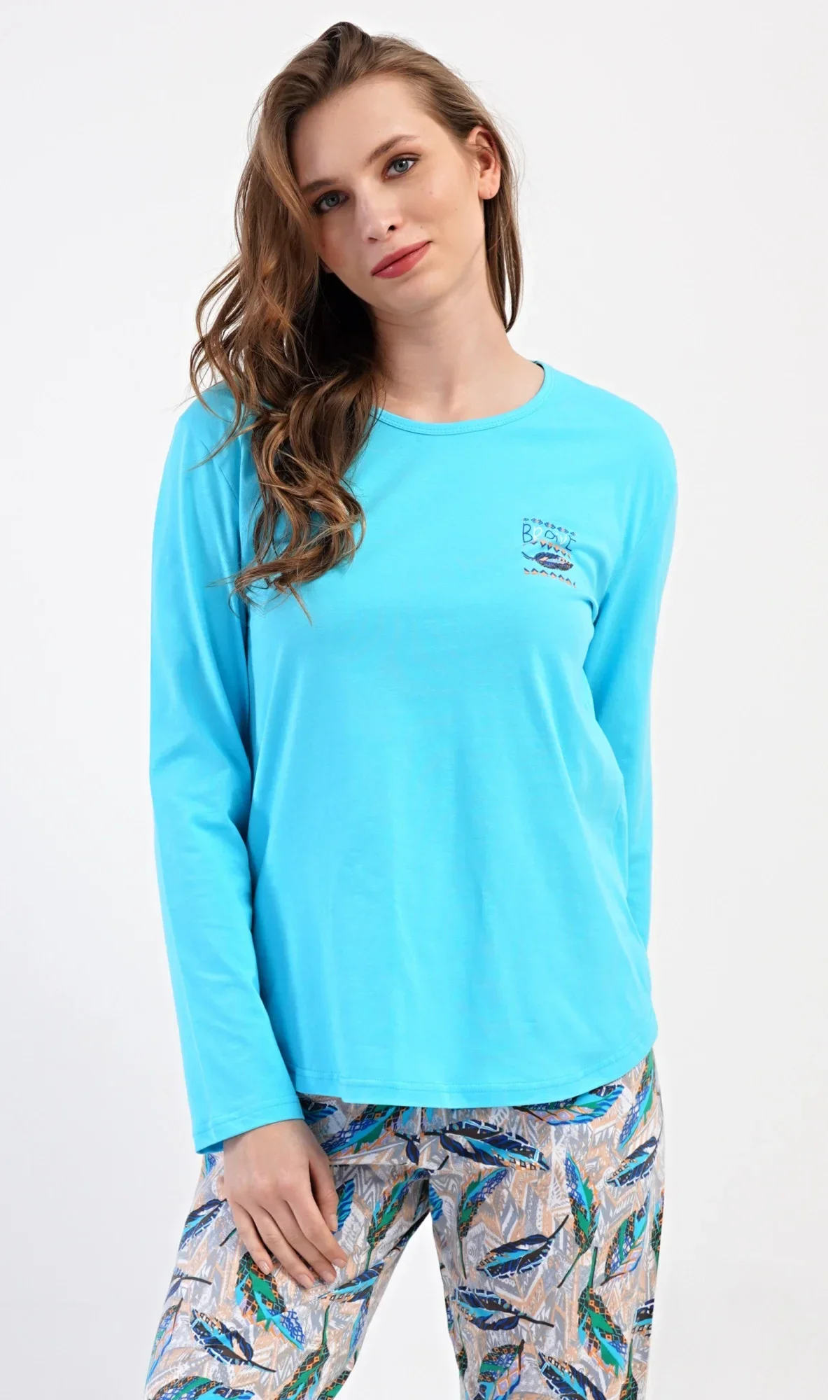 Dámské bavlněné dlouhé pyžamo Listy. Dámské pyžamo se skládá z trika s dlouhým rukávem a dlouhých kalhot. Triko je jednobarevné, zdobené na hrudi drobným obrázkem listu. Motiv listů se opakuje i na kalhotách, které mají v pase gumu a šňůrku na stažení, nemají kapsy. Použitý bavlněný materiál je poddajný a příjemný na dotek.