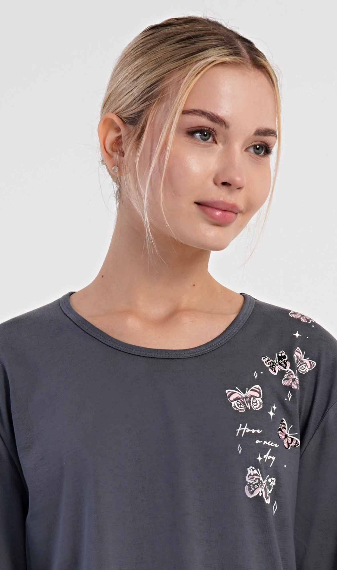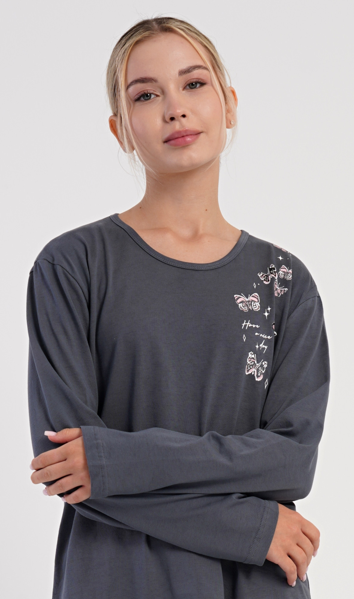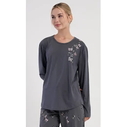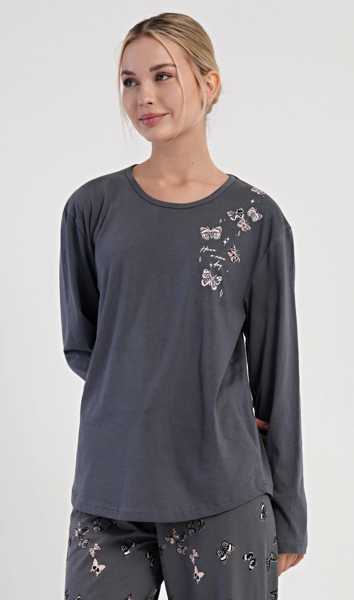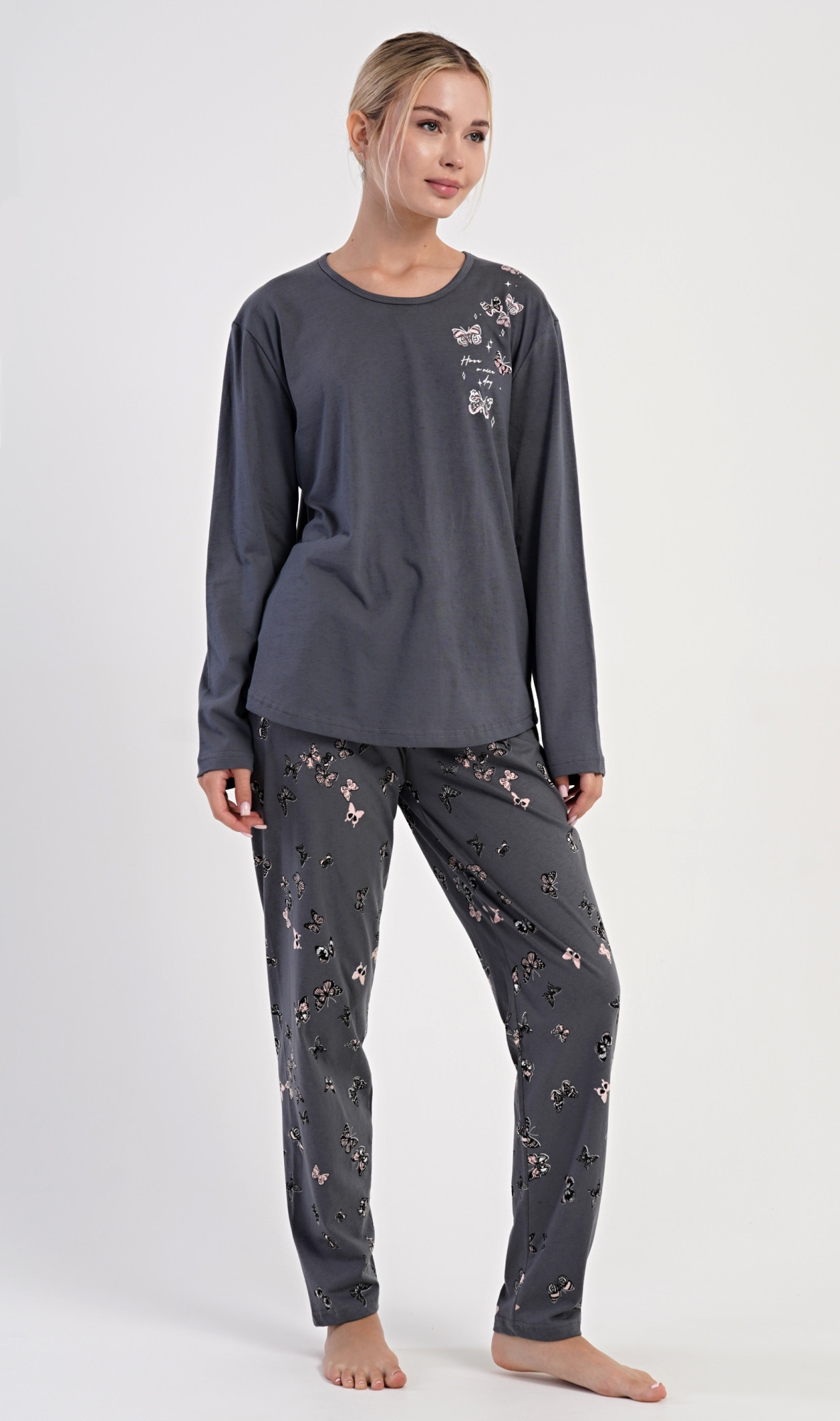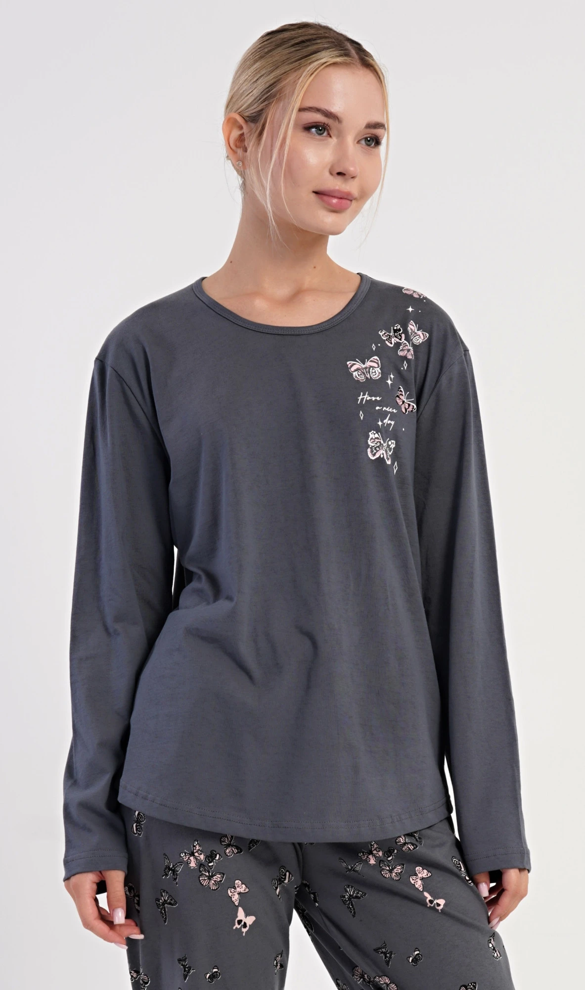 Dámské bavlněné dlouhé pyžamo Lucia. Dámské pyžamo se skládá z trika s dlouhým rukávem a dlouhých kalhot. Jednobarevné triko je na hrudi zdobeno obrázky motýlů. Tento motiv se opakuje i na kalhotách, které mají v pase gumu a šňůrku na stažení, nemají kapsy. Použitý bavlněný materiál je poddajný a příjemný na dotek.