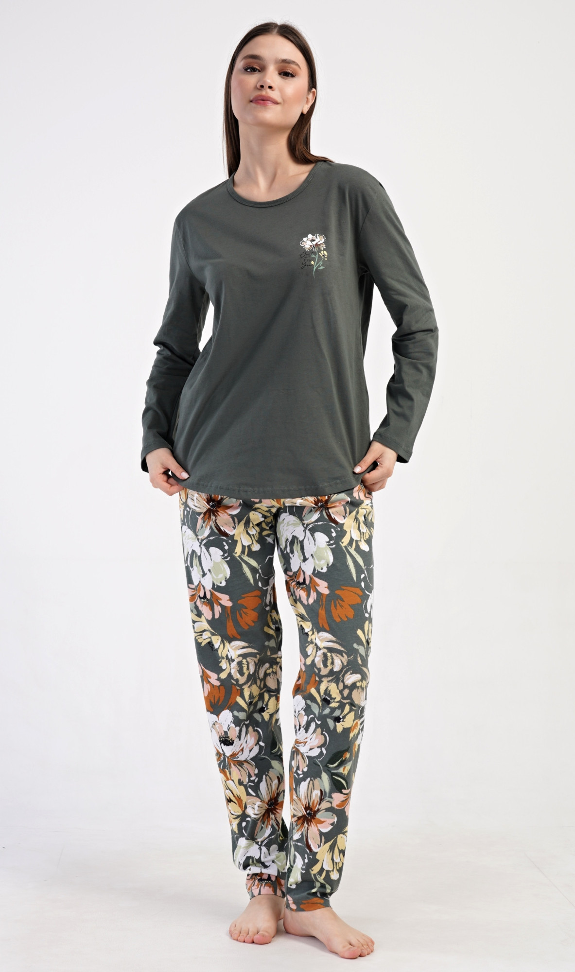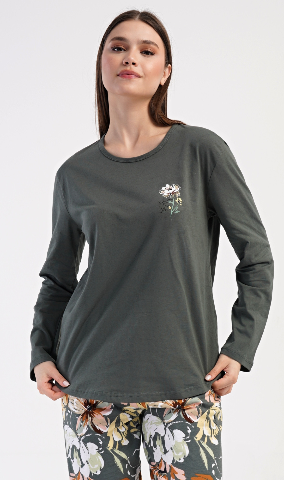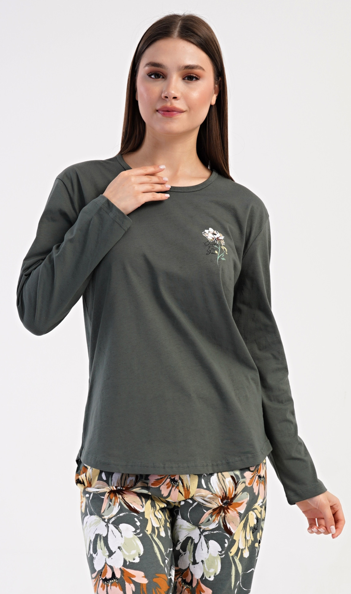 Dámské bavlněné dlouhé pyžamo Mariana. Dámské pyžamo se skládá z trika s dlouhým rukávem a dlouhých kalhot. Jednobarevné triko je ozdobeno obrázkem květiny. Tento motiv se opakuje i na kalhotách, které mají v pase gumu a šňůrku na stažení, nemají kapsy. Použitý bavlněný materiál je poddajný a příjemný na dotek.